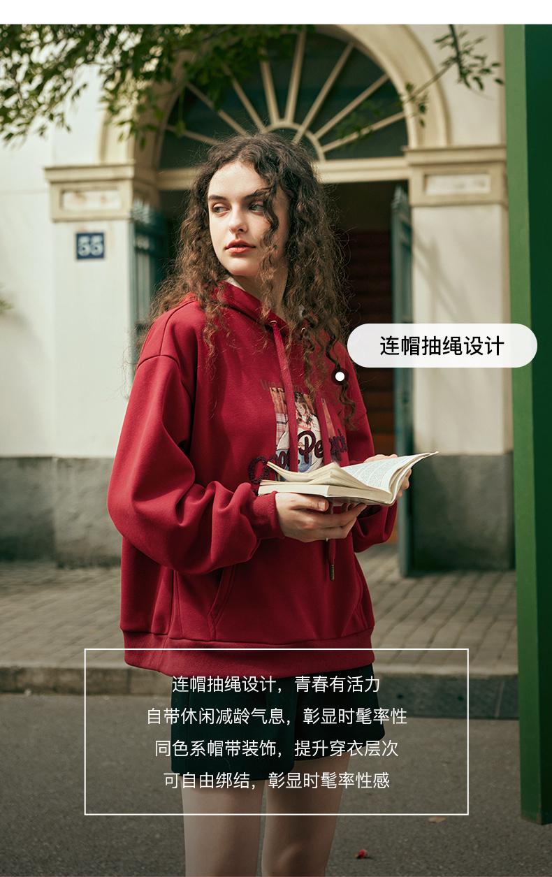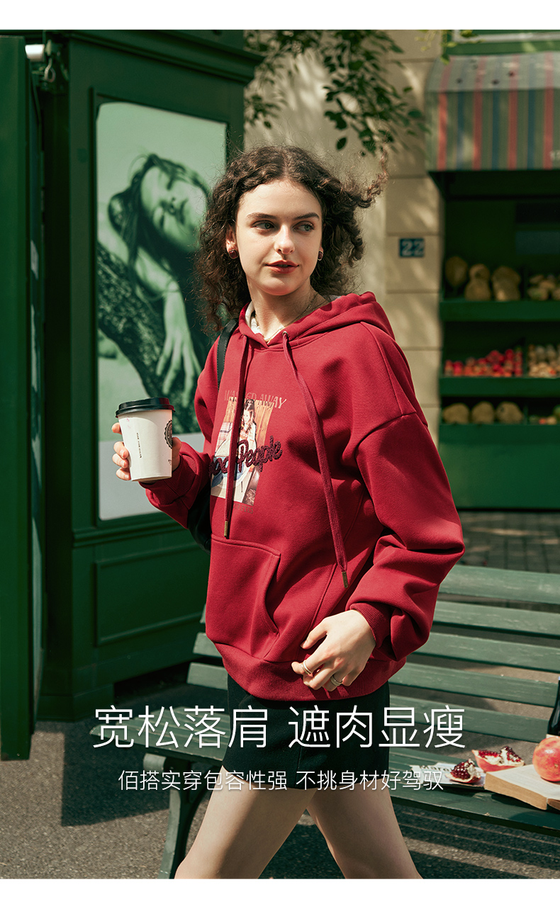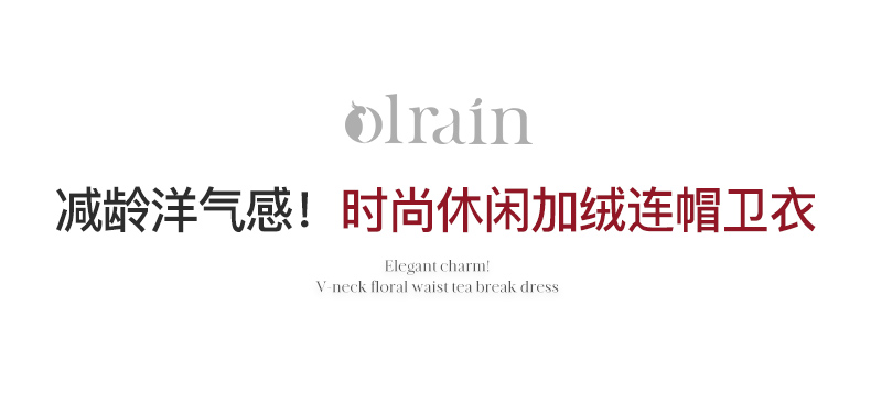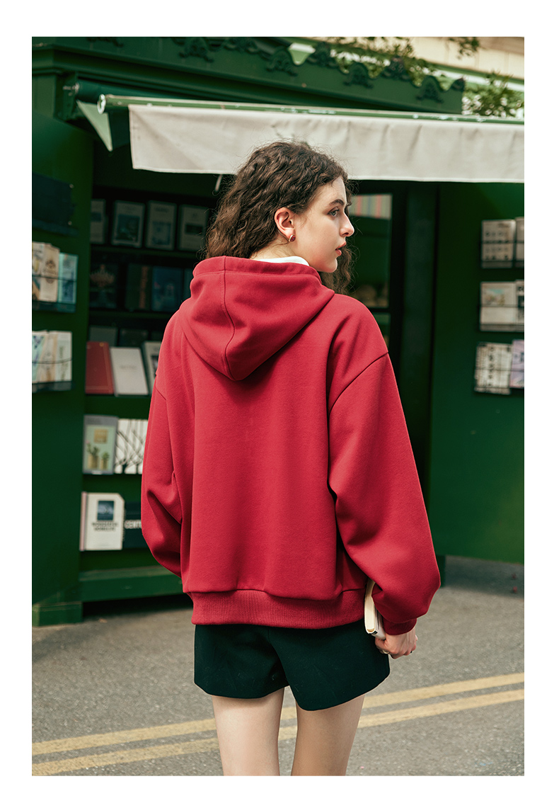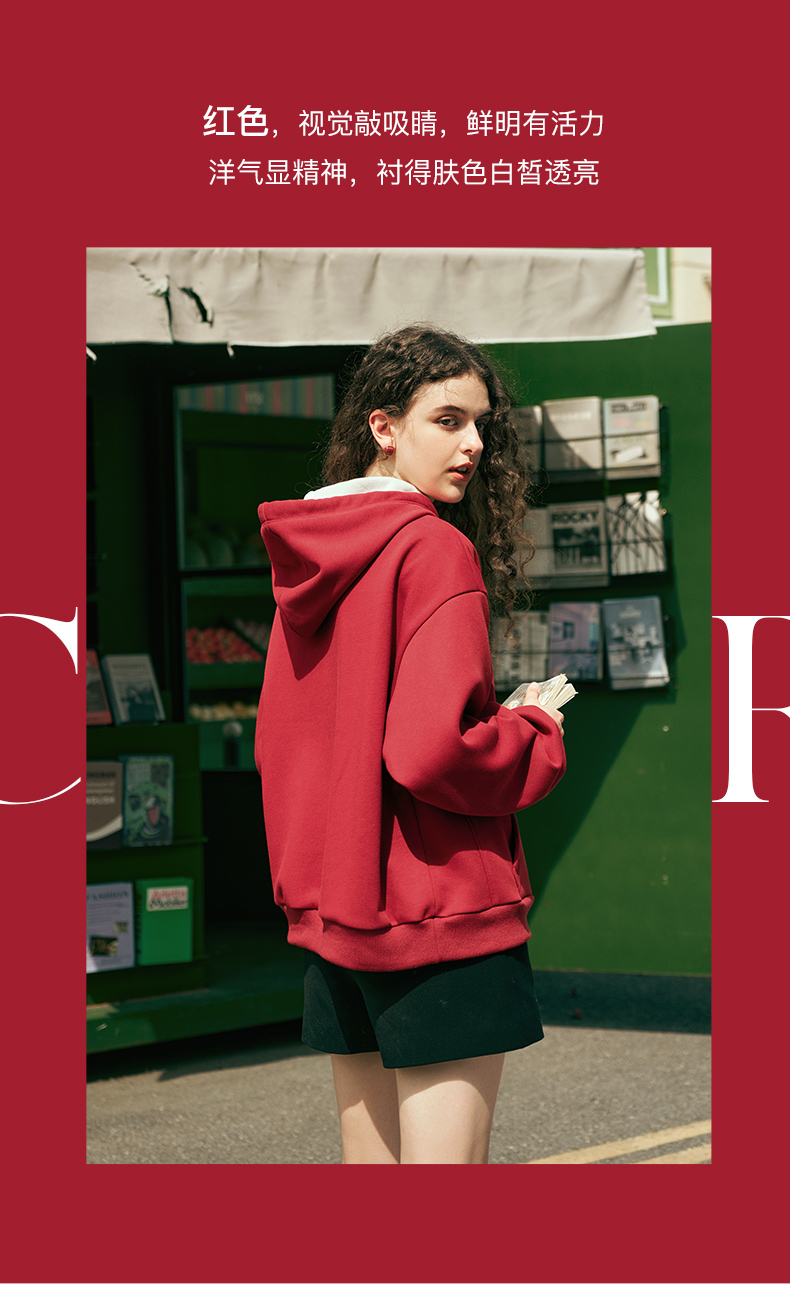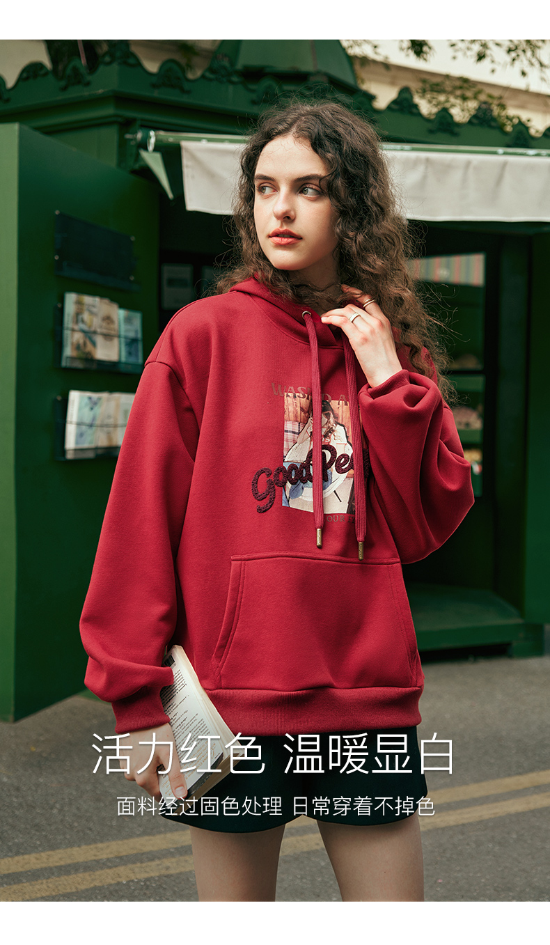 OLrain欧芮儿红色连帽宽松卫衣女春2025年新款时尚休闲加绒上衣