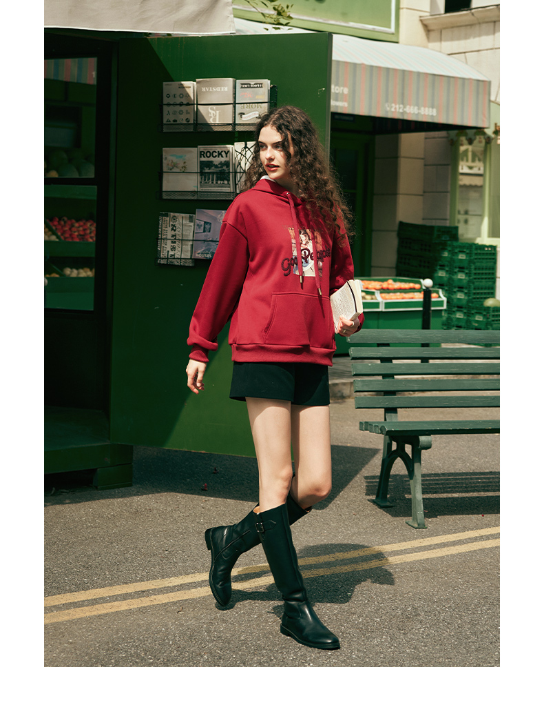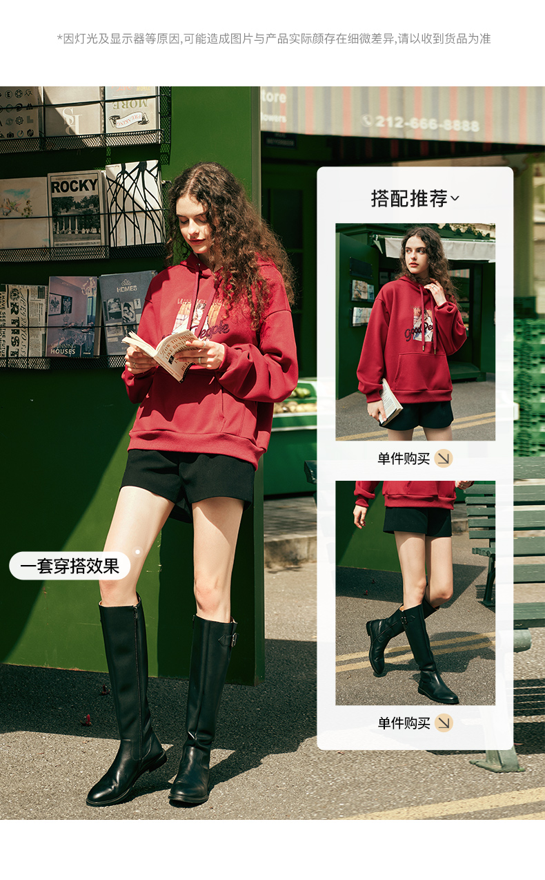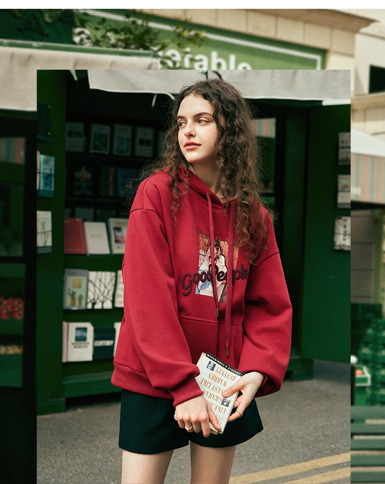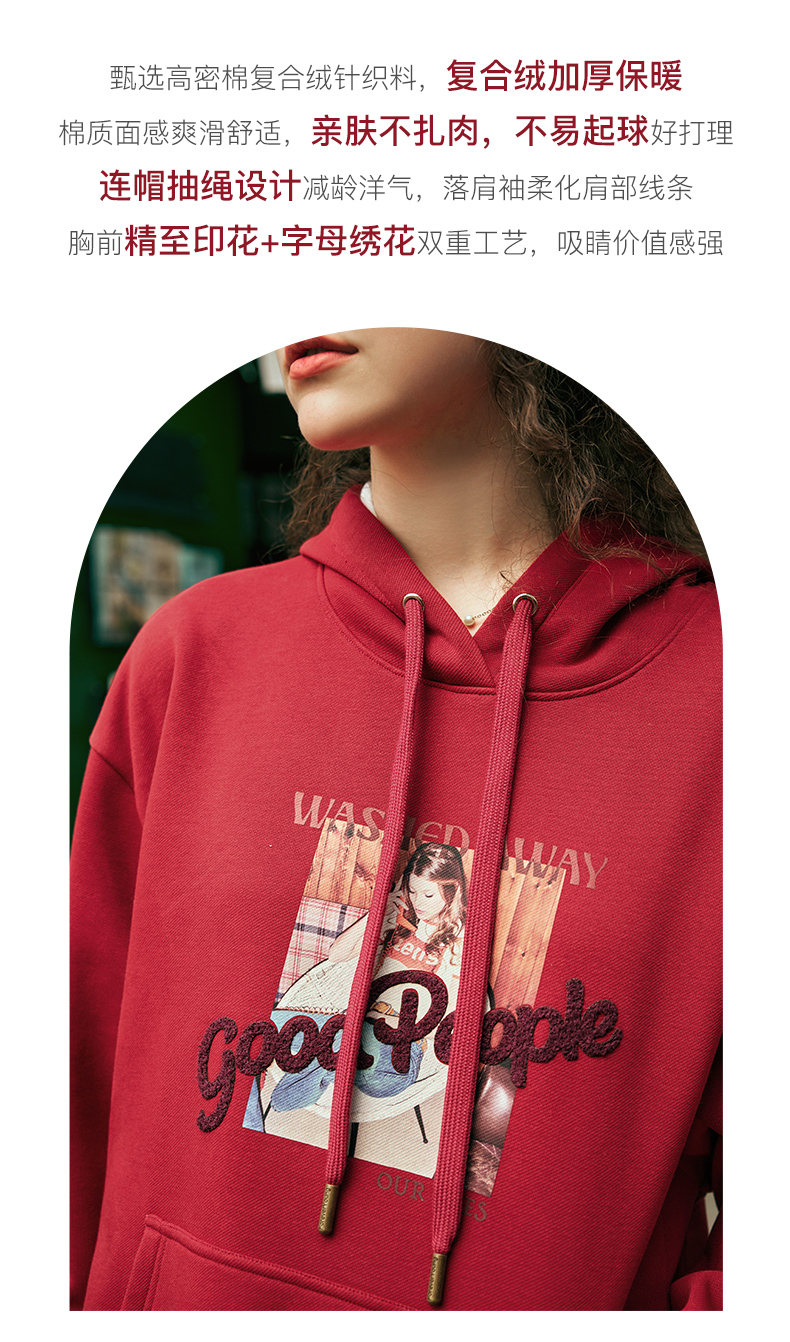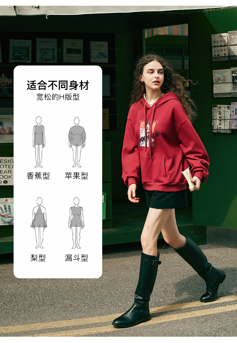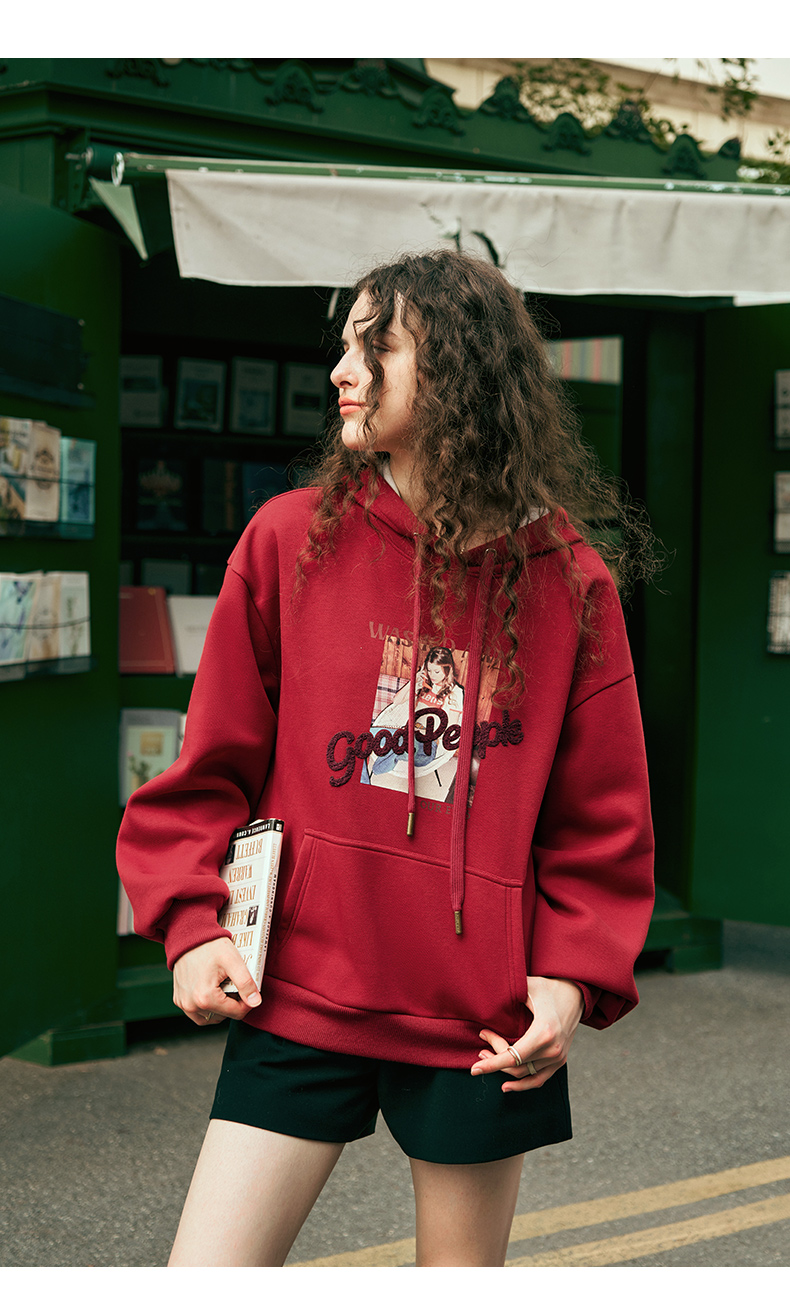 OLrain欧芮儿红色连帽宽松卫衣女春2025年新款时尚休闲加绒上衣