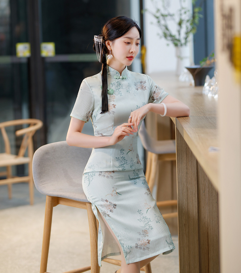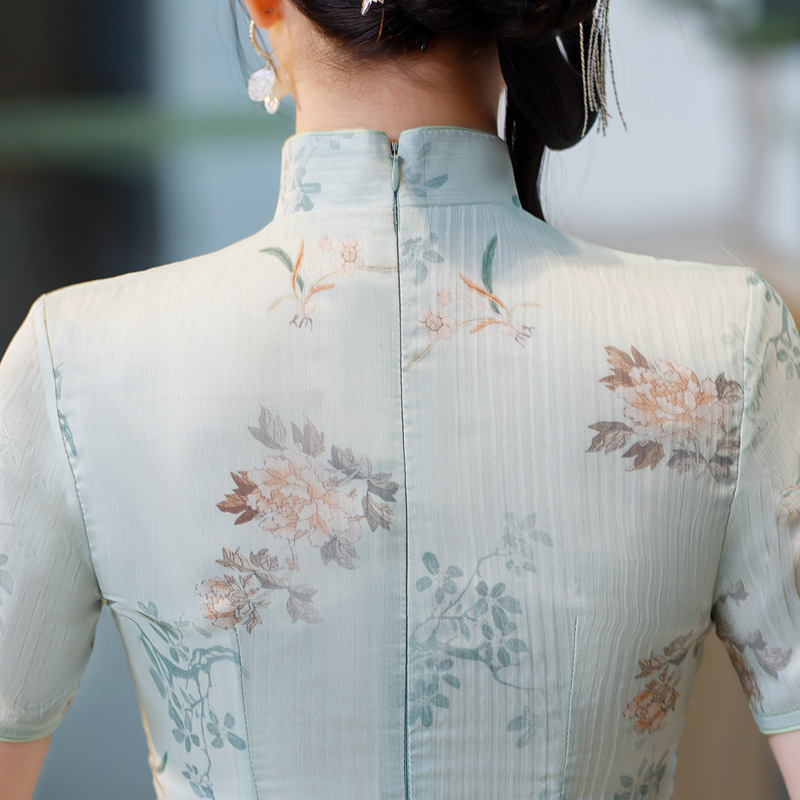 日常时尚,改良年轻款旗袍春夏旗袍立领短袖气质中长提花旗袍ZA-104