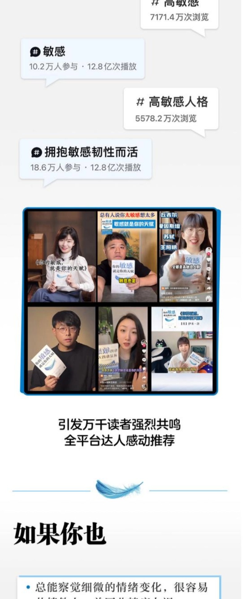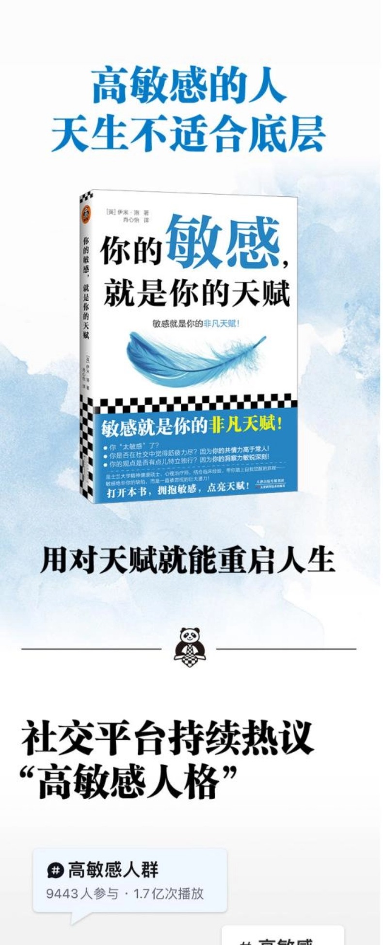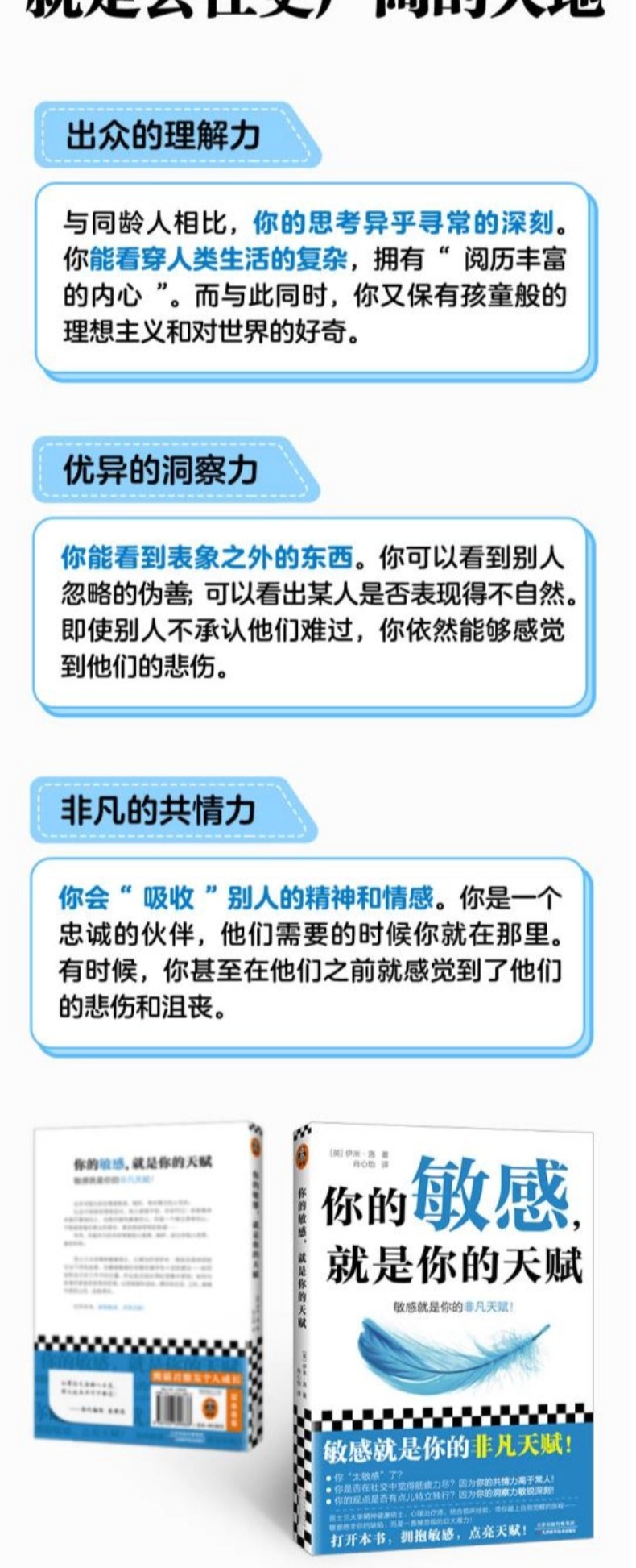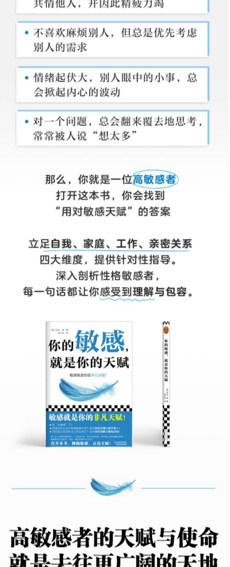 这本书是为那些情绪敏感、强烈,有共情力的人写的。社交中细微的情绪变化,他人感受不到,你却可以;你是集体中揭开真相的人,也是识破伪善者的人;你是一个独立思考的人,不能接受毫无意义的指令,更会挑战专制的权威……