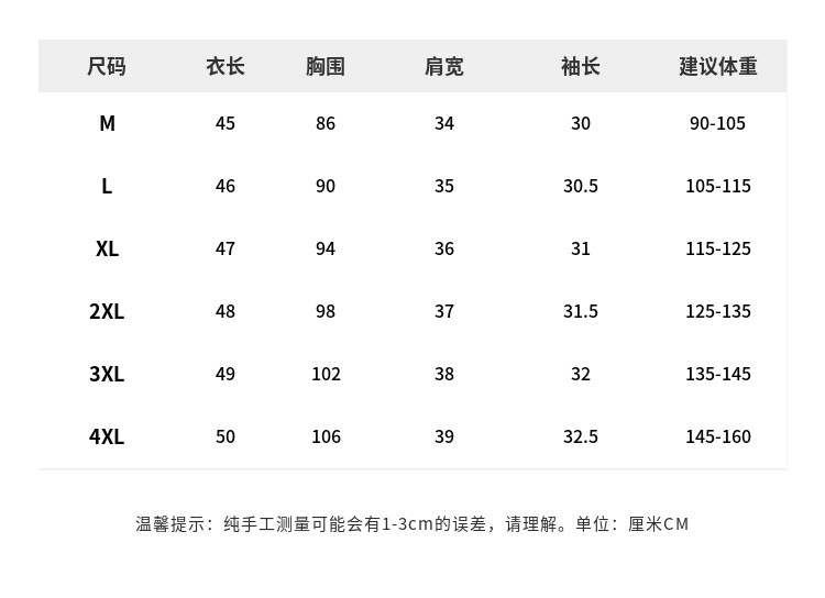 因裁剪工艺和丈量手法不同,可能存在1~3CM 左右误差,尺码仅供参考,以实物为准