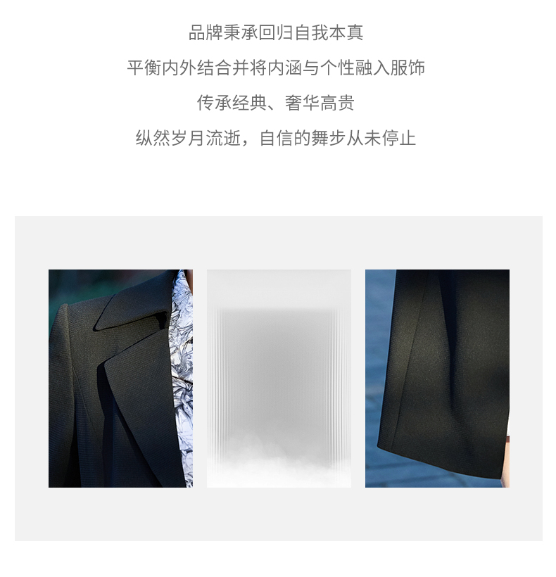 成熟、稳重、高贵典雅、大方得体 融合东方文化的含蓄和法国的浪漫 将创意的艺术性与消费需求相结合 为自信女性塑造高品质场合服装