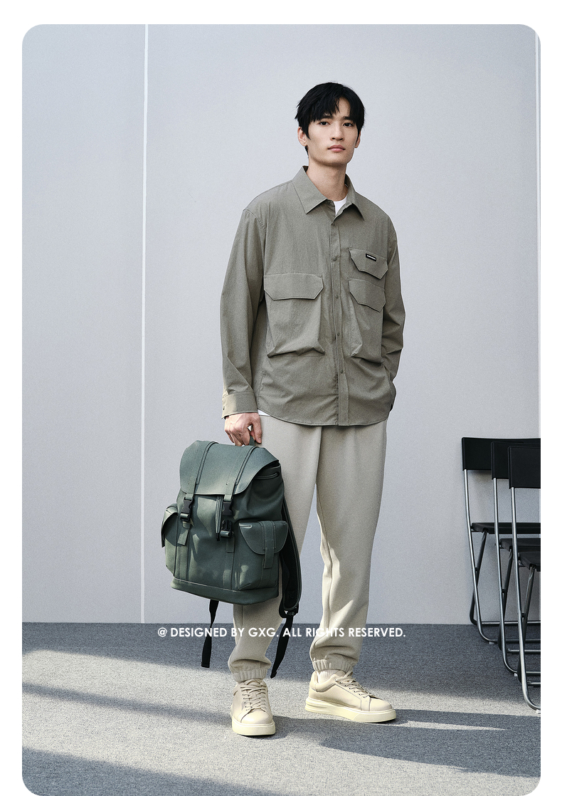 GXG男装 灰绿休闲翻领长袖衬衫 24年春季热卖GFX10301641