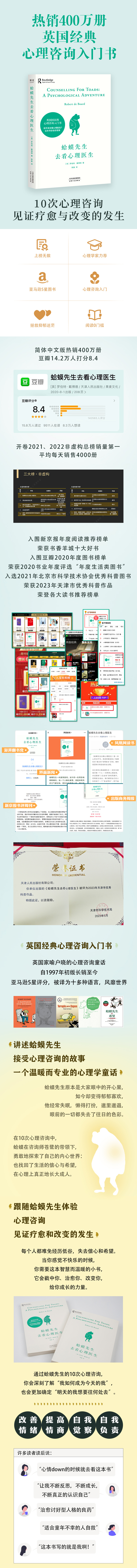 在这本书里,作者借由蛤蟆和心理咨询师苍鹭的互动,探索了蛤蟆自卑、软弱、爱炫耀的个性与抑郁的情绪究竟来源于何处,让读者看到童年经历的深刻影响,以及如何才能在心理上真正长大成人,独立、自信、充满希望地生活。