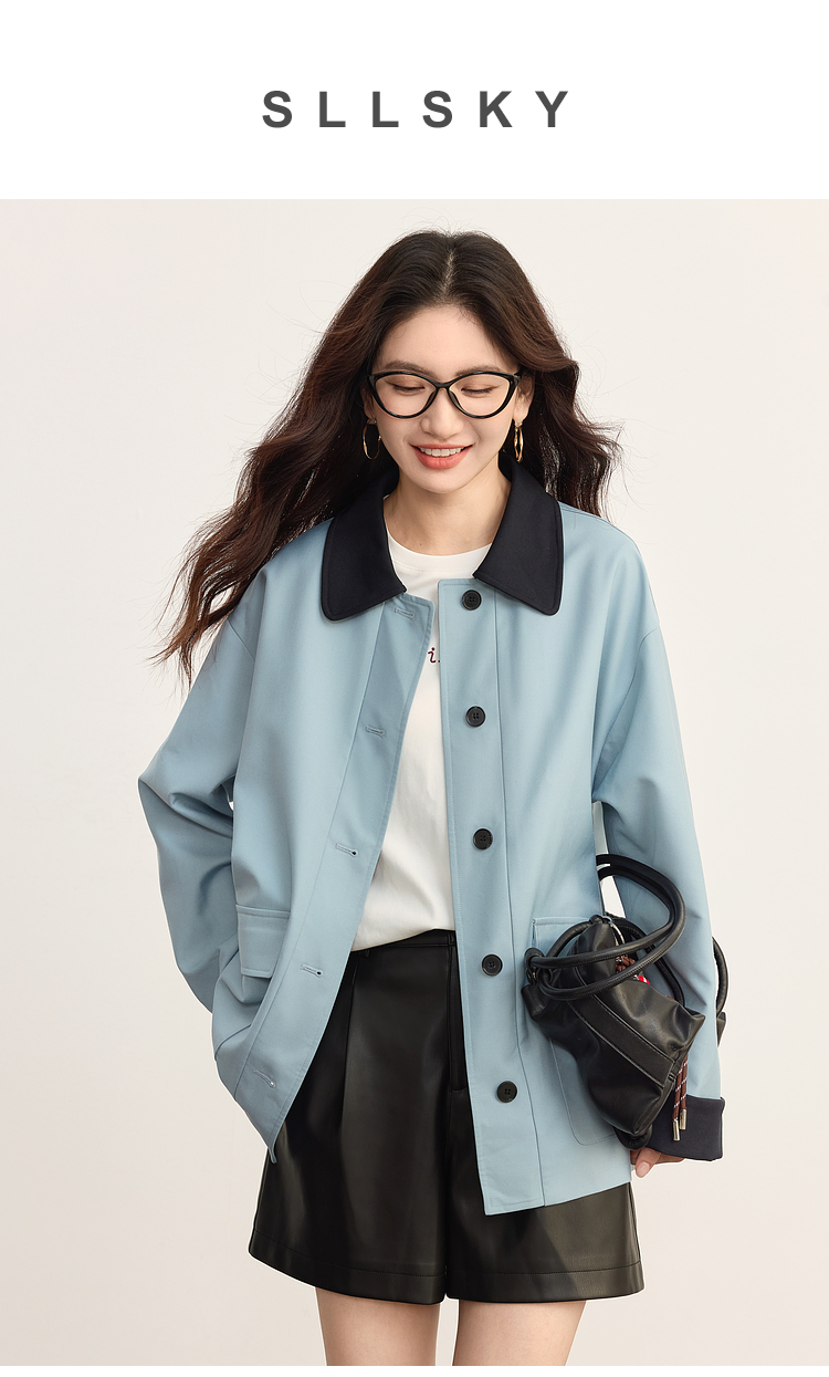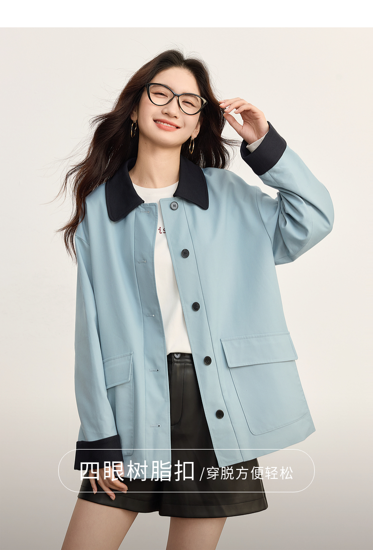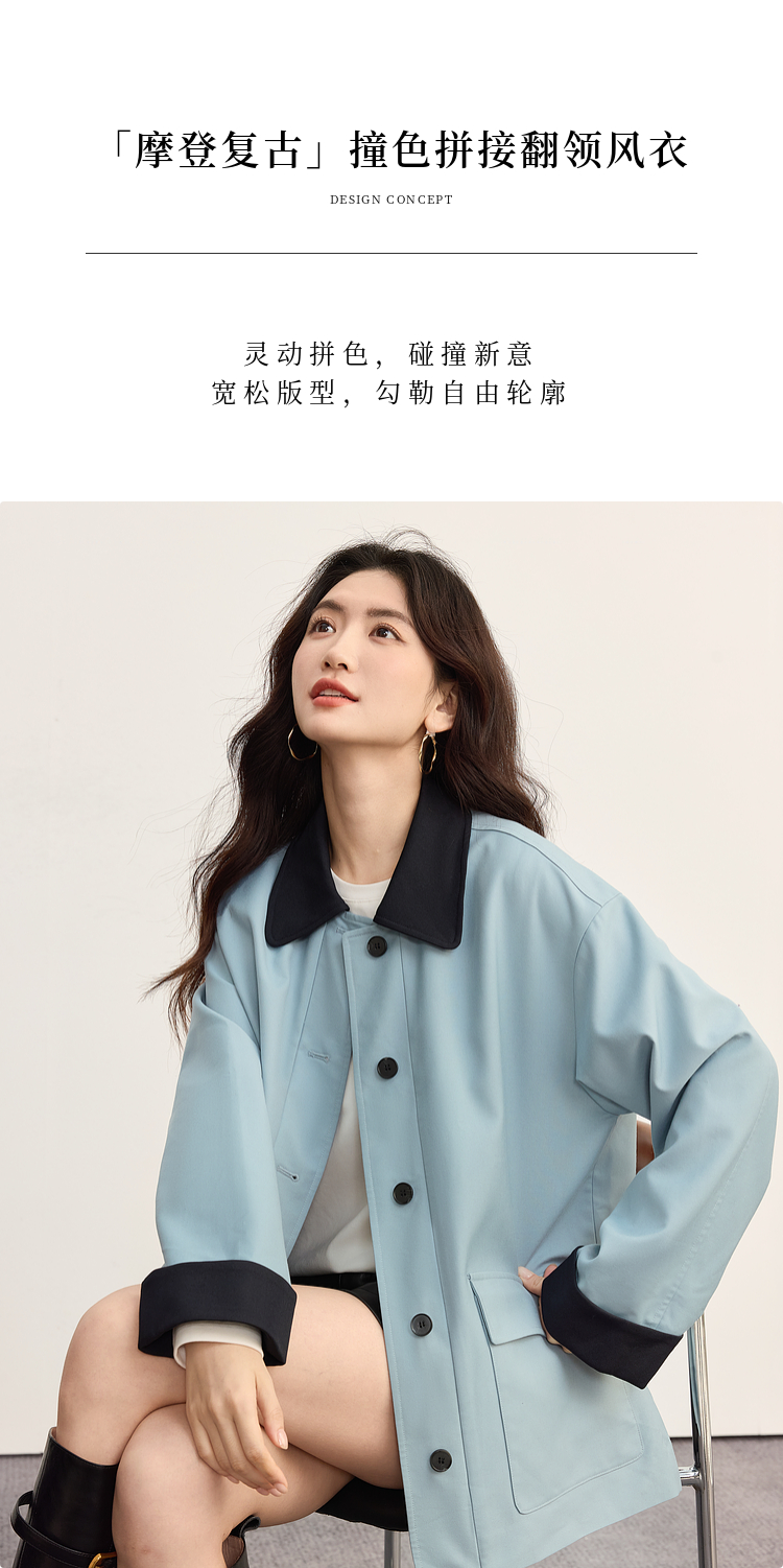 【09/10新品】熙世界风衣外套女小个子2025秋季新款工装风中长款撞色翻领上衣