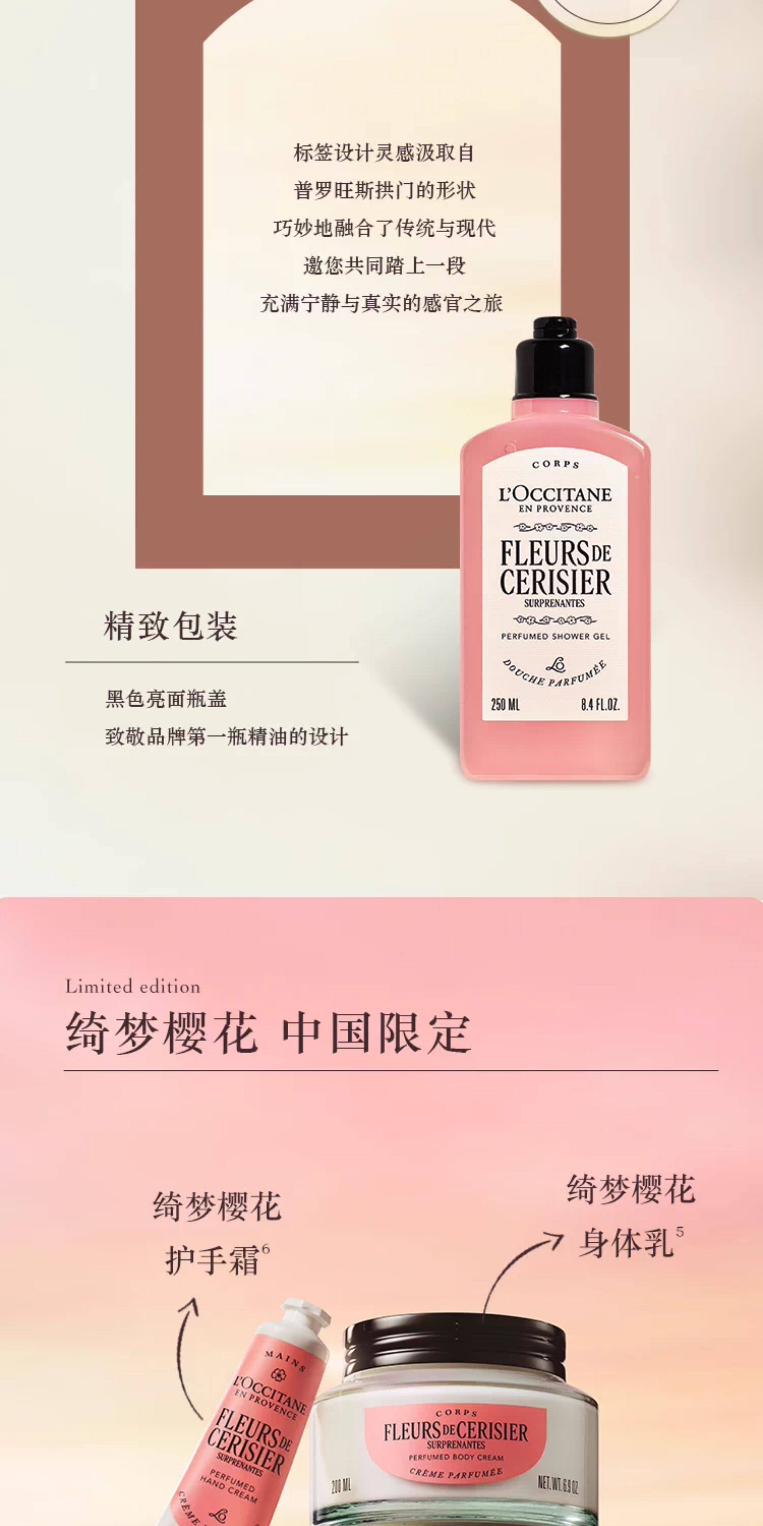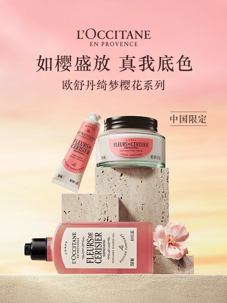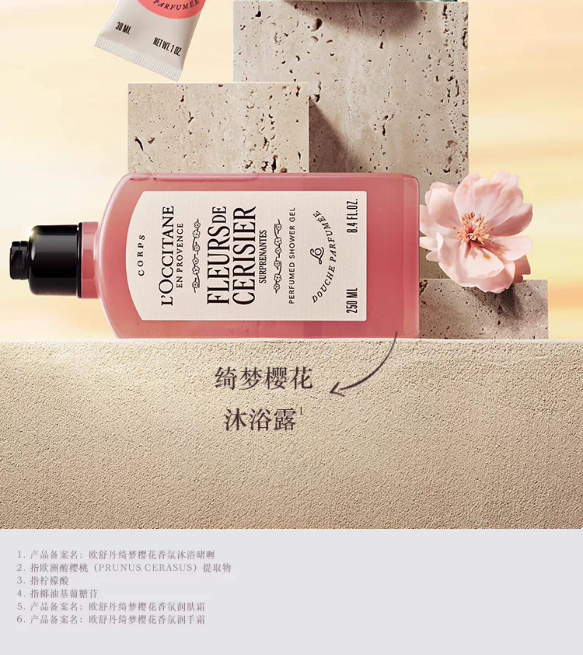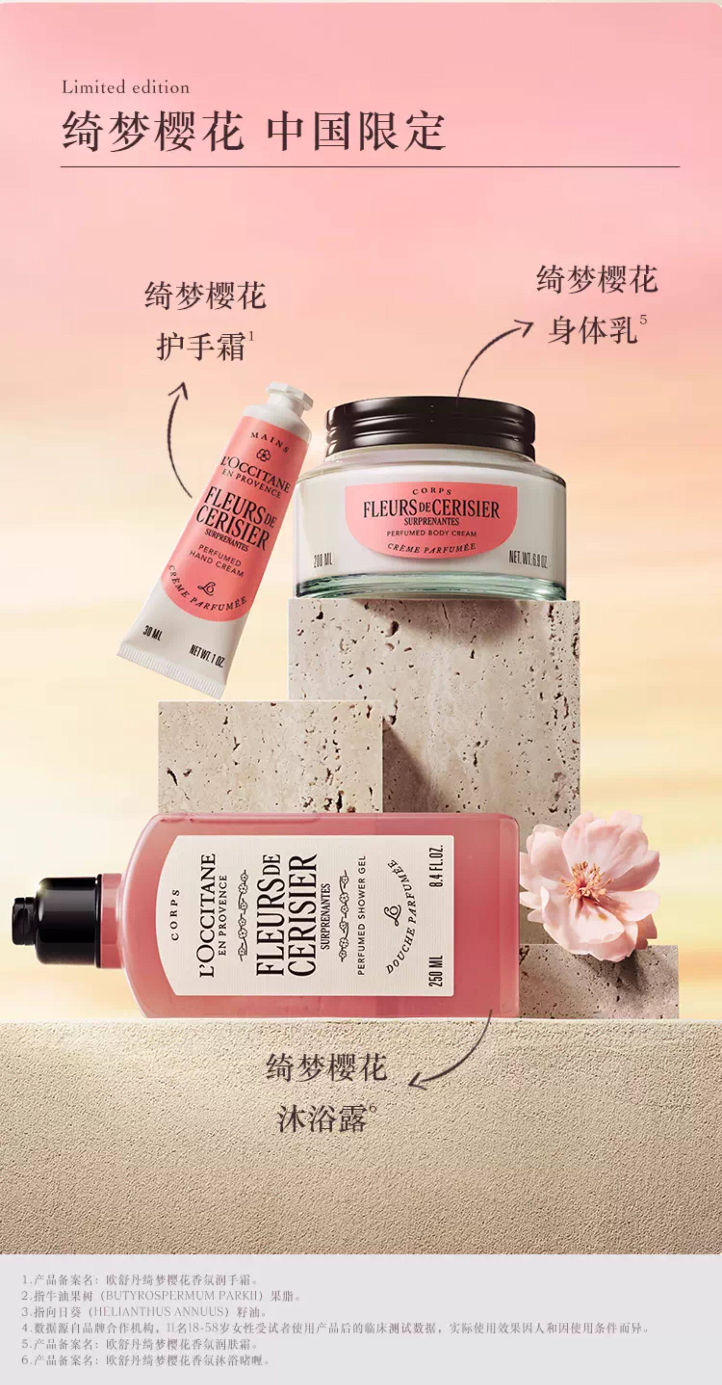 【L'OCCITANE欧舒丹绮梦樱花四件套】 身体乳200ml+香氛沐浴啫喱250ml +护手霜30ml +刮板1个