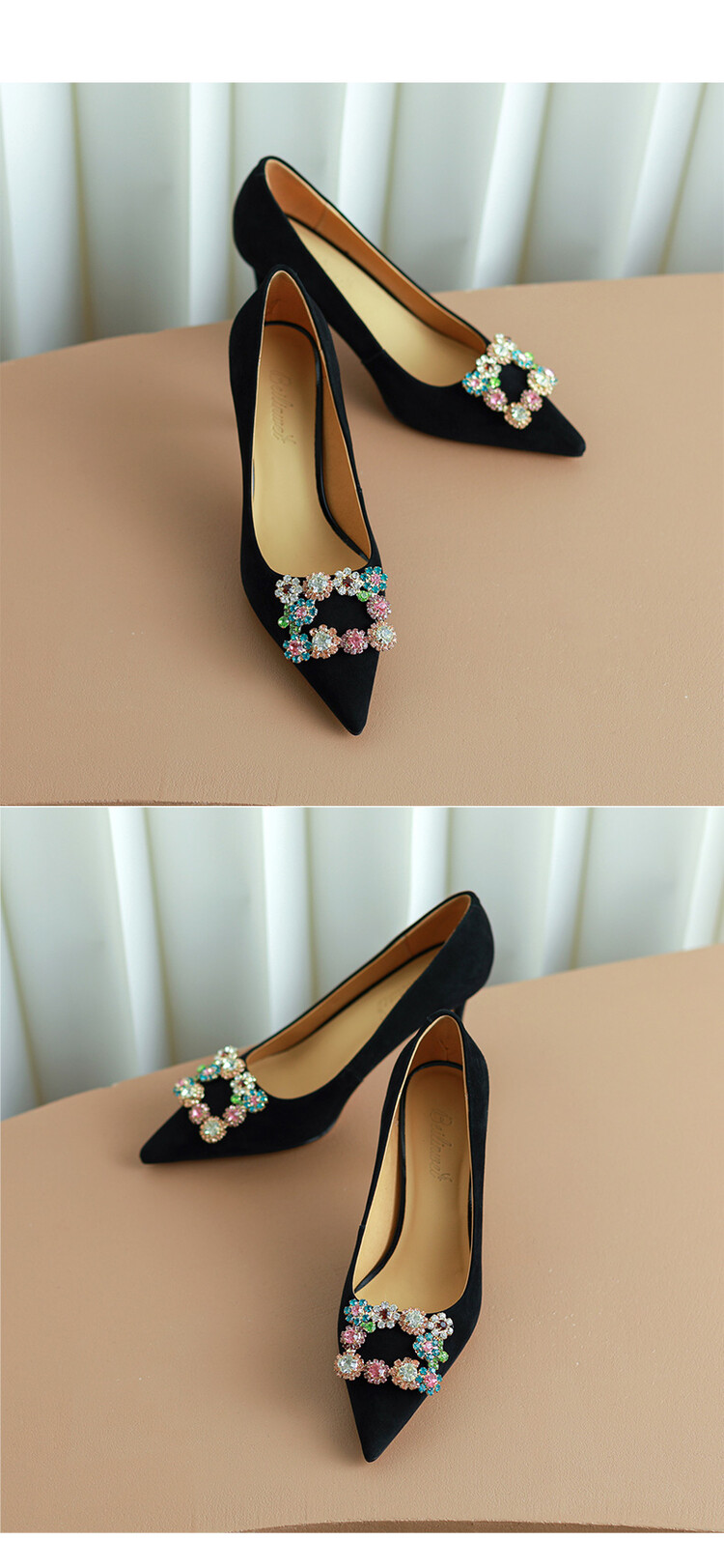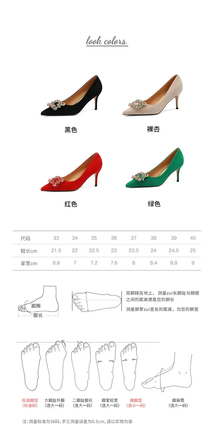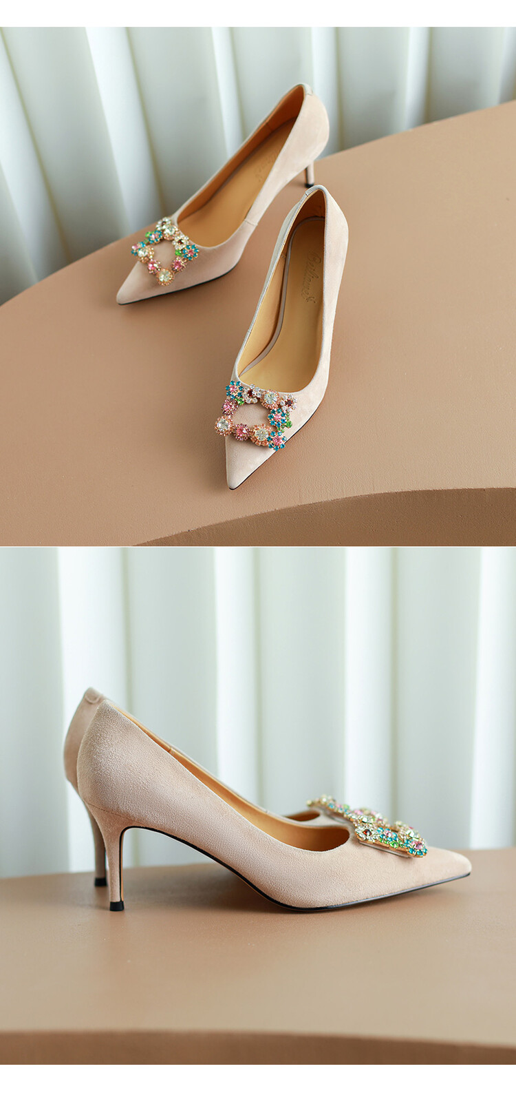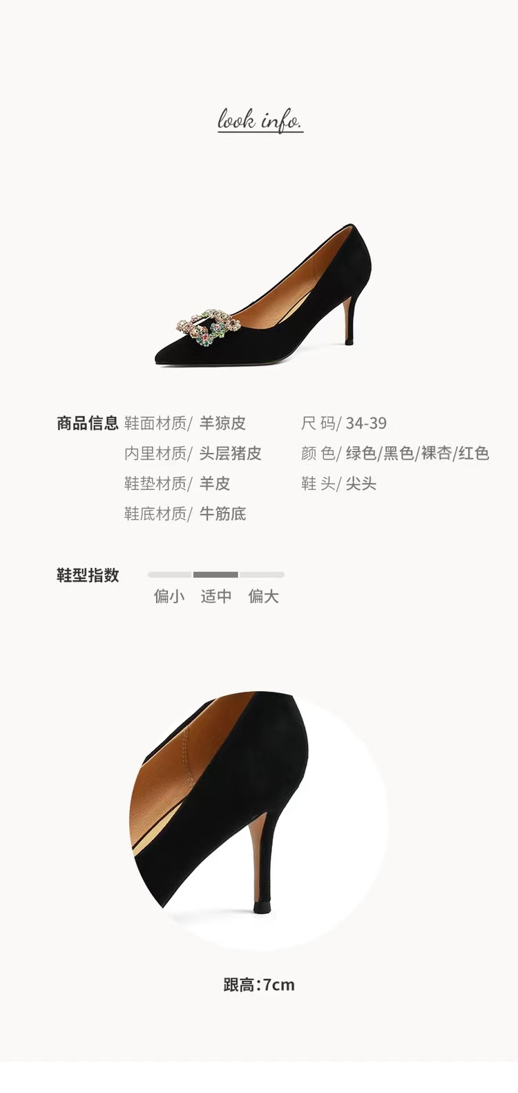 【预售5天】里外全皮细跟尖头水钻方扣浅口单鞋羊翻皮韩版时尚气质高跟鞋婚鞋ZF&ZF009D