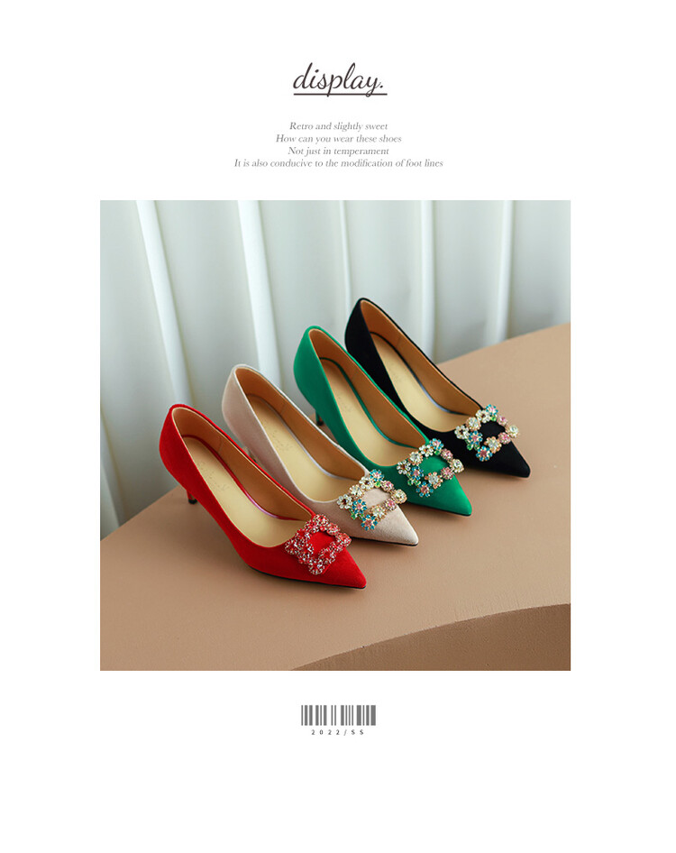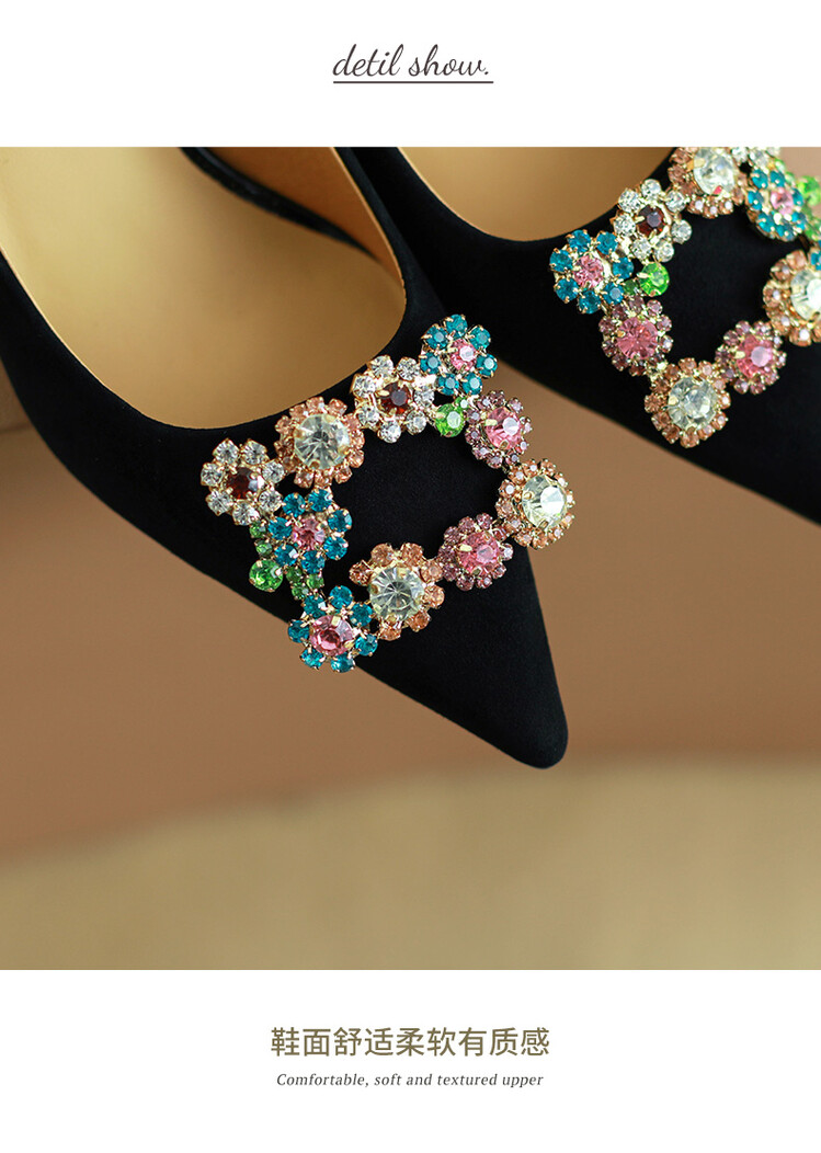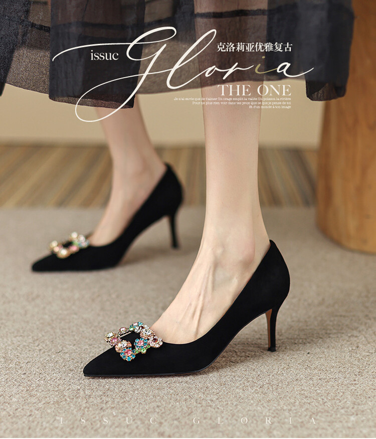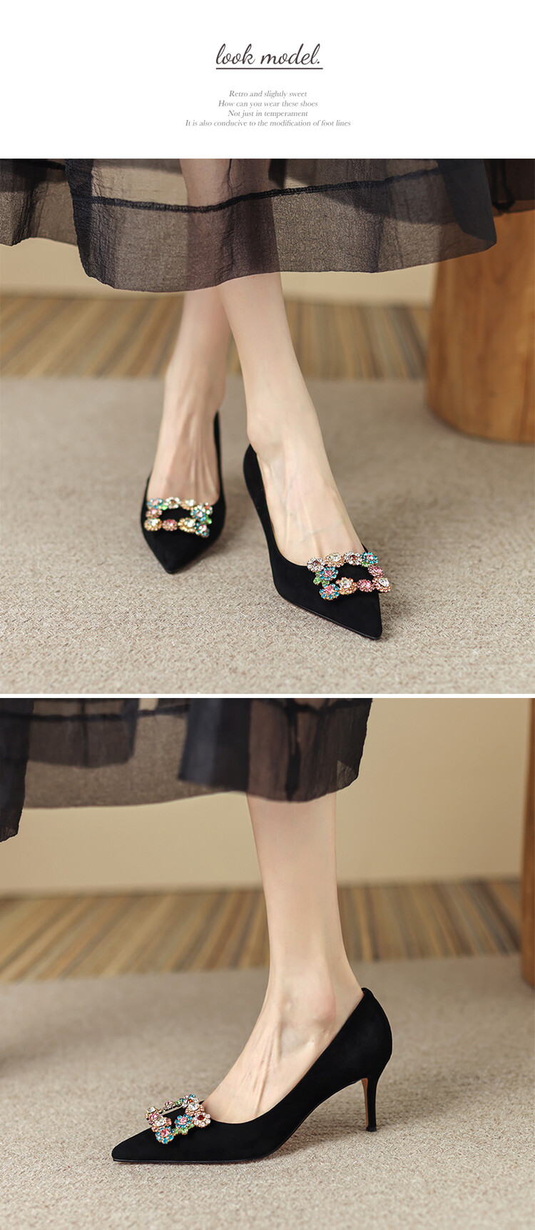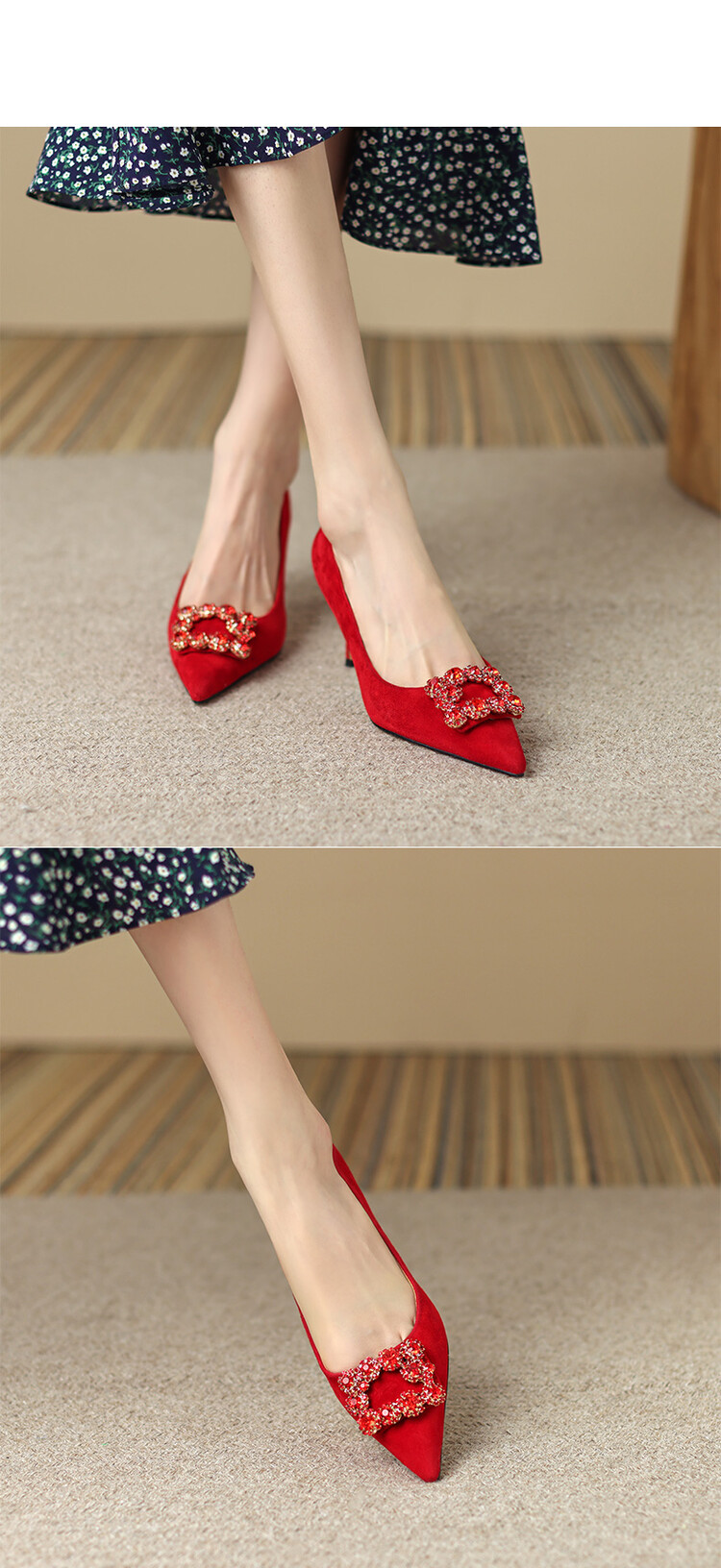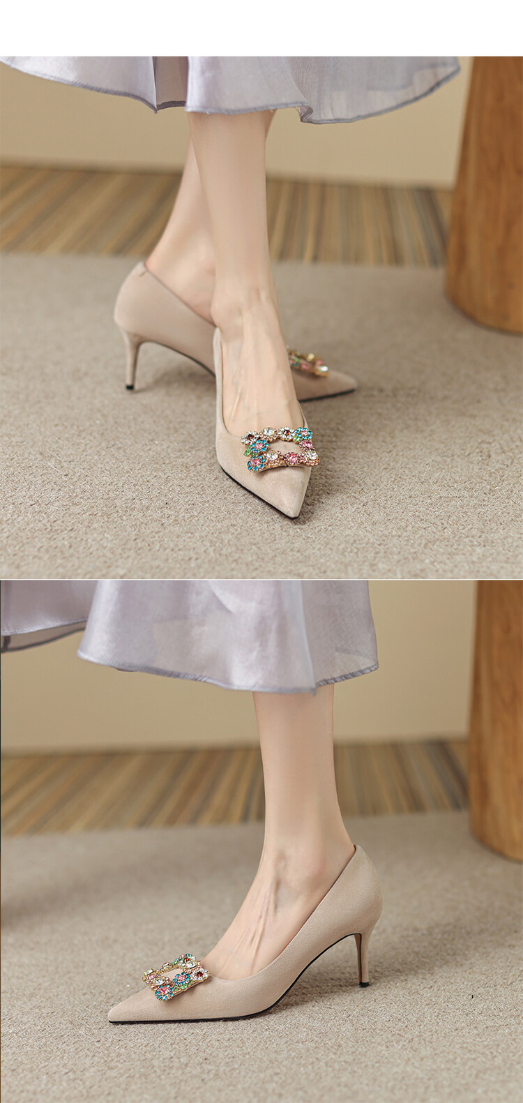 【预售5天】里外全皮细跟尖头水钻方扣浅口单鞋羊翻皮韩版时尚气质高跟鞋婚鞋ZF&ZF009D