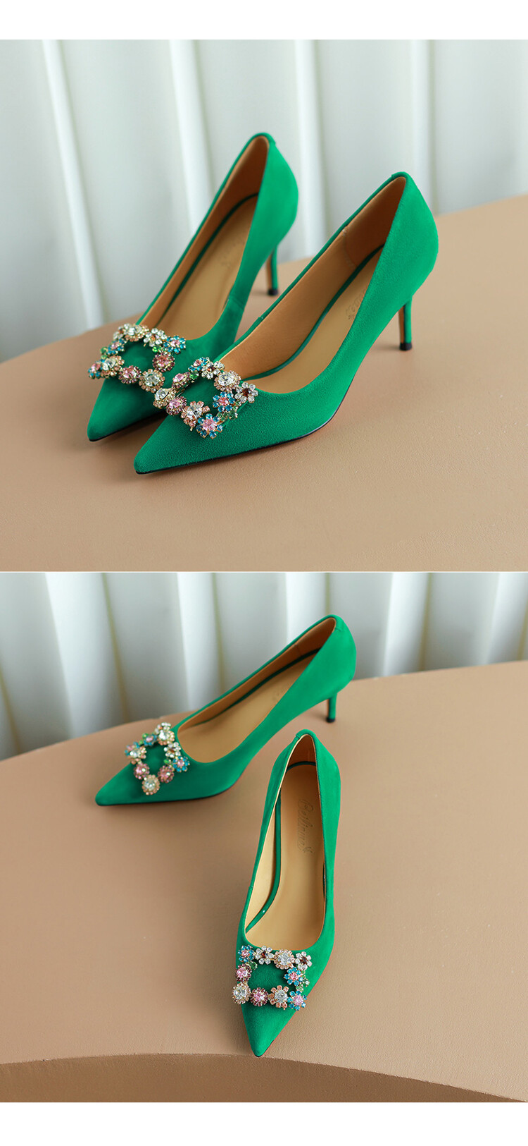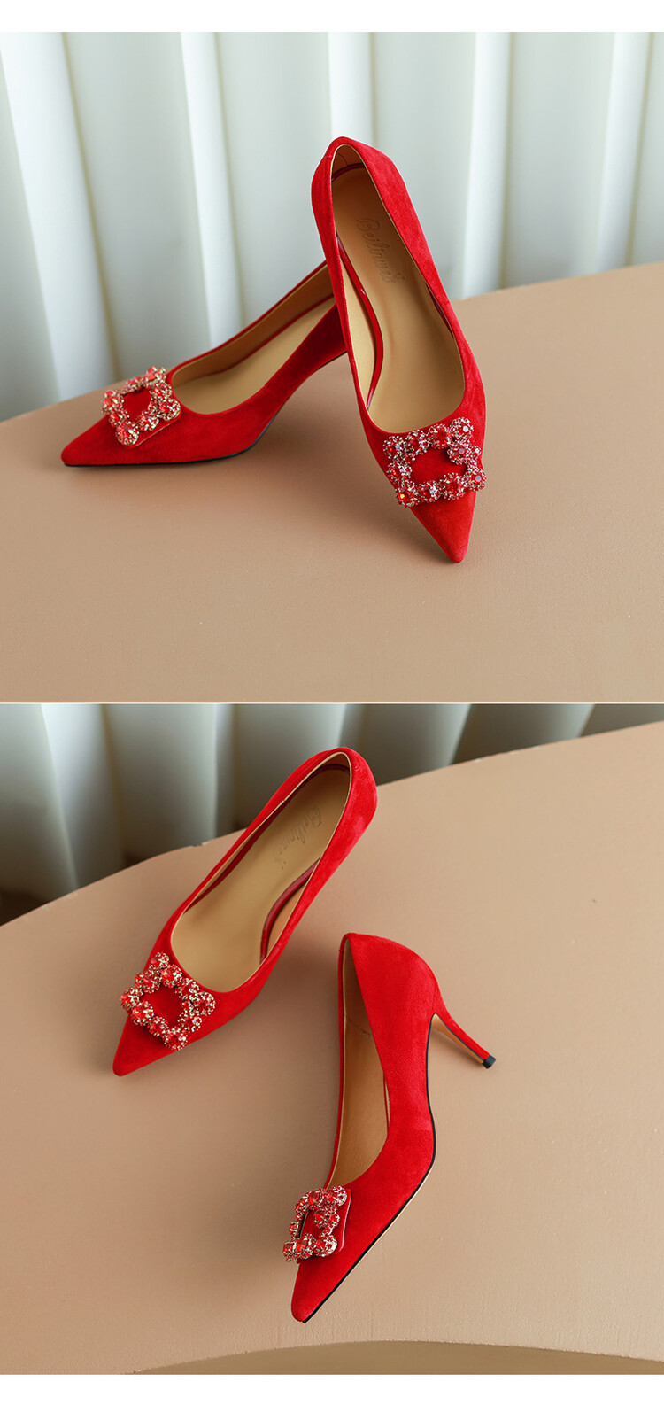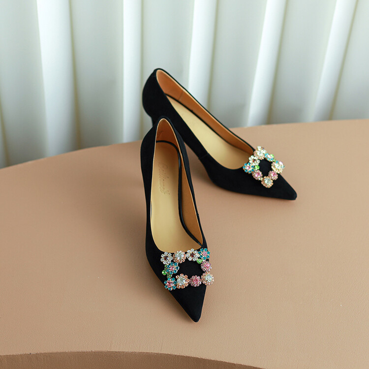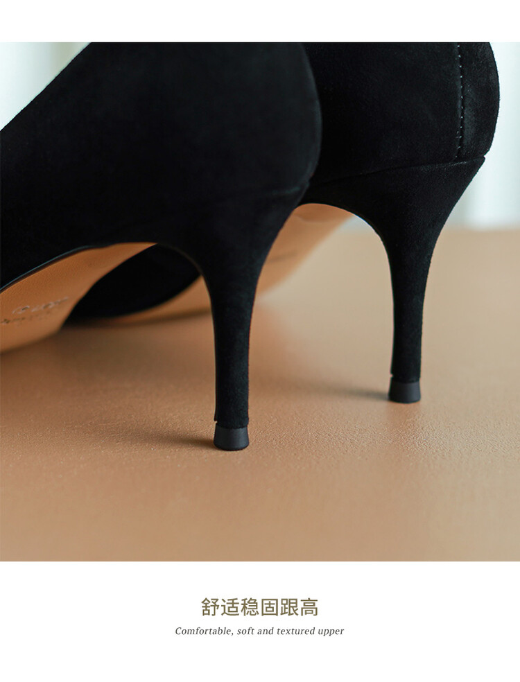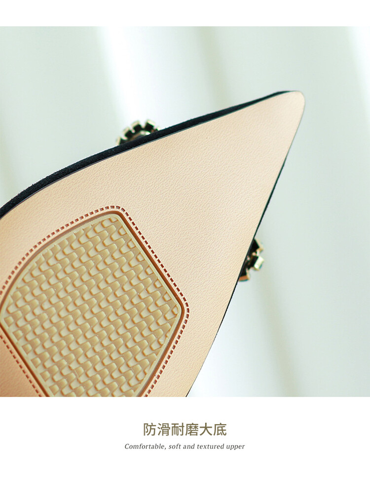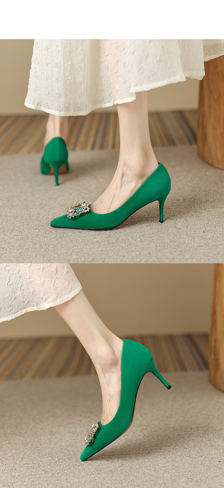 【预售5天】里外全皮细跟尖头水钻方扣浅口单鞋羊翻皮韩版时尚气质高跟鞋婚鞋ZF&ZF009D