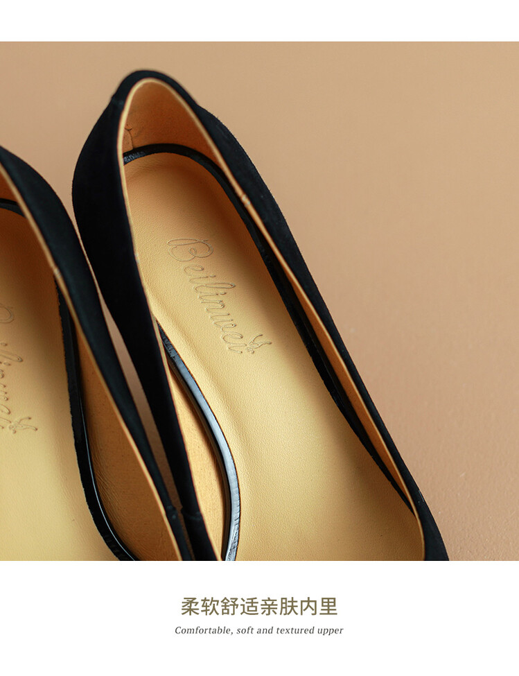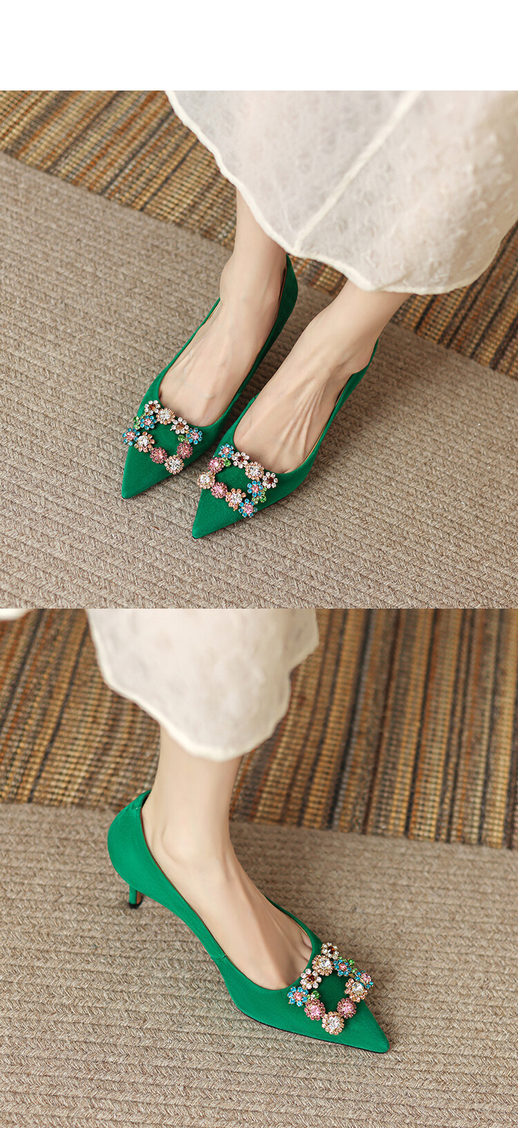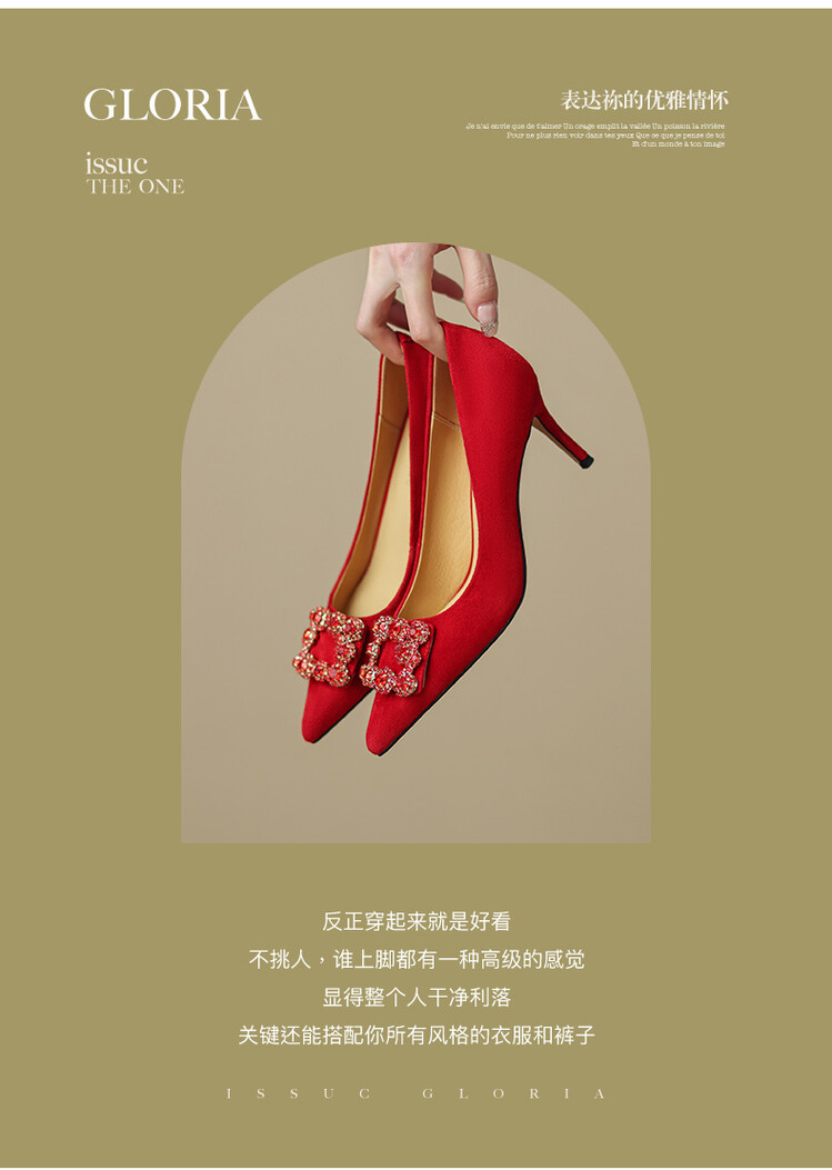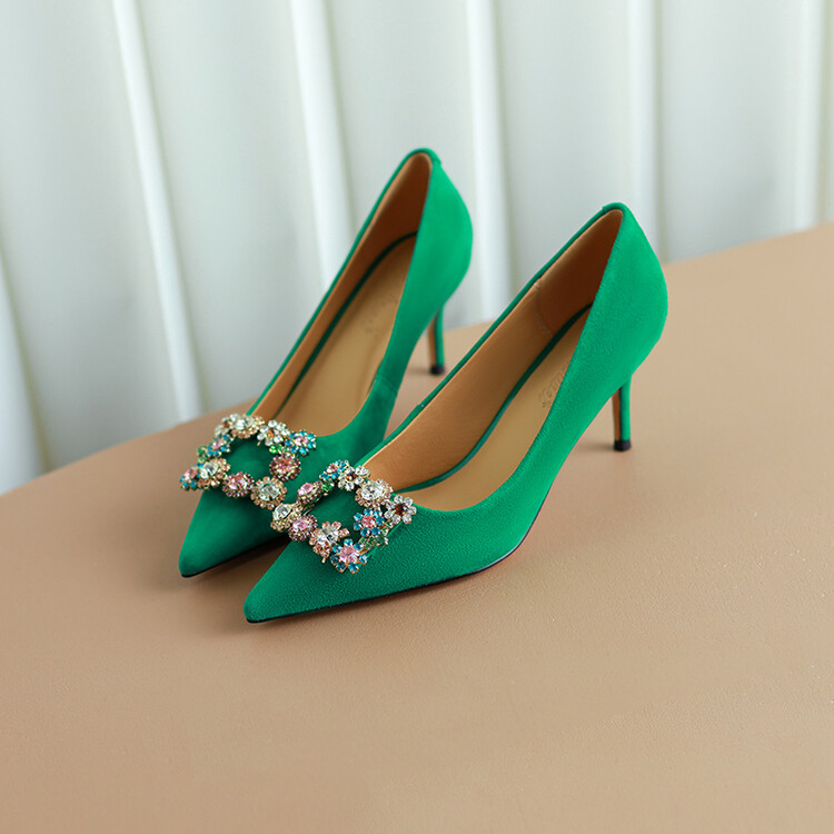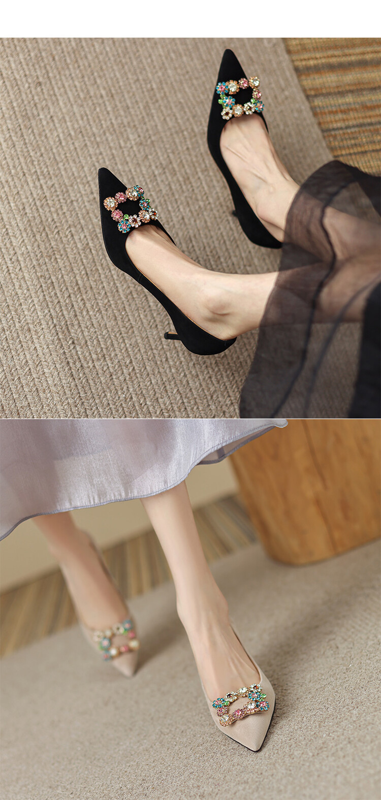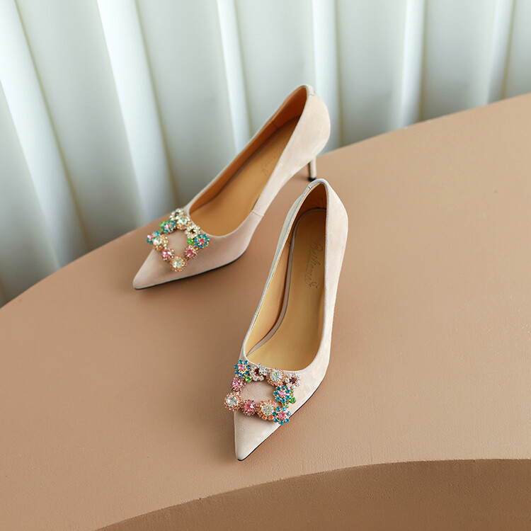 【预售5天】里外全皮细跟尖头水钻方扣浅口单鞋羊翻皮韩版时尚气质高跟鞋婚鞋ZF&ZF009D