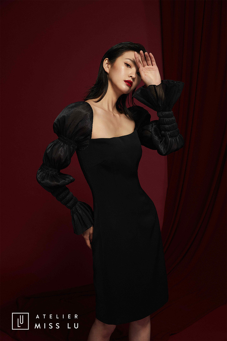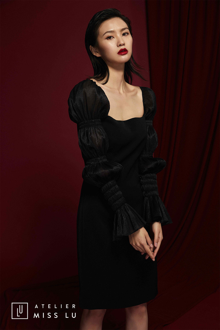 AtelierMissLu /Yolanda-银河黑色纱袖修身连身裙/0000575