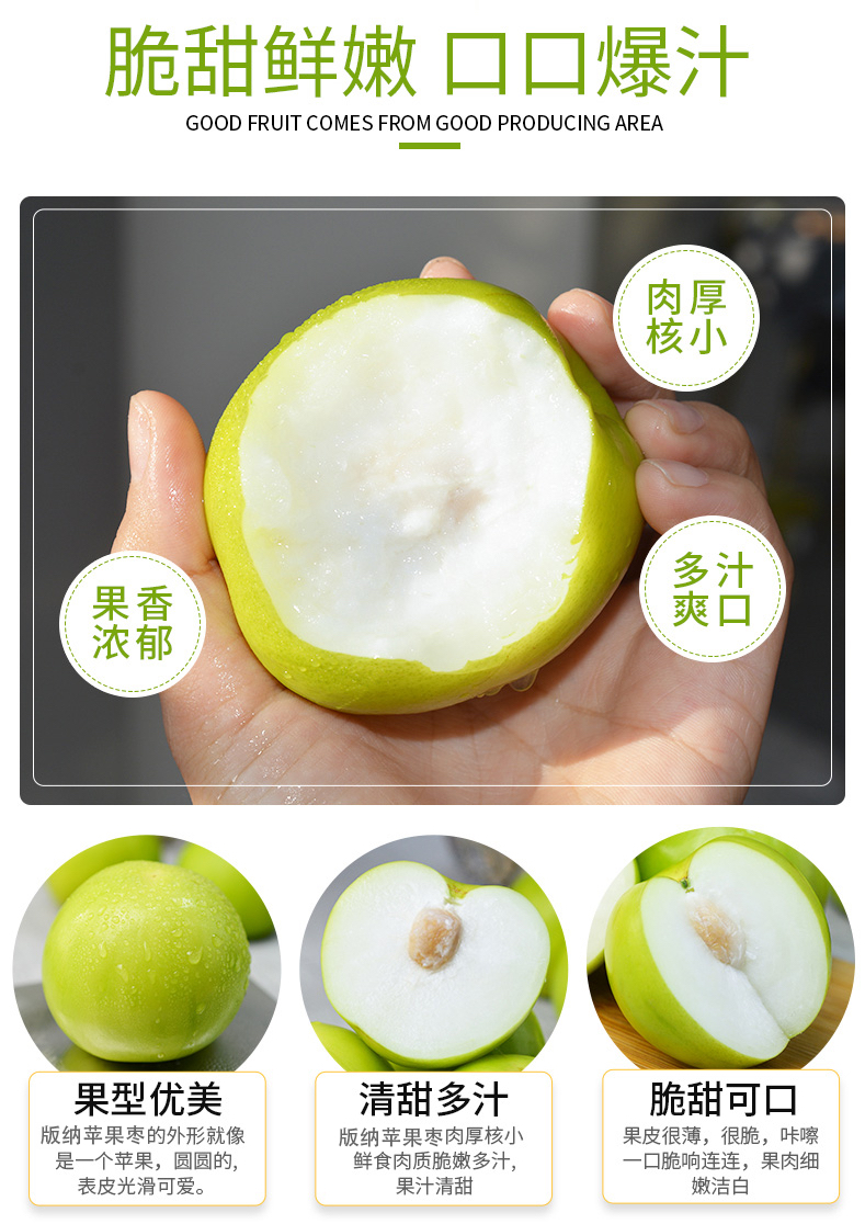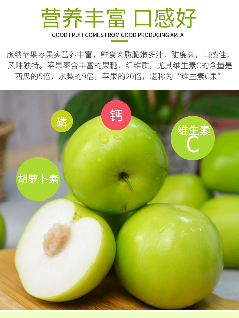 "一枣三味"天然的复合型固态果汁,说它是"果中妲己"只因单看外表就能让人口水狂咽,拳头大的个头,远看像四五月份的青苹果,近看又有几分梨的韵味。