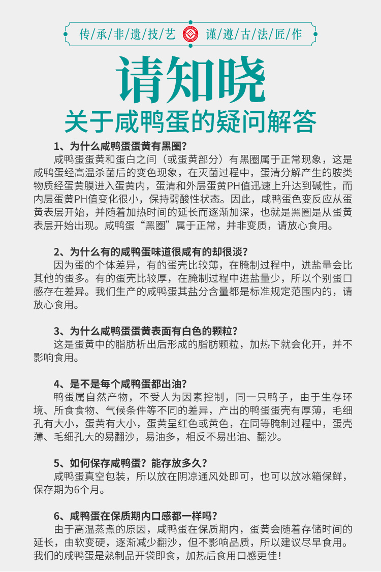 2、因鸭蛋蛋壳有厚薄、毛细孔有大小等差异,所以在腌制过程中会出现有些蛋出油多,有些蛋出油少的情况,属正常现象,因出油多少问题不接受售后!