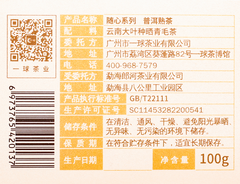一球2020年随心系列 云南茶叶正品大叶普洱茶熟茶盒装100g