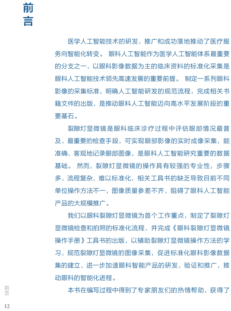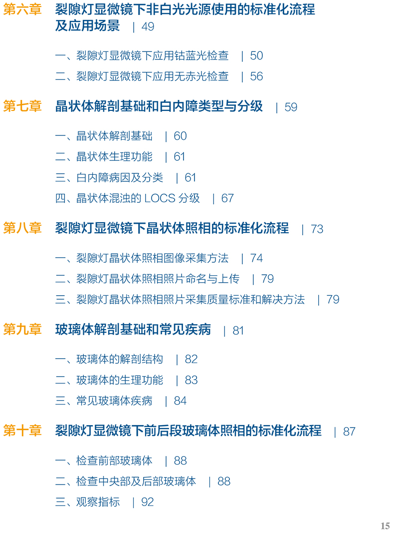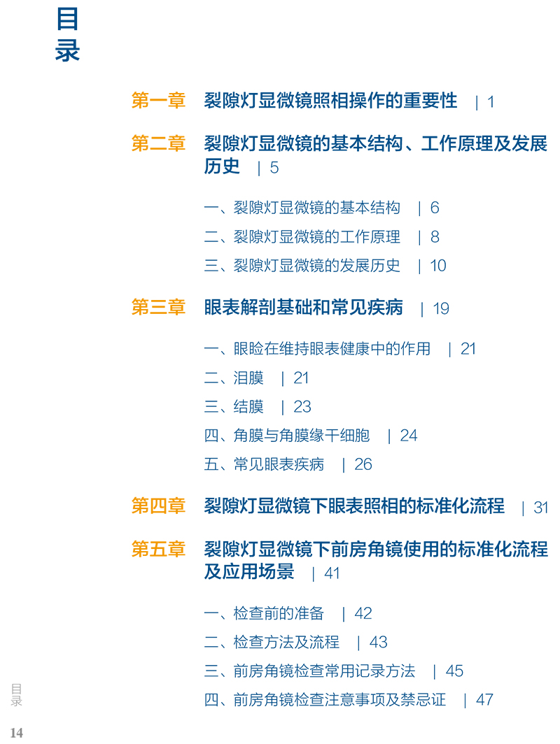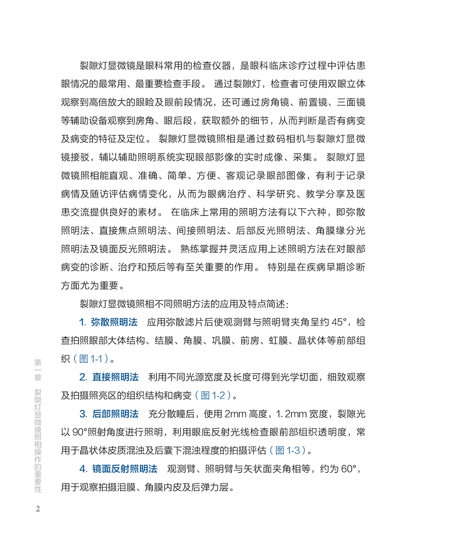 裂隙灯显微镜是眼科常用的检查仪器,是眼科临床诊疗过程中评估患眼情况的最常用、最重要检查手段。本书围绕裂隙灯显微镜操作技巧、标准化裂隙灯拍照流程以及主要眼病的检查结果判读来编写,旨在普及、推广并规范裂隙灯检查,提高裂隙灯检查效率,对于促进眼科临床和科研工作,具有重要意义。1.裂隙灯显微镜是眼科常用的检查仪器,是眼科临床诊疗过程中评估患眼情况的最常用、最重要检查手段。通过裂隙灯,检查者可使用双眼立体地观察到高倍放大的眼睑及眼前段情况,还可通过辅助设备观察到房角、眼后段,从而判断是否有病变及病变的特征及定位。裂隙灯显微镜照相可实现眼部影像的实时成像采集。能直观、准确、客观地记录眼部图像,有利记录病情及随访评估病情变化,从而为眼病治疗、科学研究、教学交流及医患交流提供良好的素材。2.目前此类选题较少,但读者受众相对较大、3.中山眼科中心作为国内领先的眼科专科医院,积累了丰富的裂隙灯显微镜操作经验,建立了裂隙灯显微镜使用拍照规范流程。