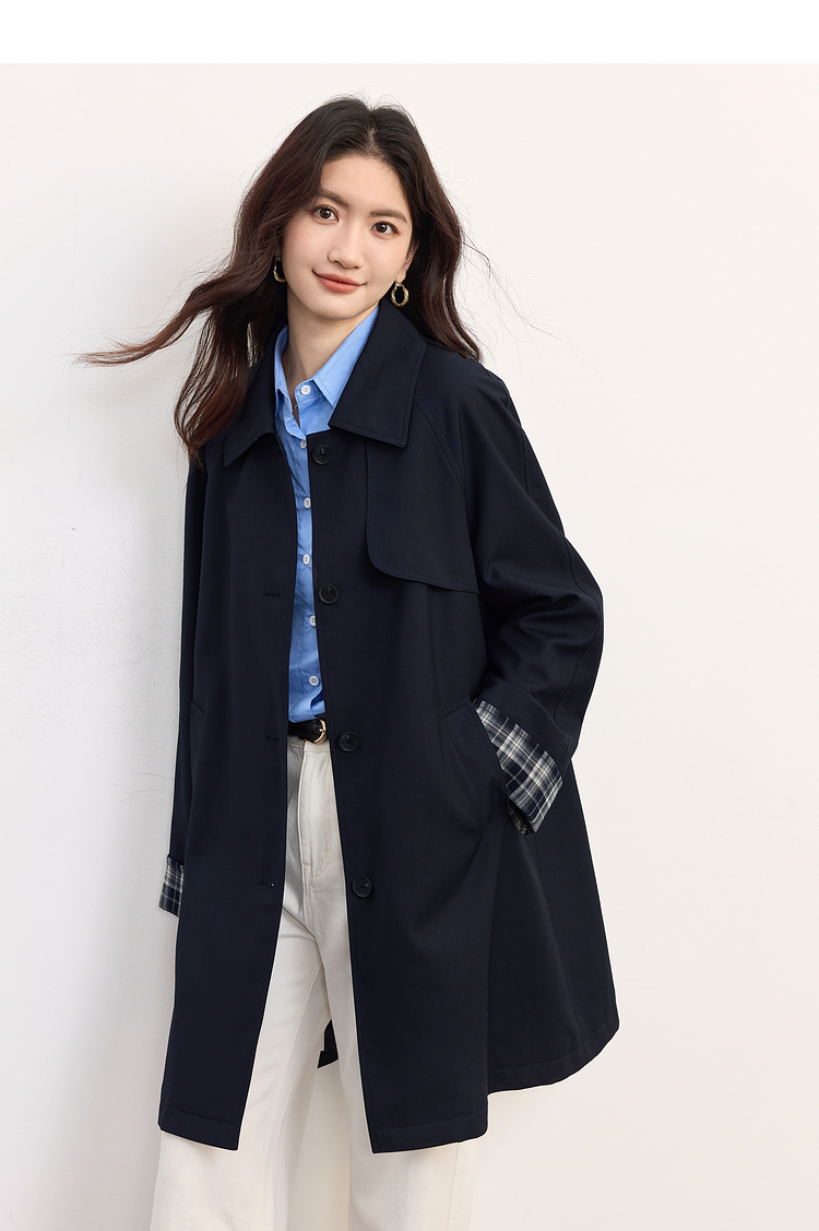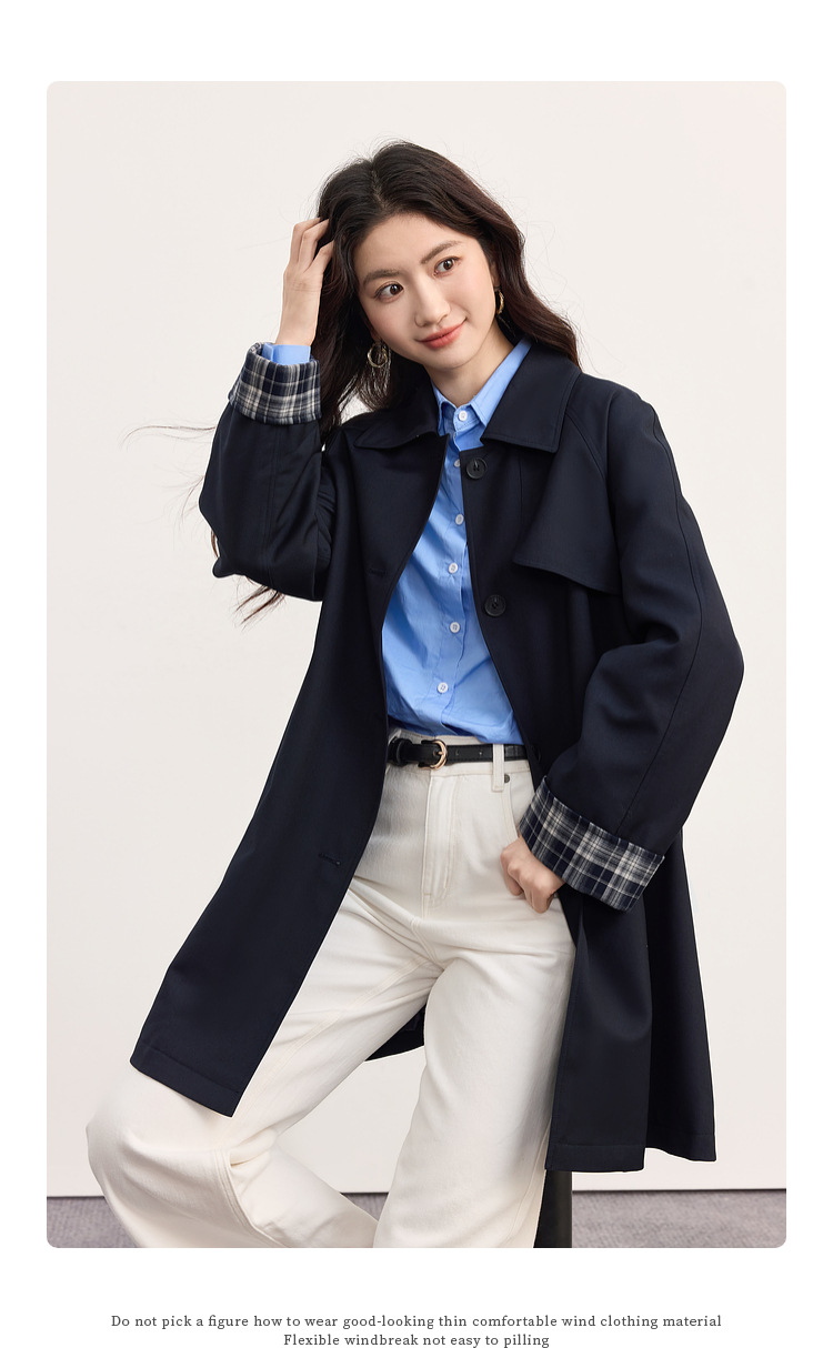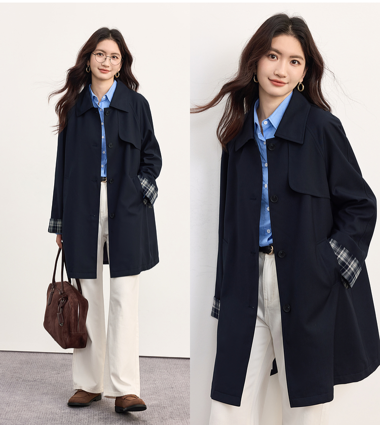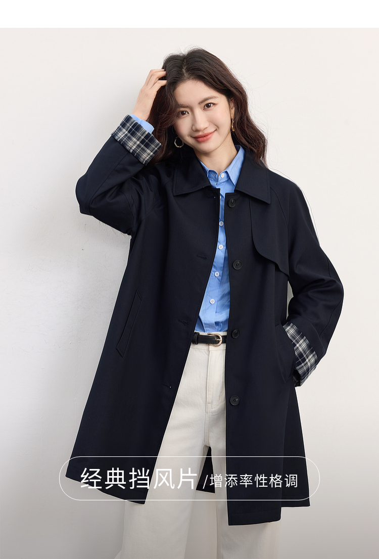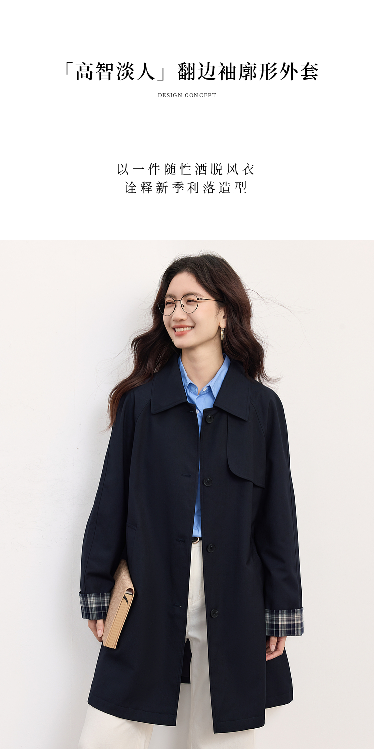【09/17新品】熙世界淡人穿搭风衣外套女高级感格纹翻边袖中长款大衣2025秋新款