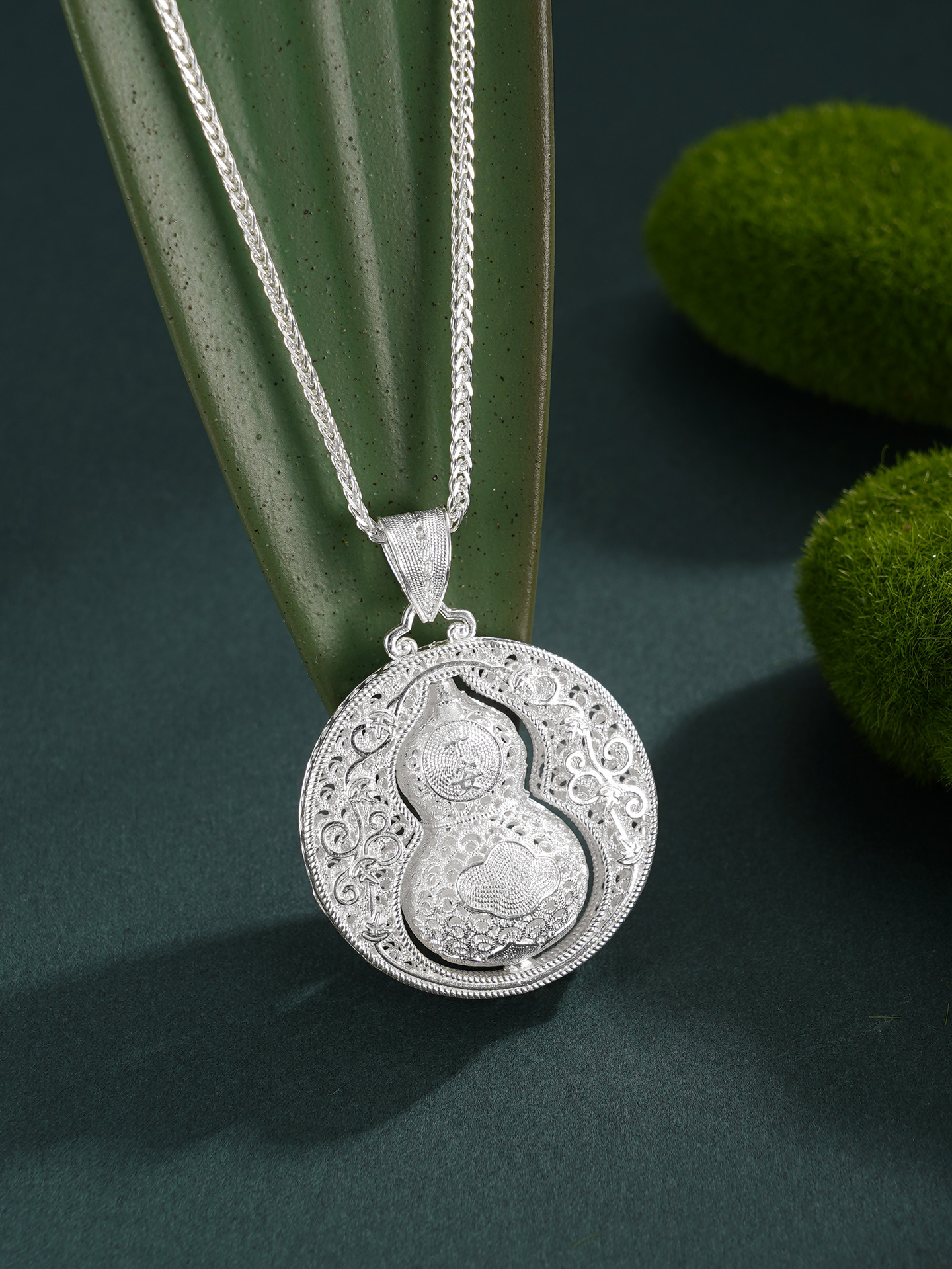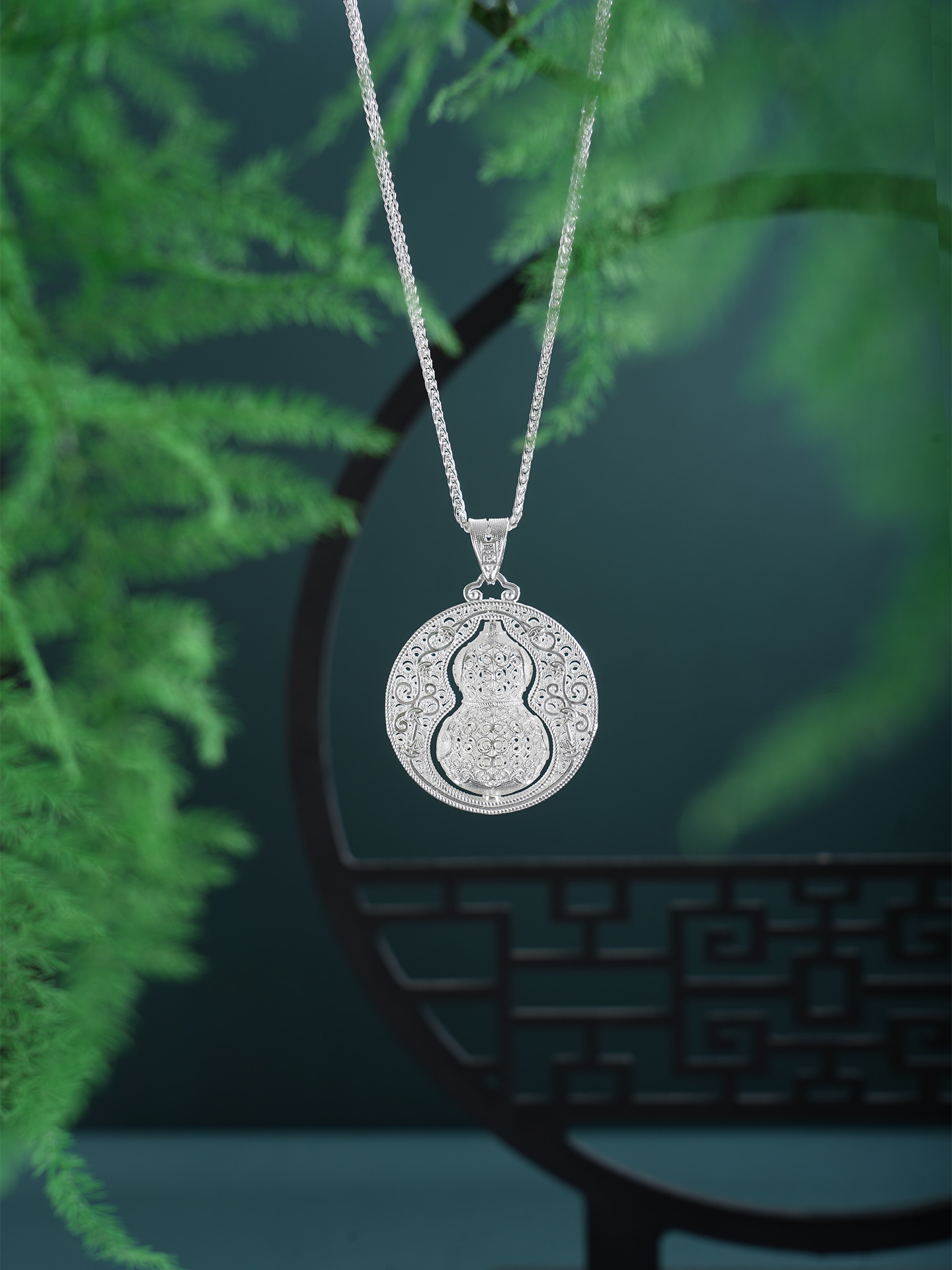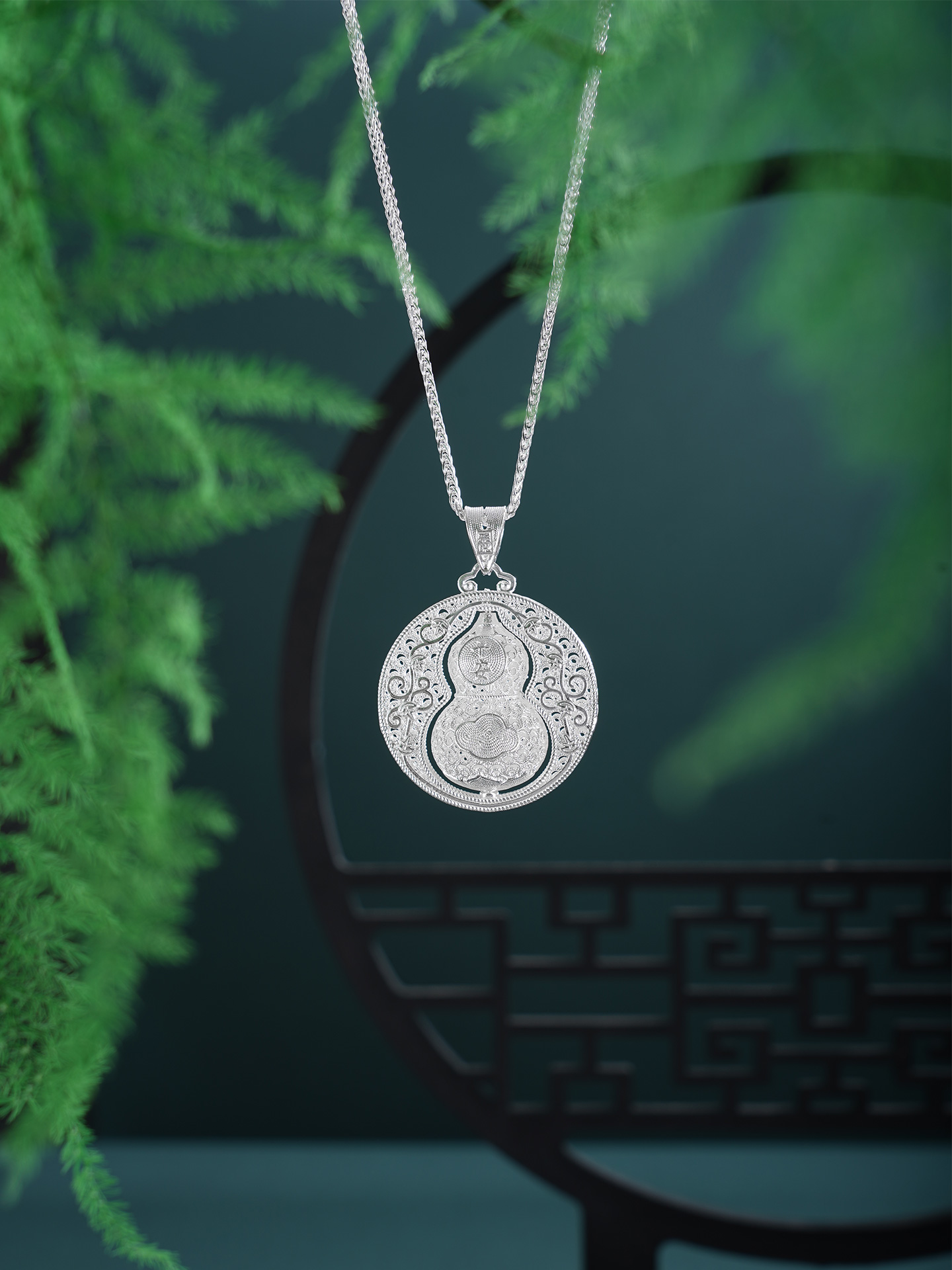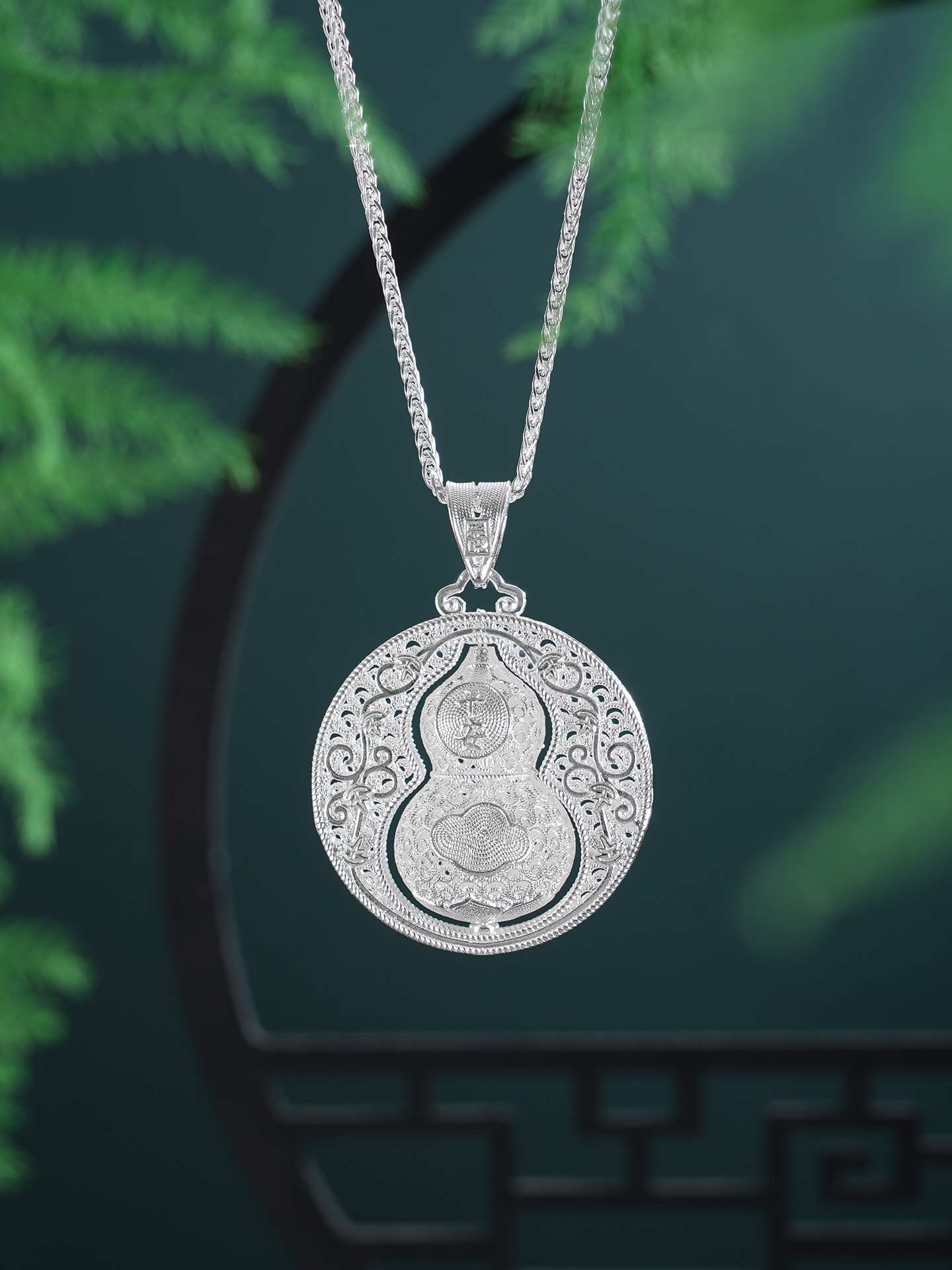 【寓意】:作品以葫芦为灵感设计,应用银花丝工艺编织而成。中心葫芦可转动设计,精致立体,寓意福来运转,福禄岁岁。