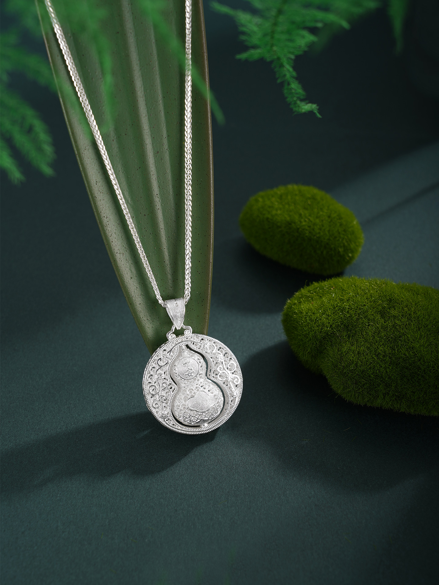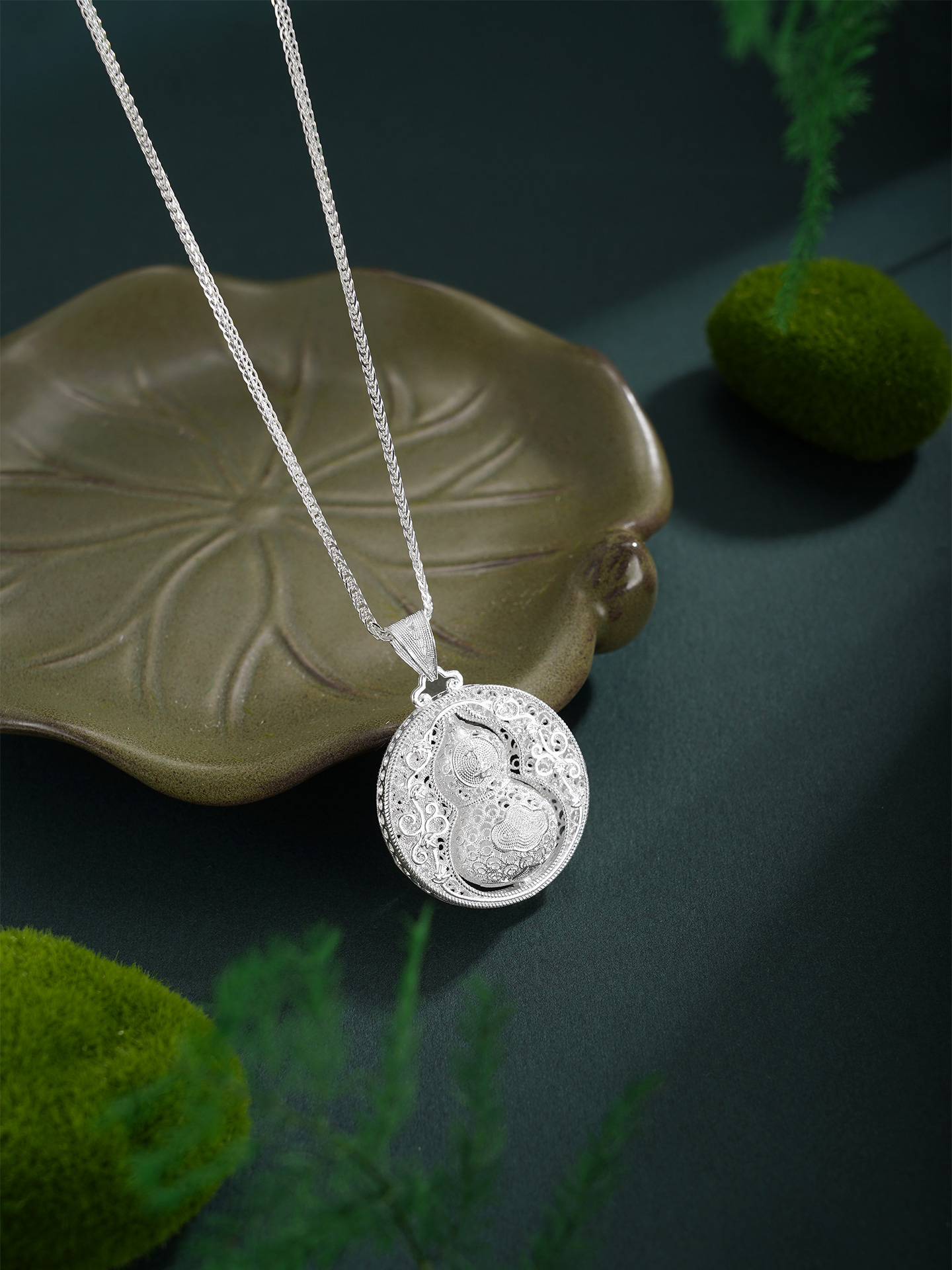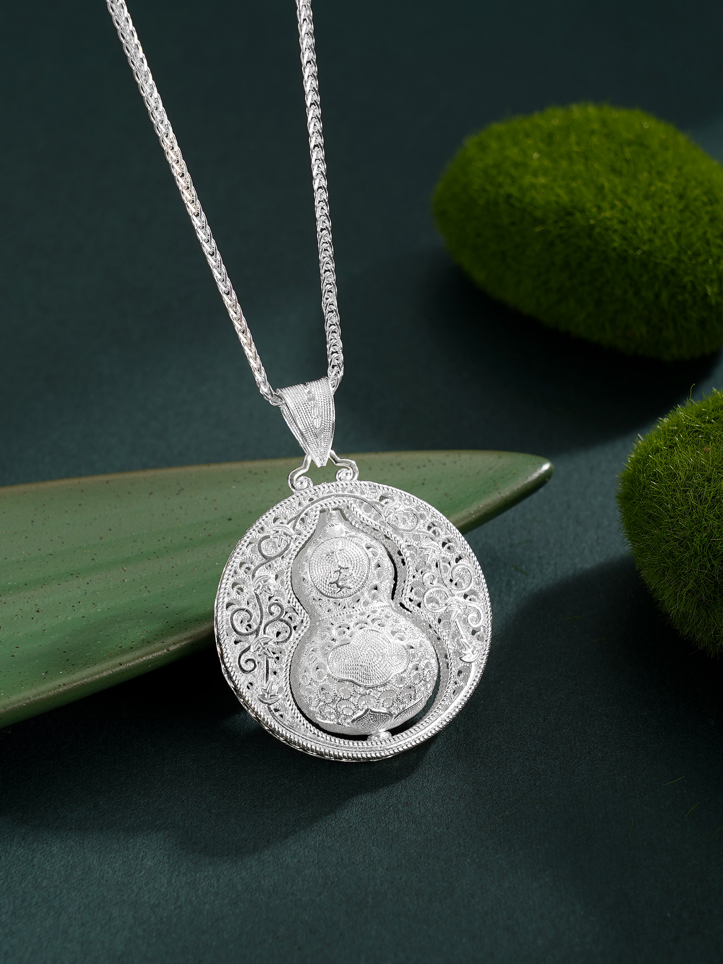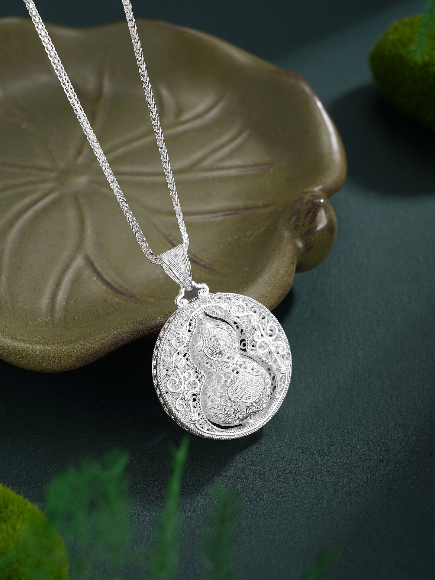 【寓意】:作品以葫芦为灵感设计,应用银花丝工艺编织而成。中心葫芦可转动设计,精致立体,寓意福来运转,福禄岁岁。