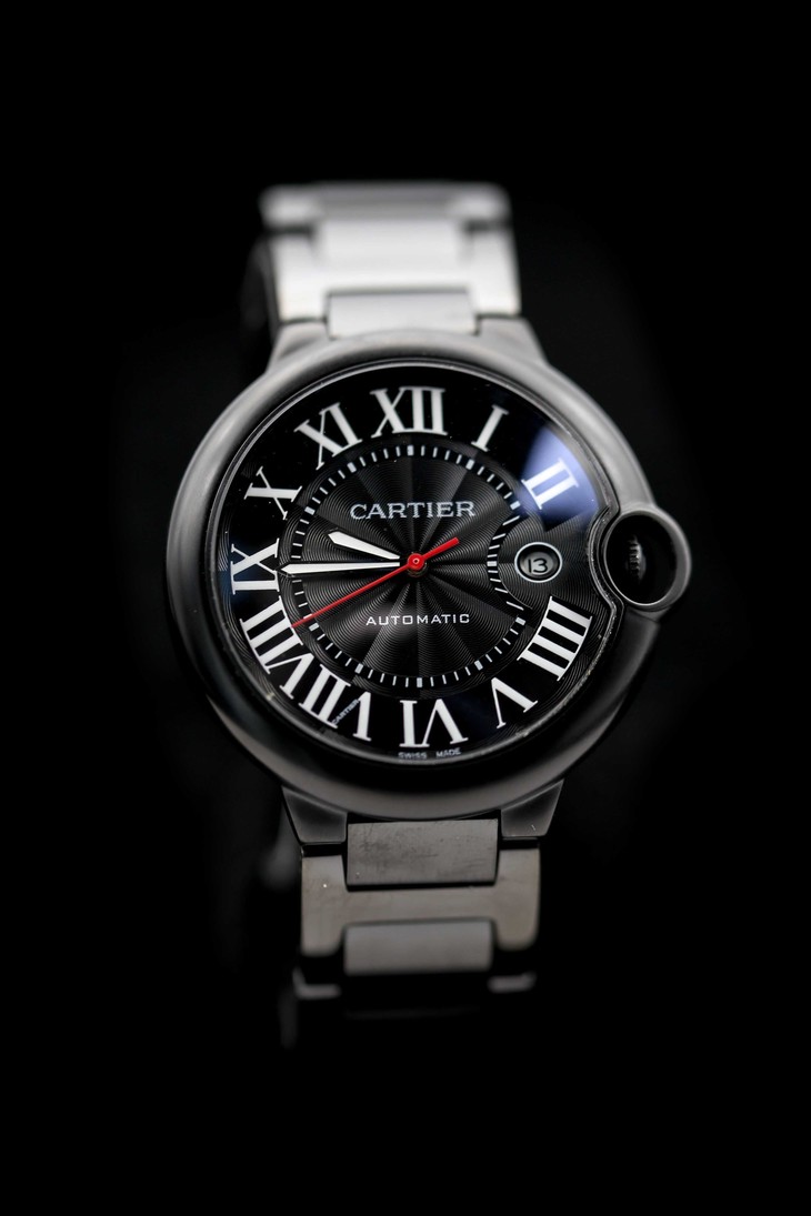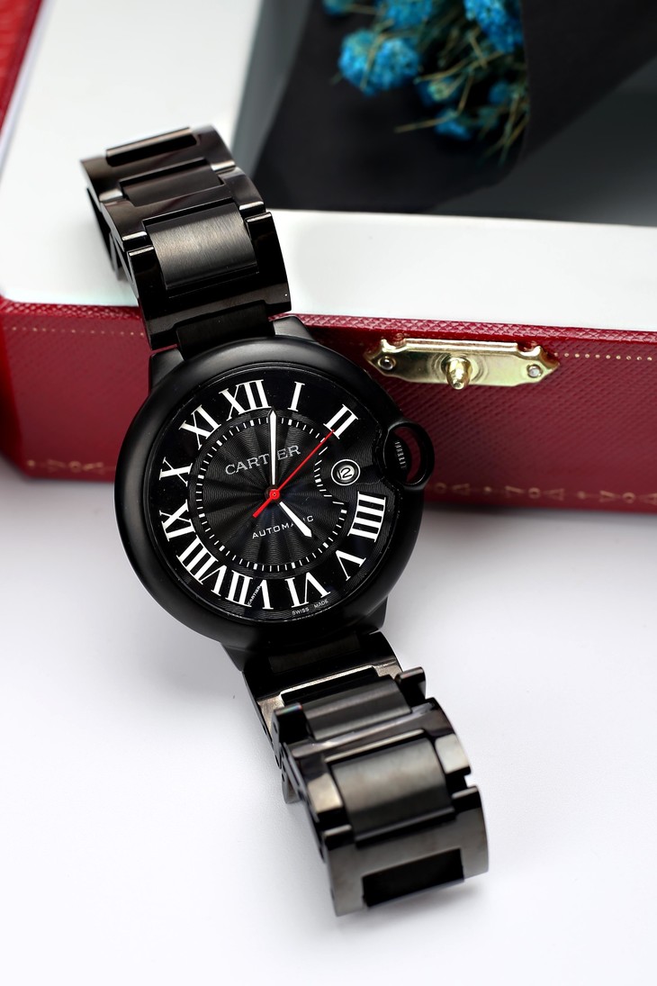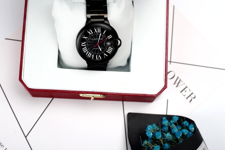 卡地亚 黑色机械表时尚神秘,成熟与稳重。2017Cartier蓝气球新增了黑色碳镀层工艺提供了酷黑外观, 更具有朝气的优雅魅力。皮带