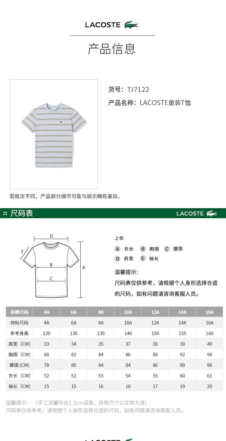 【海南专供价】Lacoste法国鳄鱼童装新款短袖T恤TJ7122-98