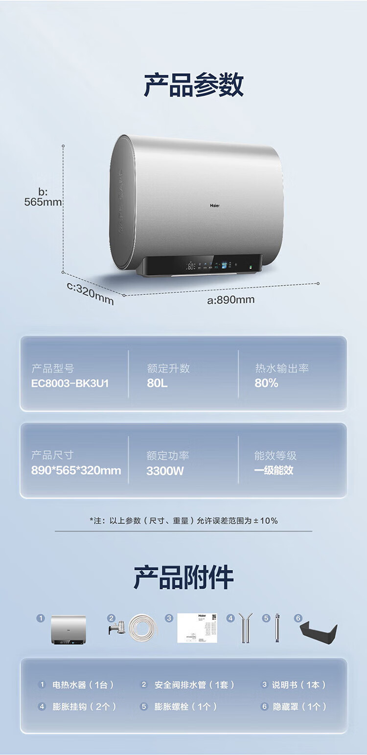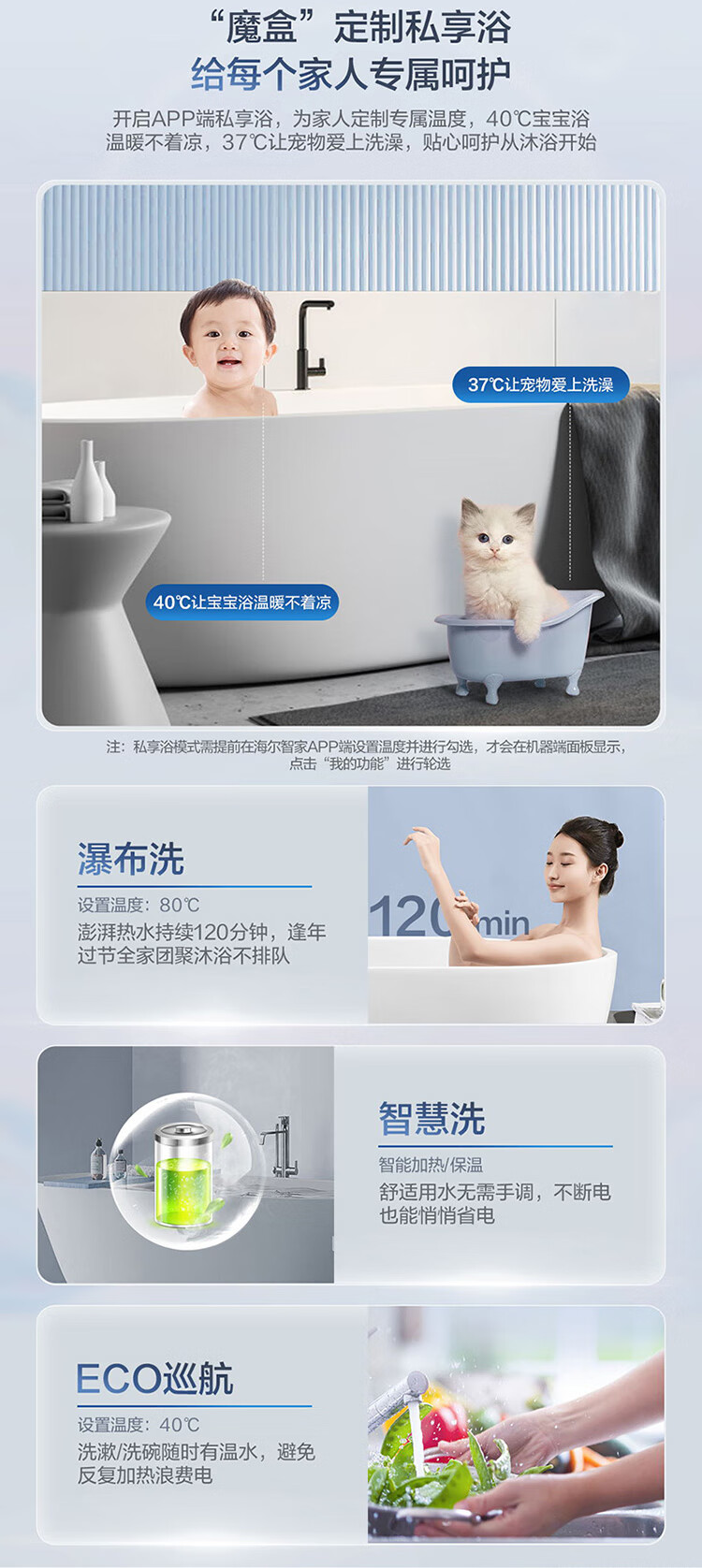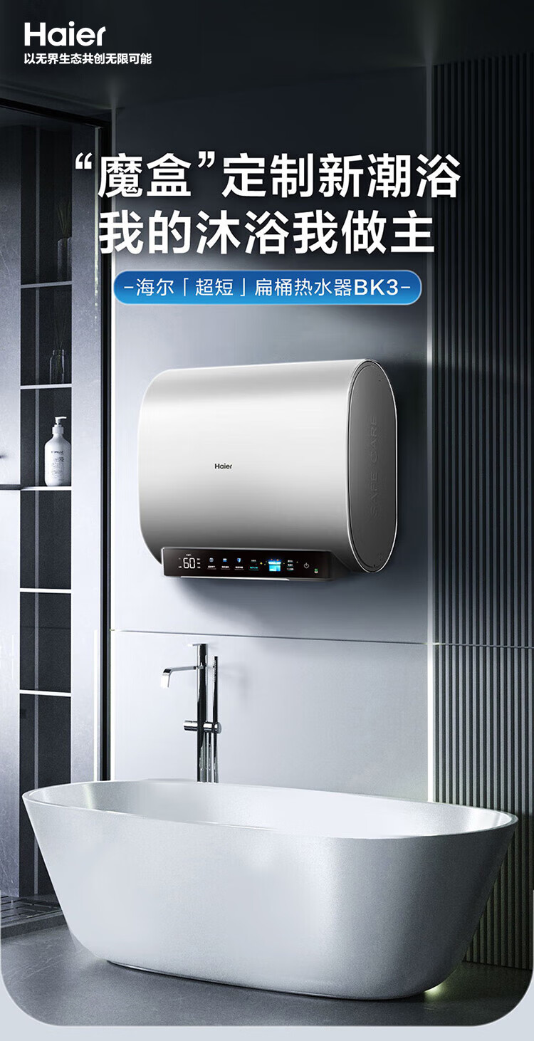 海尔(Haier)80升【小魔盒】定制洗浴超薄扁桶双胆家用电热水器3300W变频速热镁棒免更换WiFi智能 EC8003-BK3U1