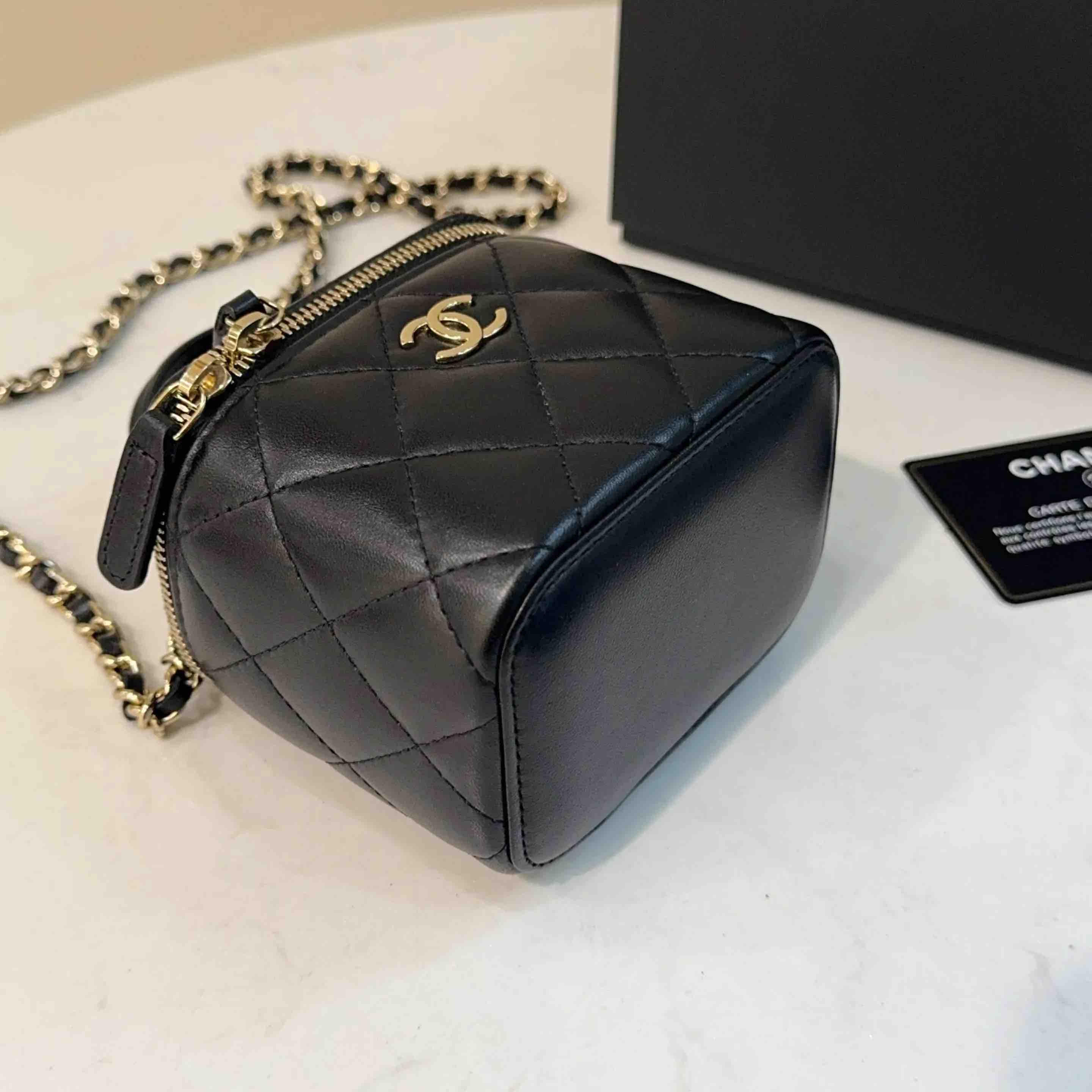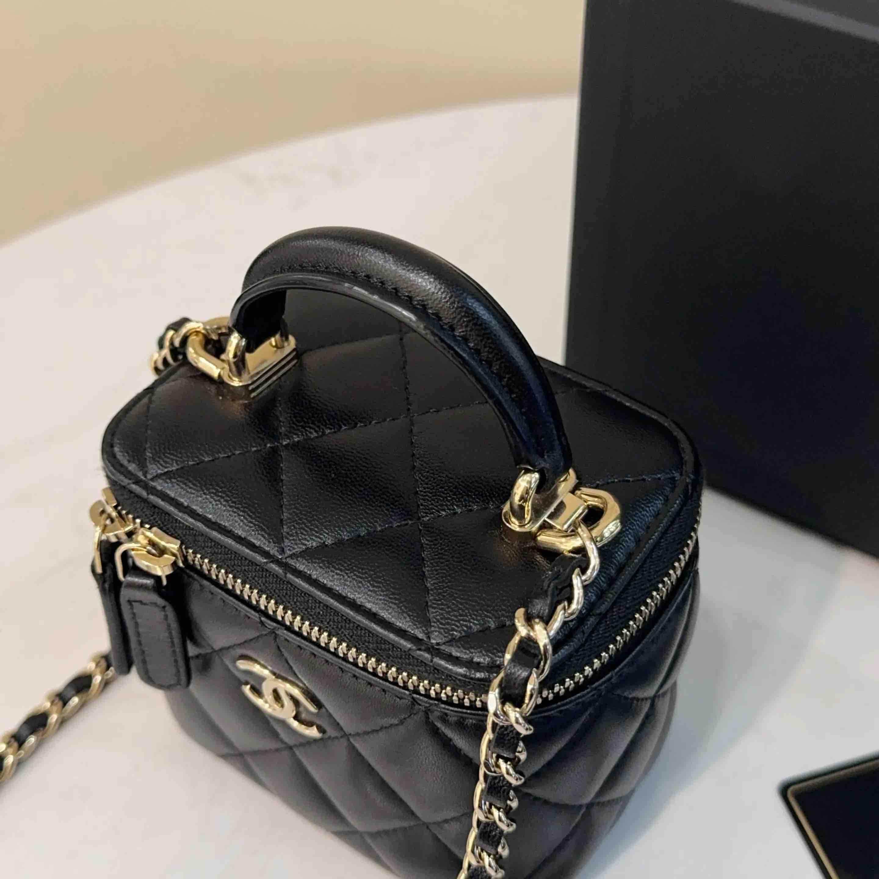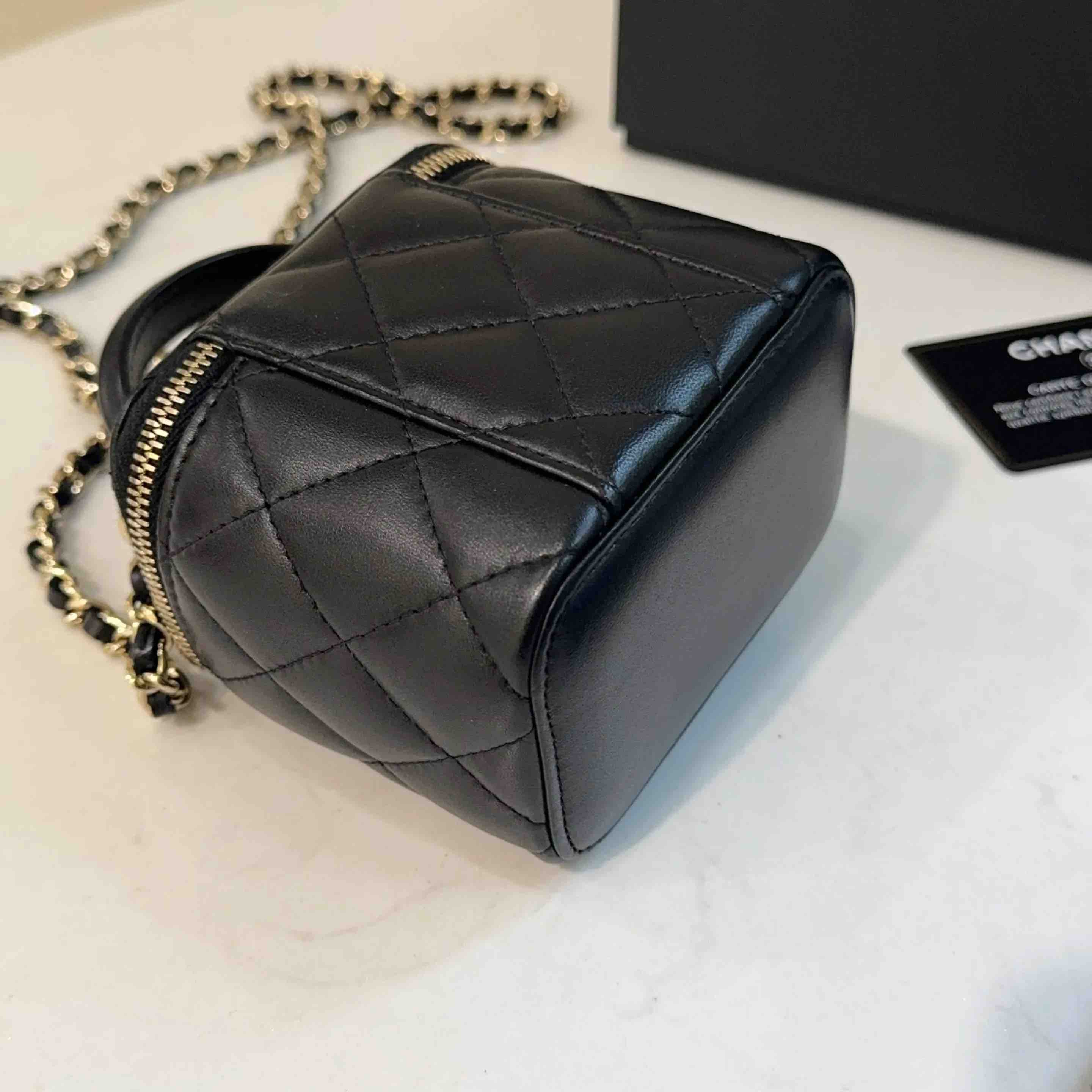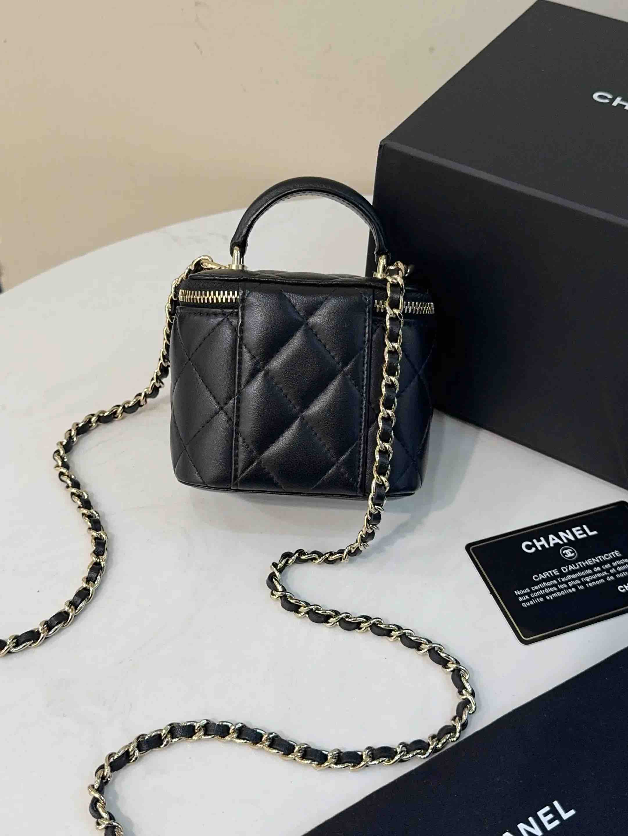 【商品详情】正品二手 CHANEL 21k 手柄 黑金 mini 羊皮 斜挎包🌟98新 10×9 配件:卡 防尘袋 盒子。21年季节限定 超级 mini 可爱🤩