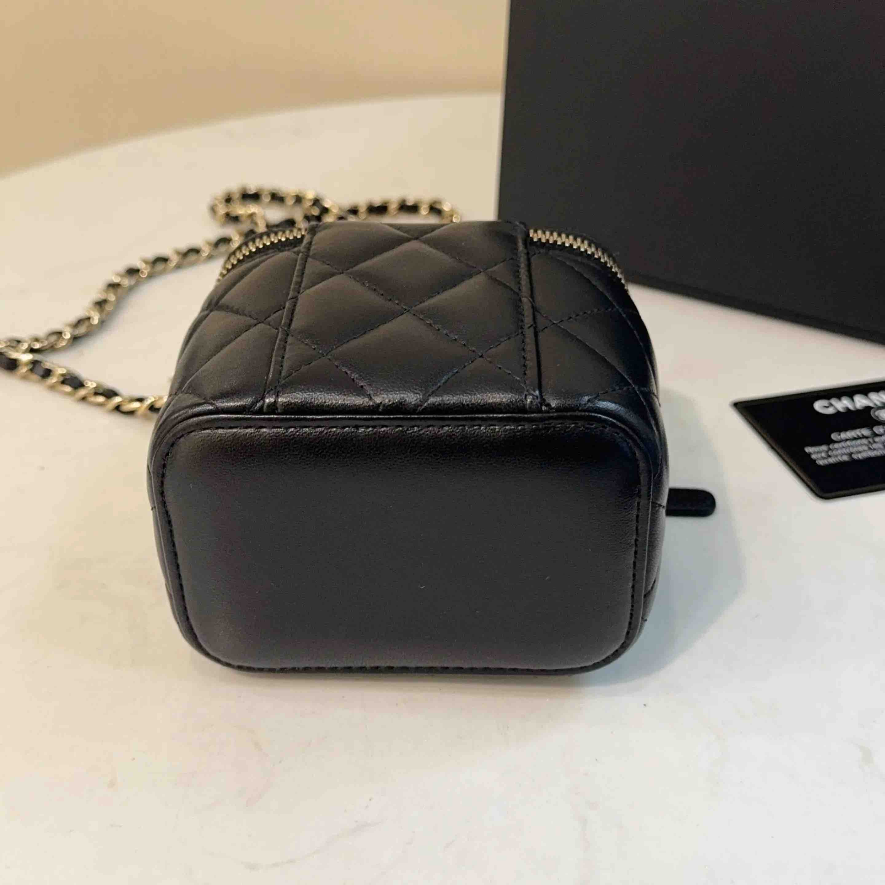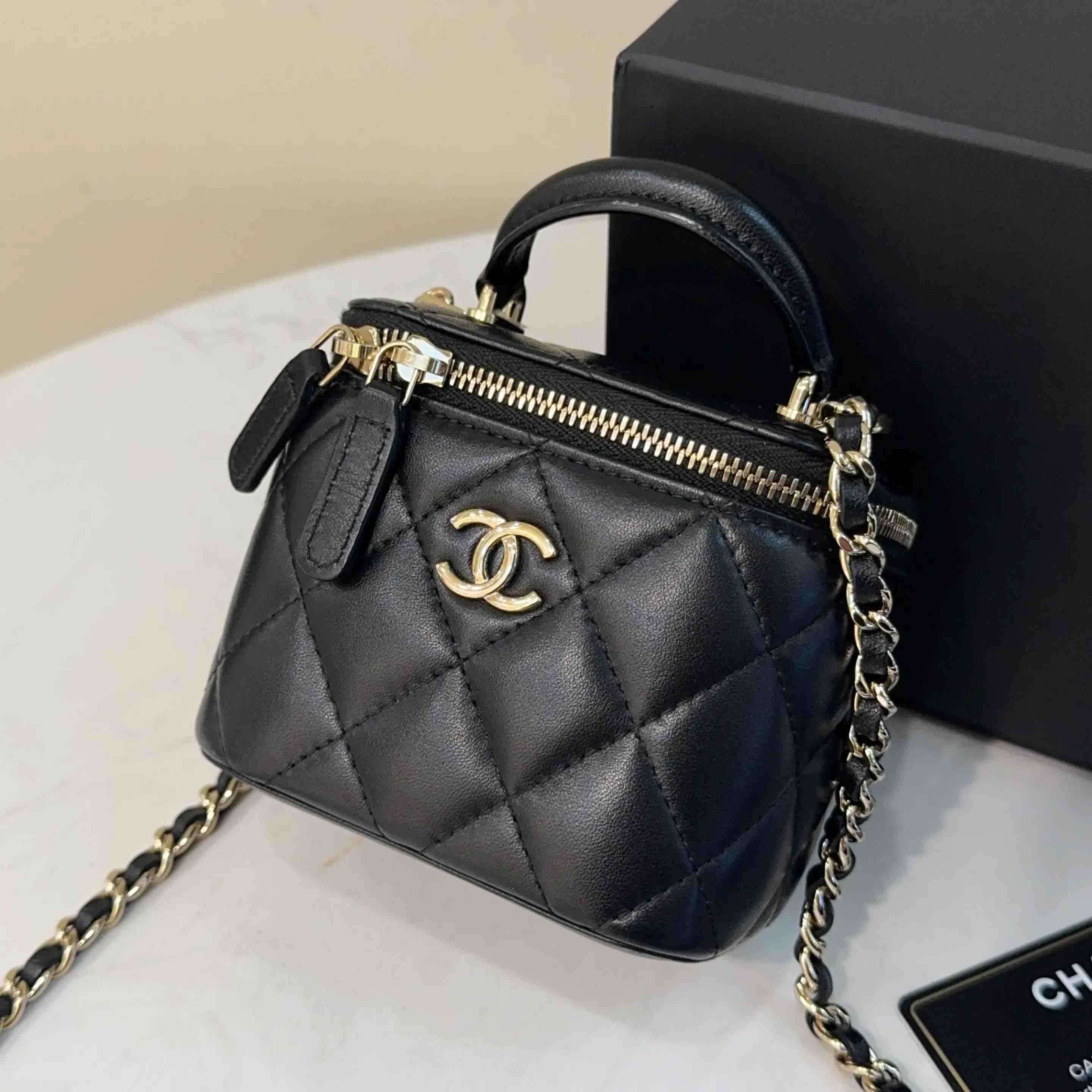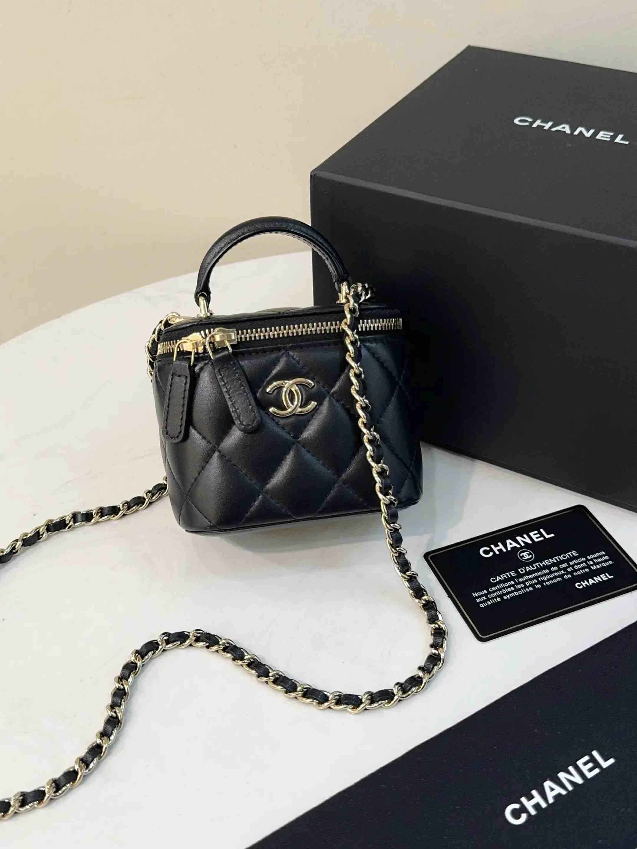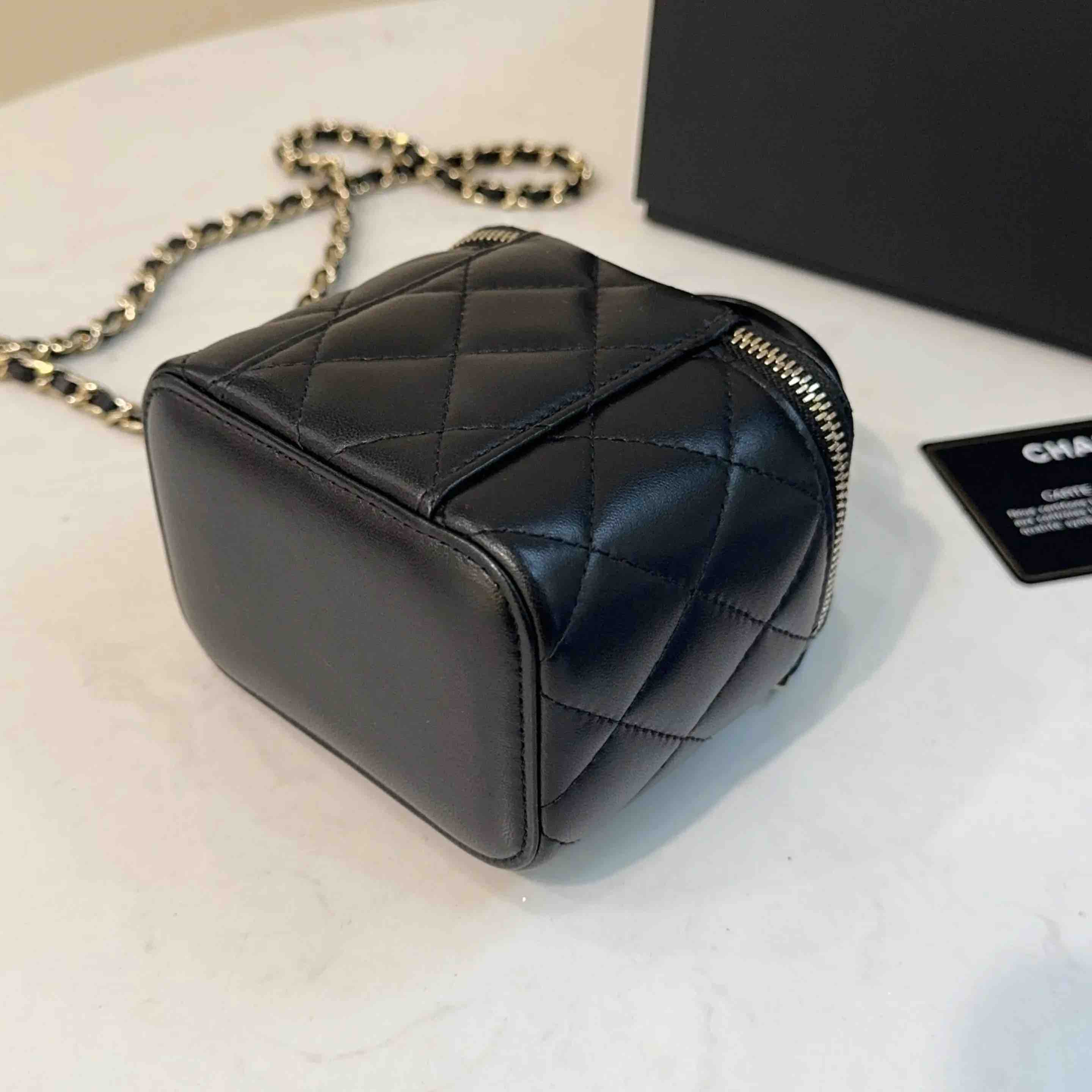 【商品详情】正品二手 CHANEL 21k 手柄 黑金 mini 羊皮 斜挎包🌟98新 10×9 配件:卡 防尘袋 盒子。21年季节限定 超级 mini 可爱🤩