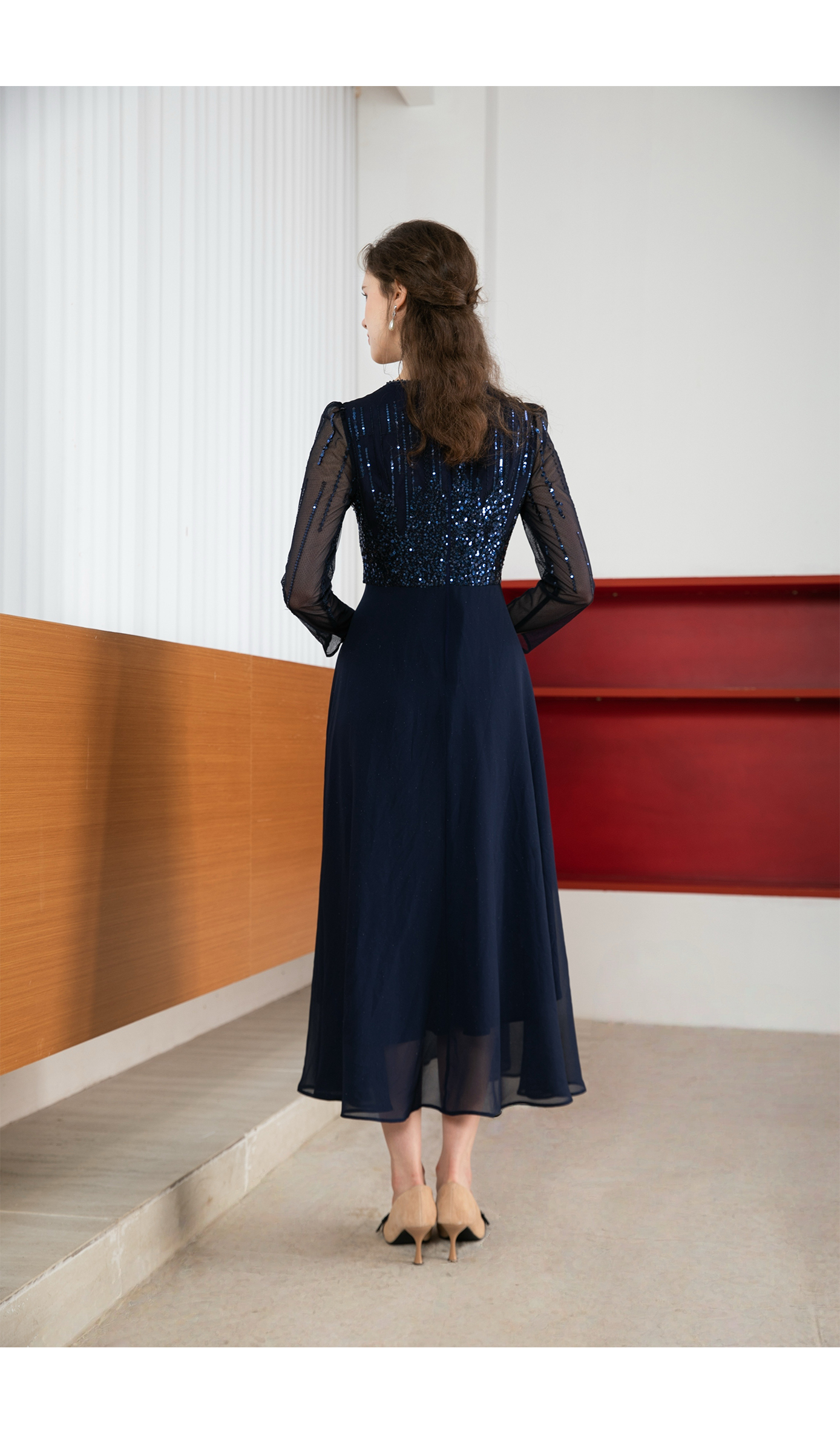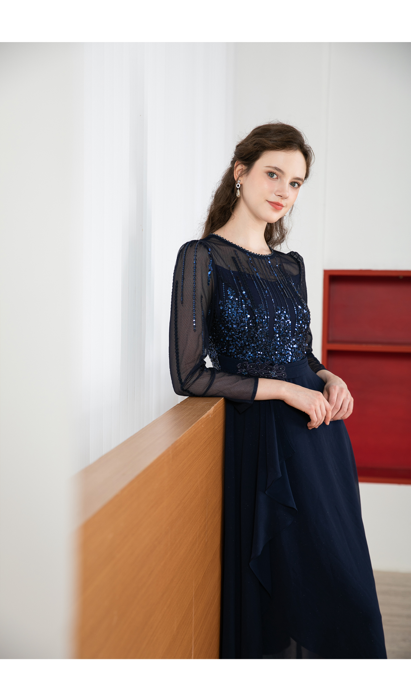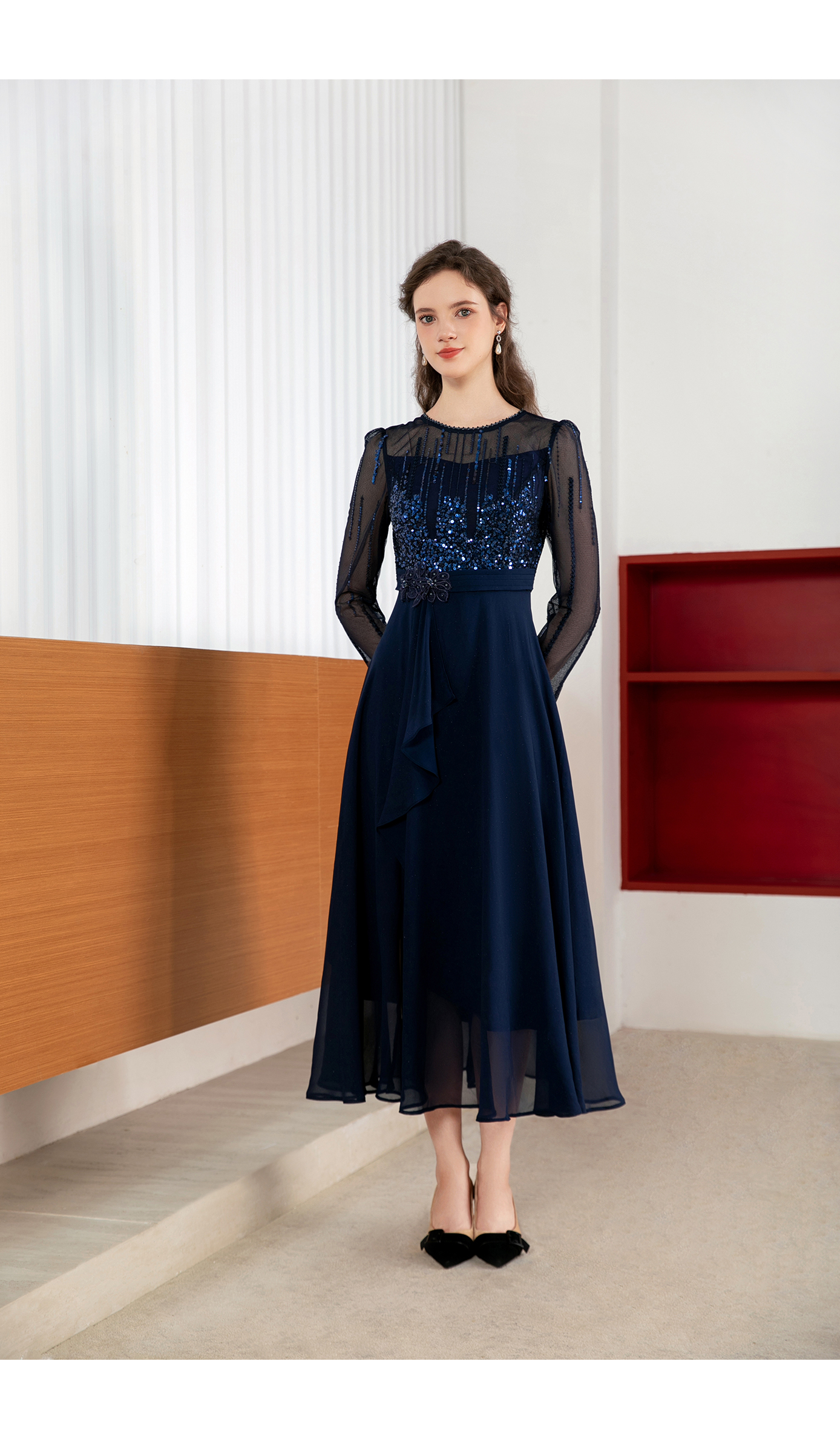 司歌修身亮片蕾丝连衣裙长袖修身A901211X