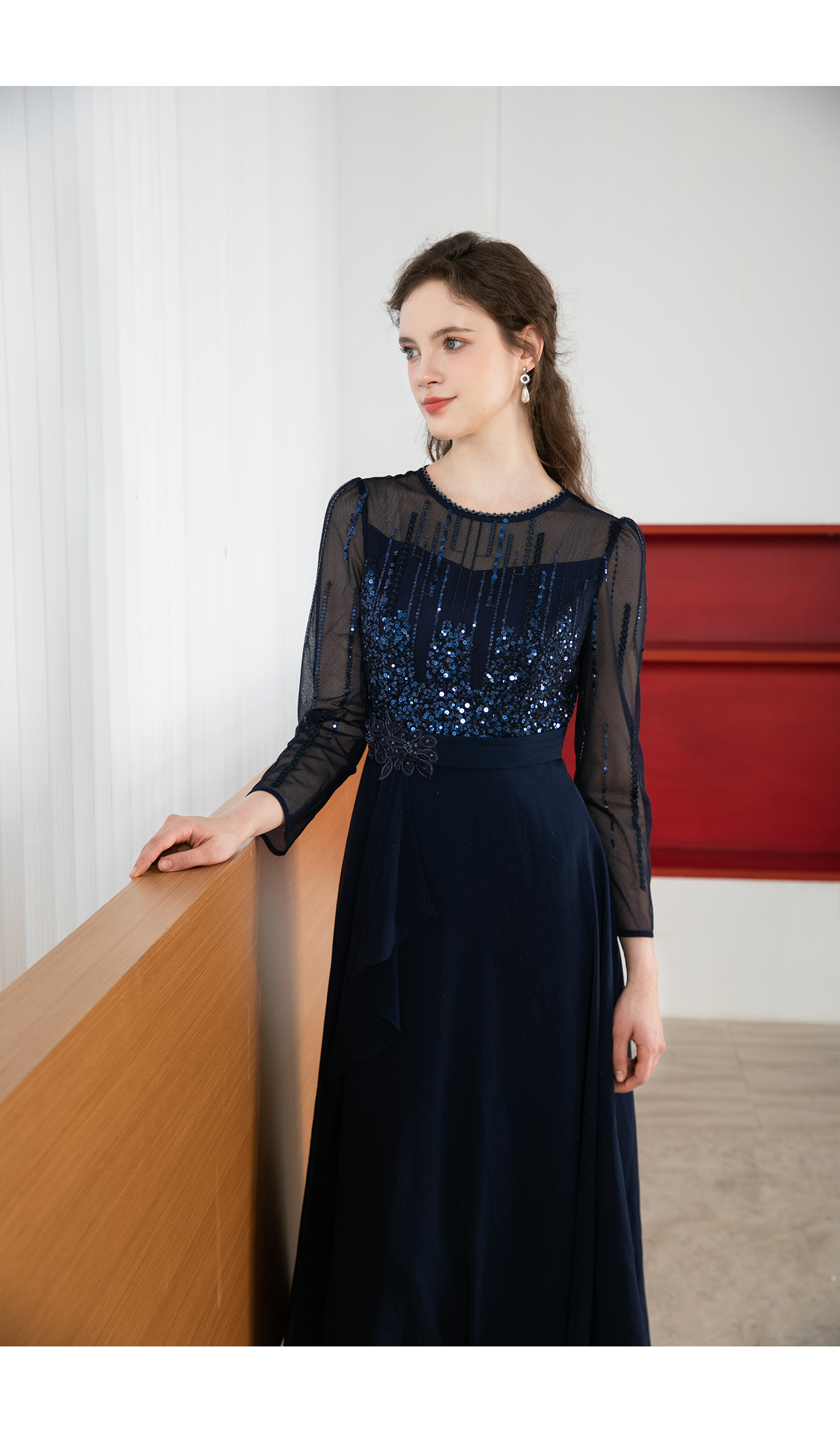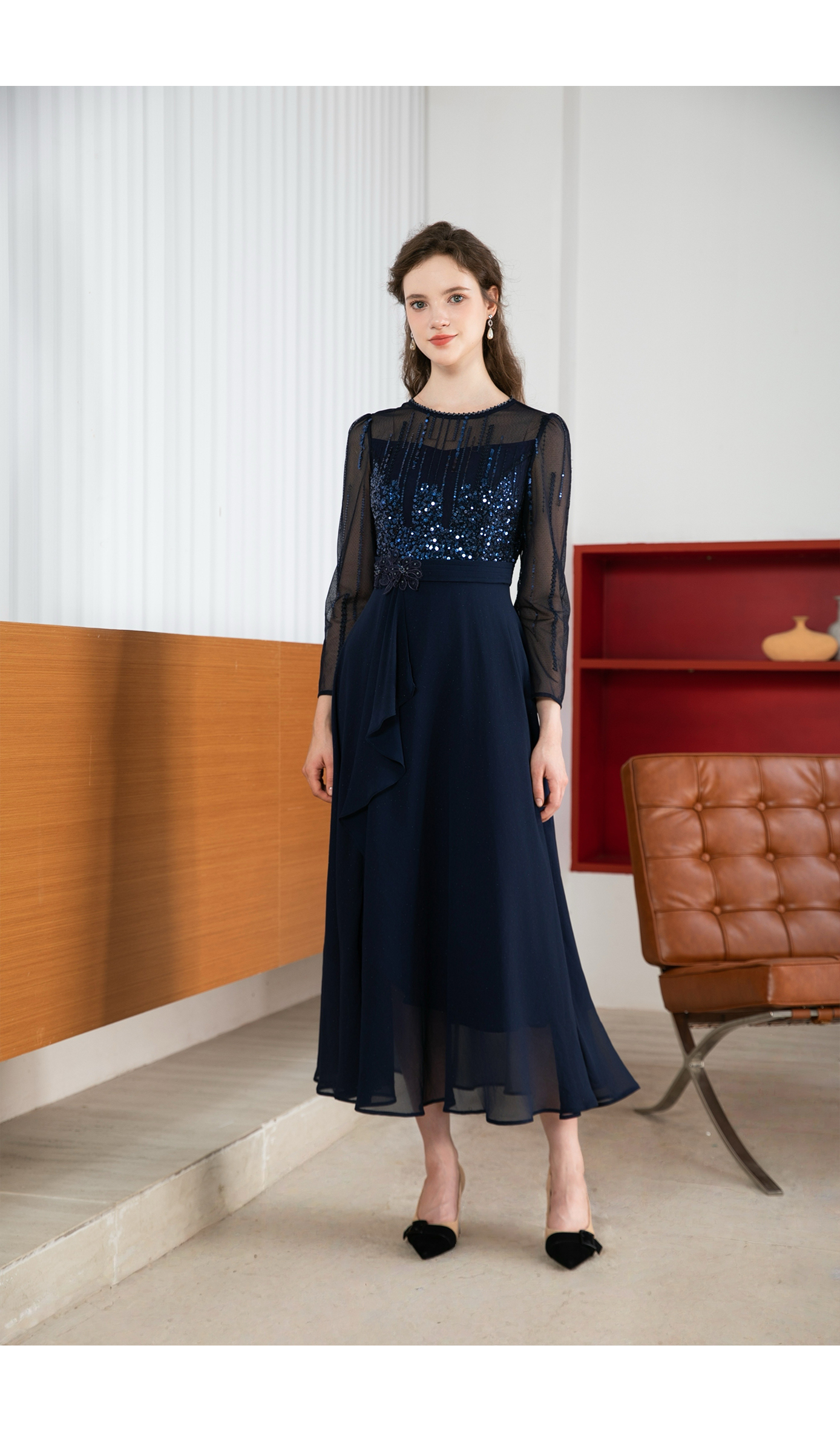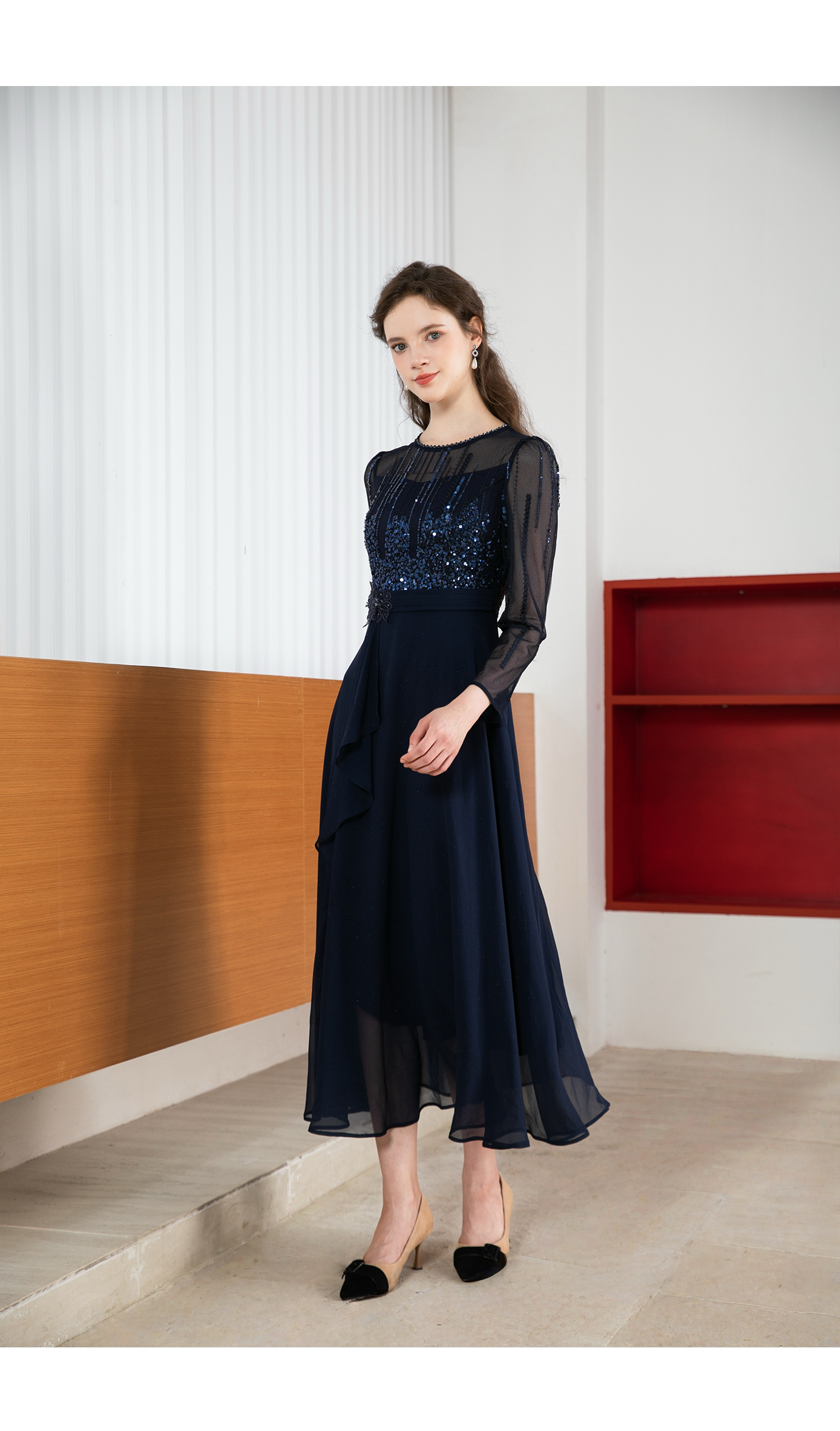 司歌修身亮片蕾丝连衣裙长袖修身A901211X