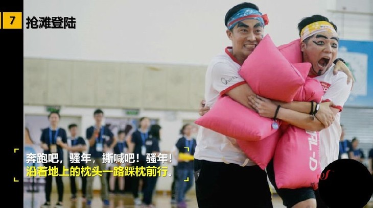 4组分为2批进行此游戏,每批其中第一组形成一通道,另一组派出4名队员,每个队员在身上各处绑上十个气球,听到口令后,以组为单位,迅速通过第一组形成的通道,第一组队员可用枕头砸闯关队员身上的气球,被砸队员手持枕头进行自我保护,在保证身上气球不被砸破的情况下,闯过通道!最后气球牺牲数量少的队伍获胜。