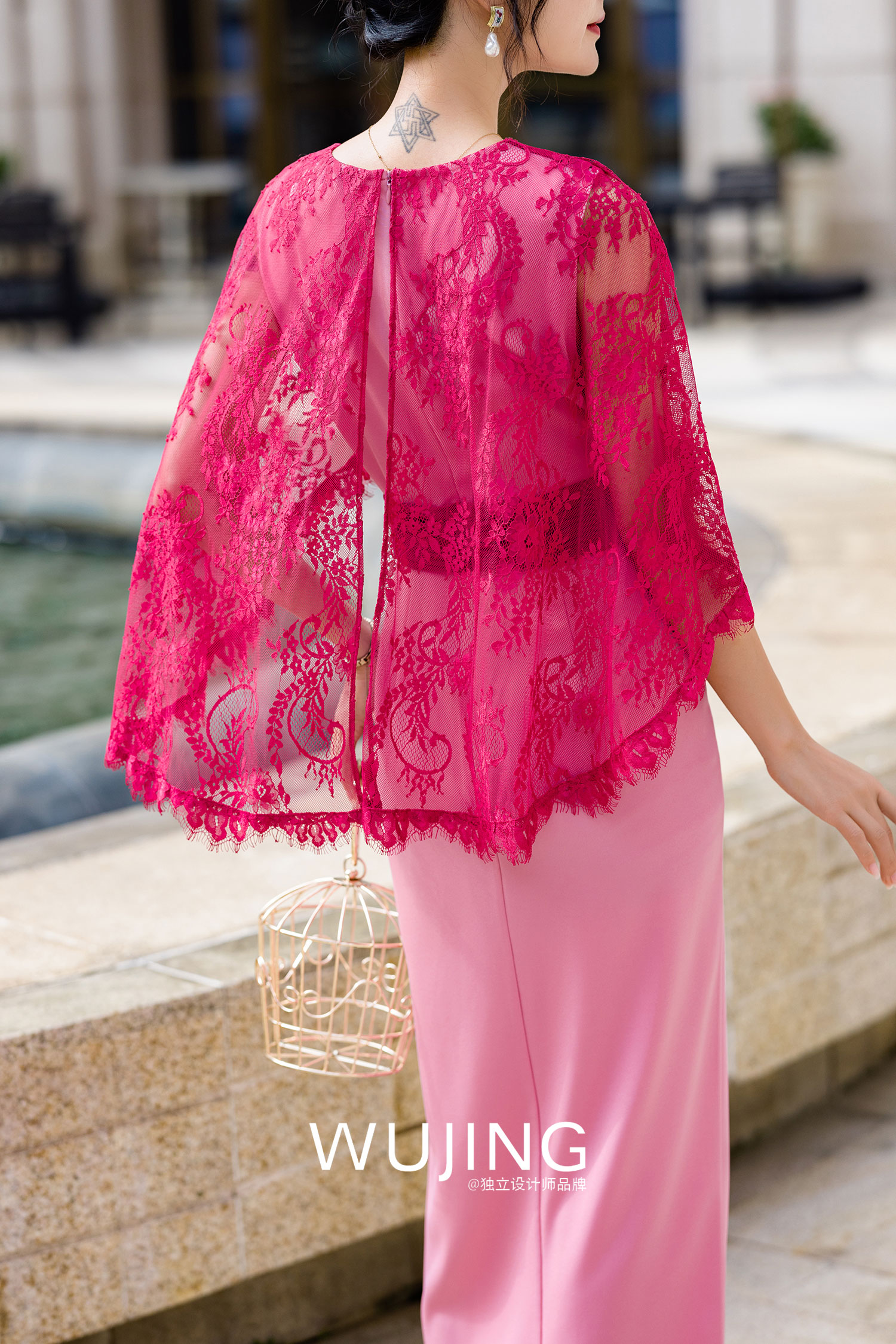 【雾境定制款】妖娆女人味定制丝绒烧花面料拼接股线蕾丝超级遮肉花苞裙 2202192