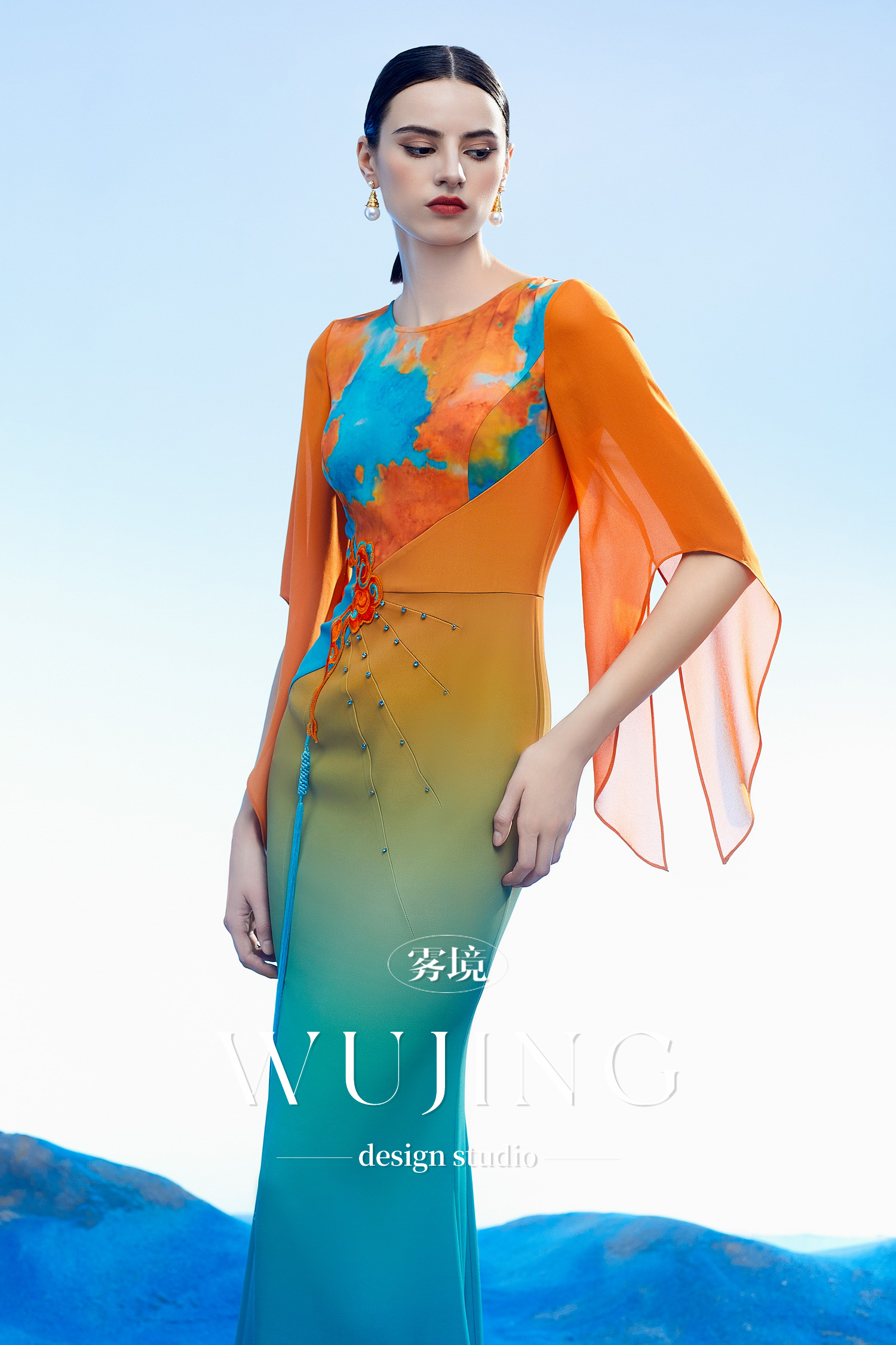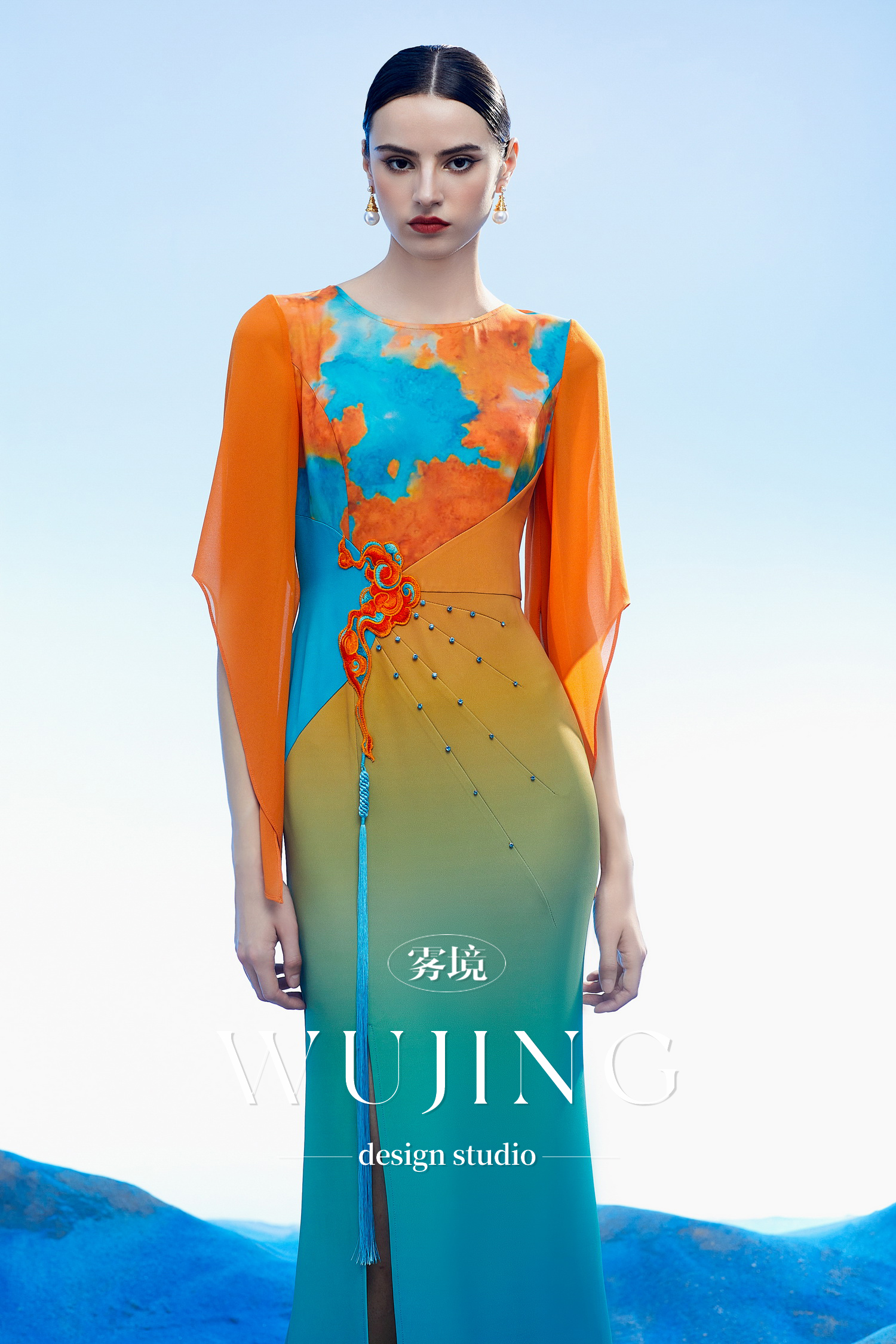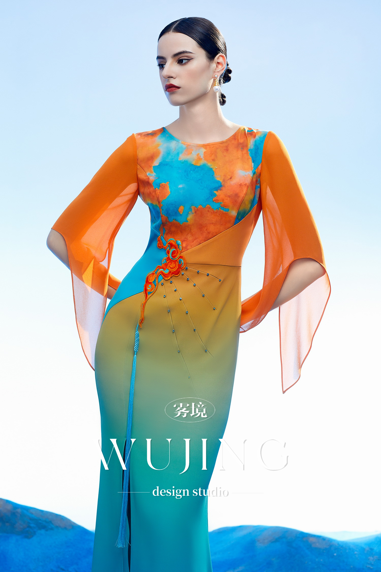 3204004 空桑秘境 韩国进口水晶乔其纱进口纹理蜂窝缎连衣裙 雾境