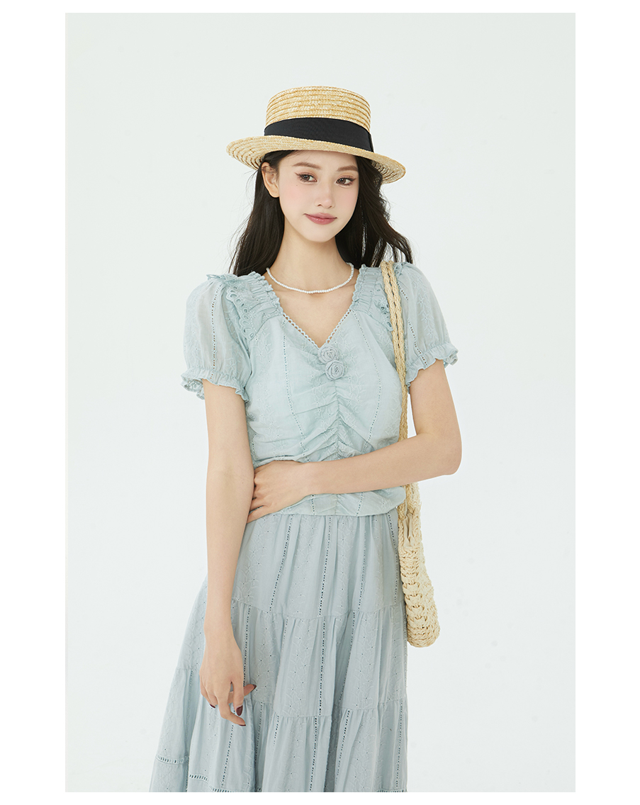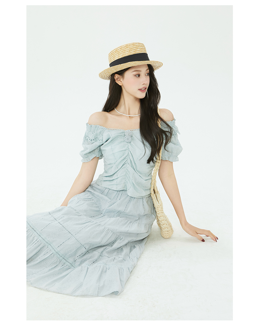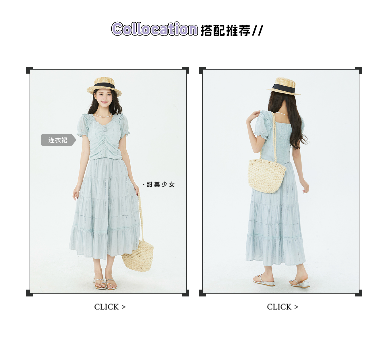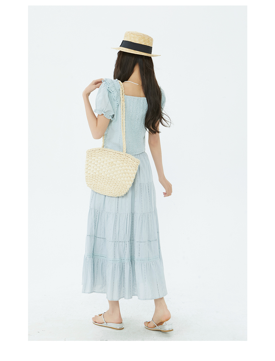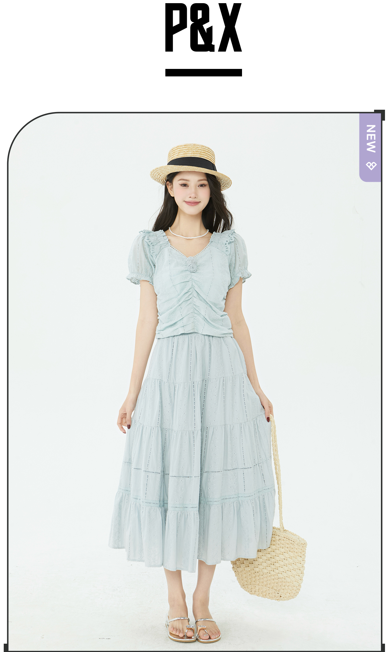 P&X设计师2025夏季分式连衣裙套装甜美泡泡袖长裙825214087 蓝色