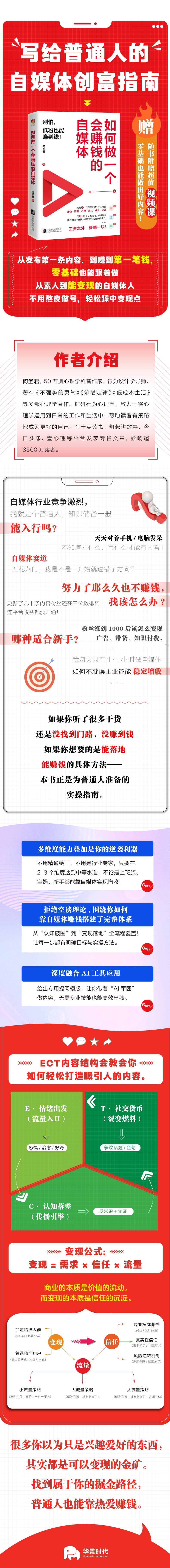 书中聚焦没优势没资源、不会用 AI 提效、有粉丝难变现、易焦虑断更等现代人做自媒体的核心困境,提供了一套系统化且易落地的解决方案。通过拆解 “四种差” 价值挖掘、三大蹭流量策略、四大变现模式,搭配AI实战技巧、课程搭建“黄金骨架”等实用工具,帮助读者重构自媒体运营逻辑,卸下流量焦虑,掌握从内容创作到做课出版的完整变现路径。