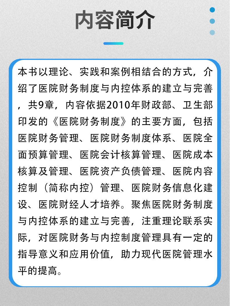 本书以理论、实践和案例相结合的方式,介绍了医院财务制度与内控体系的建立与完善,共9章,内容依据2010年财政部、卫生部印发的《医院财务制度》的主要方面,包括医院财务管理、医院财务制度体系、医院全面预算管理、医院会计核算管理、医院成本核算及管理、医院资产负债管理、医院内容控制(简称内控)管理、医院财务信息化建设、医院财经人才培养。聚焦医院财务制度与内控体系的建立与完善,注重理论联系实际,对医院财务与内控制度管理具有一定的指导意义和应用价值,助力现代医院管理水平的提高。