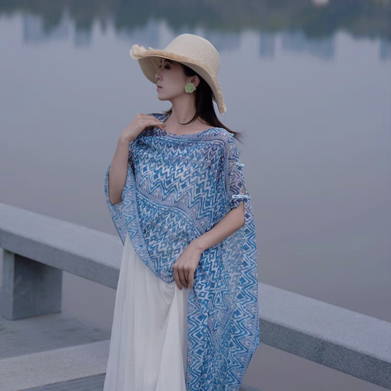 💫民族风盘扣披肩夏日必备 这不仅仅是一件披肩,它是新疆,海边,沙漠,草原旅游的必备神器,是民族风的活招牌! 盘扣设计,扎染蓝给人一种清凉又神秘的感觉,穿上它,立刻提升你的时尚度! 轻薄透气,即使在炎炎夏日也能保持清凉,而且还能作为拍照道具,旅游出片必备!📸