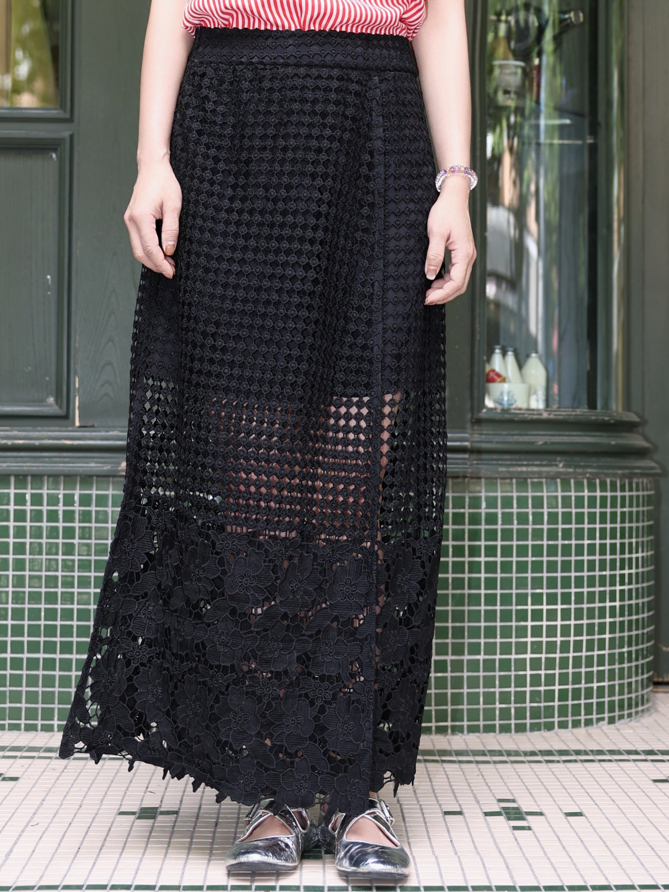 TYNVIE 黑色花卉钩针蕾丝拼接开衩长裙