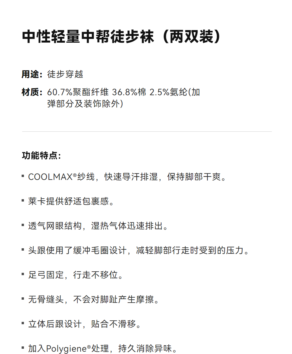 KAILAS凯乐石 中性轻量中帮徒步袜(两双装)KH2502022【Z】