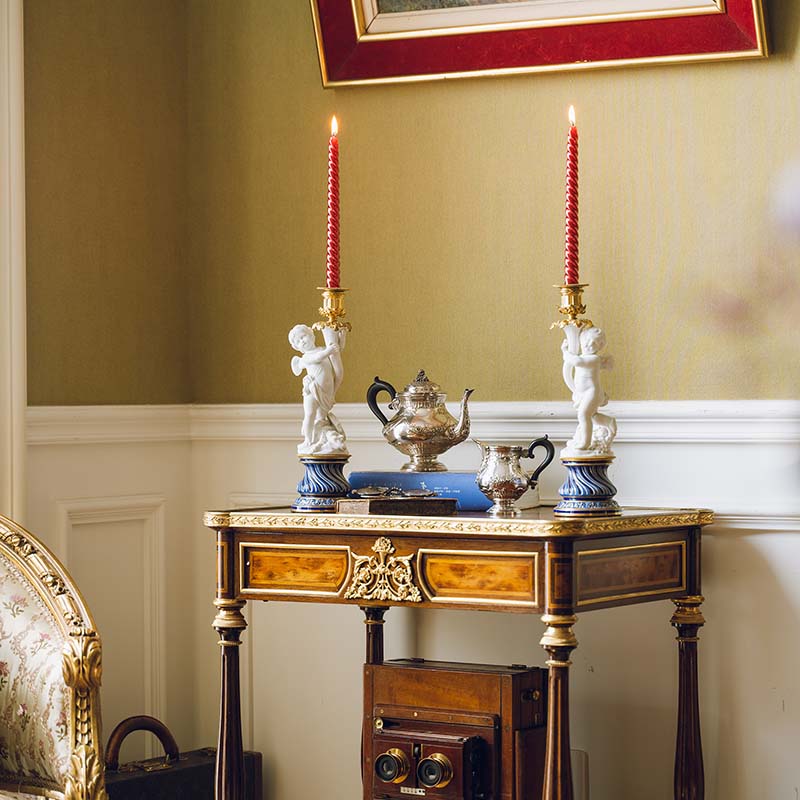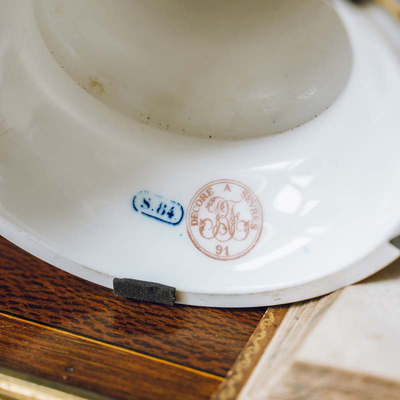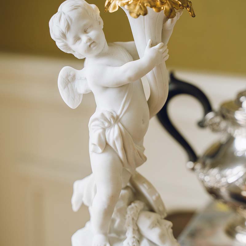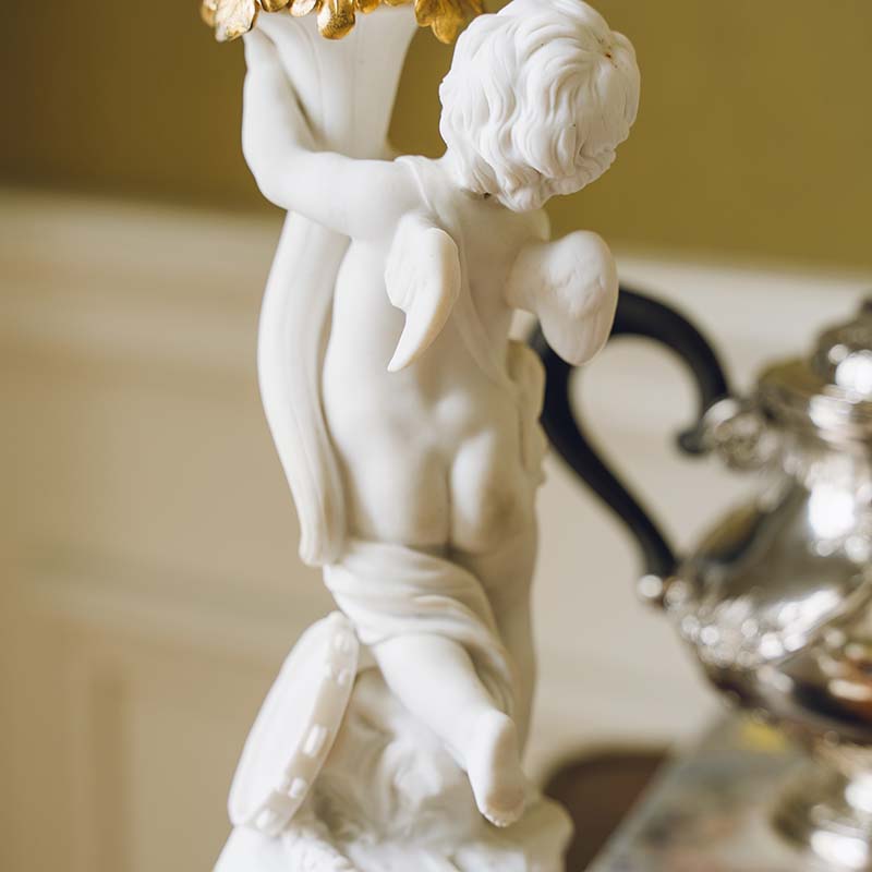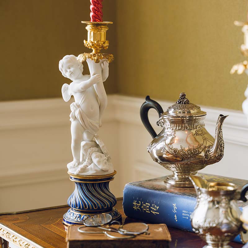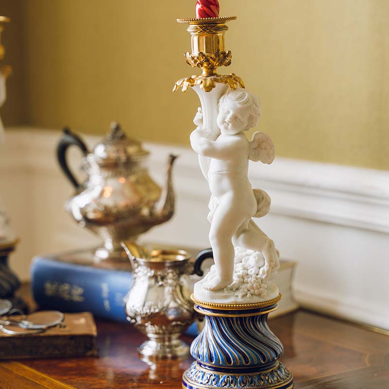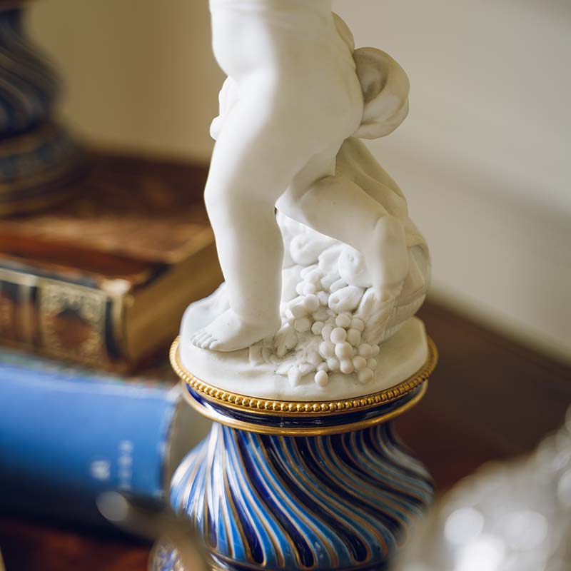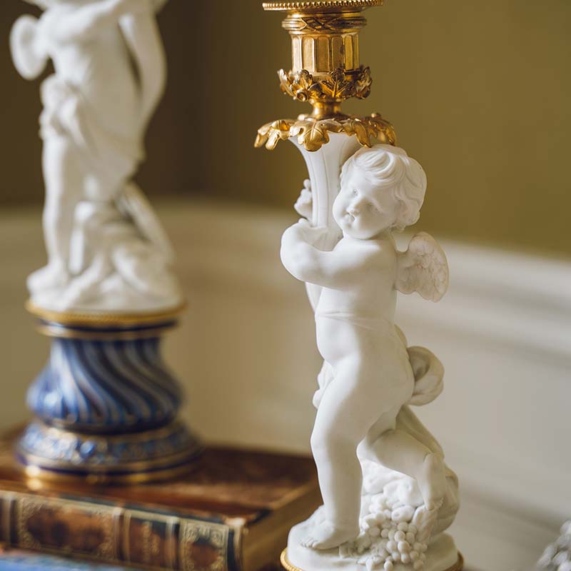 【已售】独角鹿西洋古董 1891年代法国御窑塞弗尔签名出品蓝釉描金底座装饰布歇小天使主题素胎瓷雕塑及铜鎏金精雕烛台一对