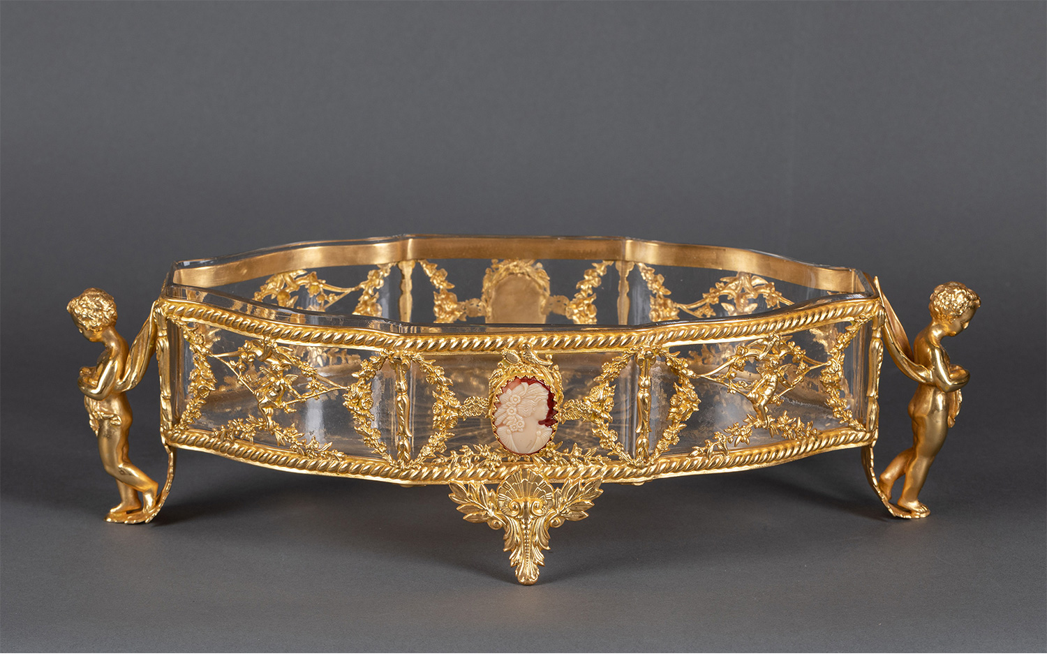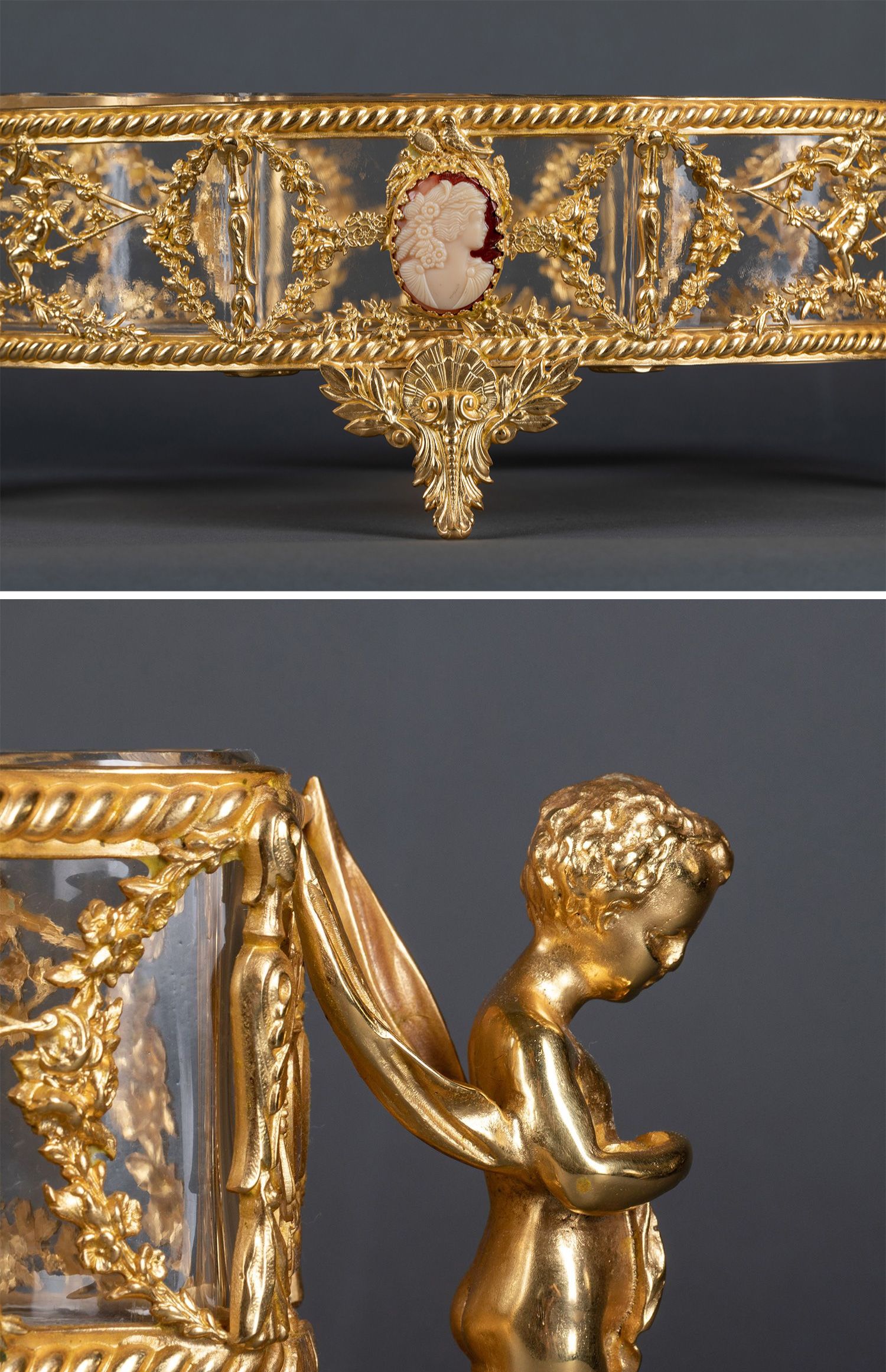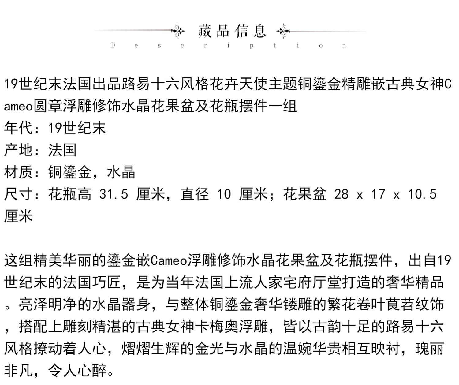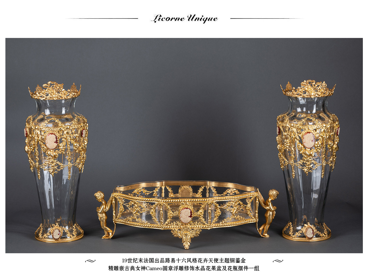 独角鹿西洋古董法国铜鎏金古典女神Cameo浮雕水晶花果盆花瓶摆件