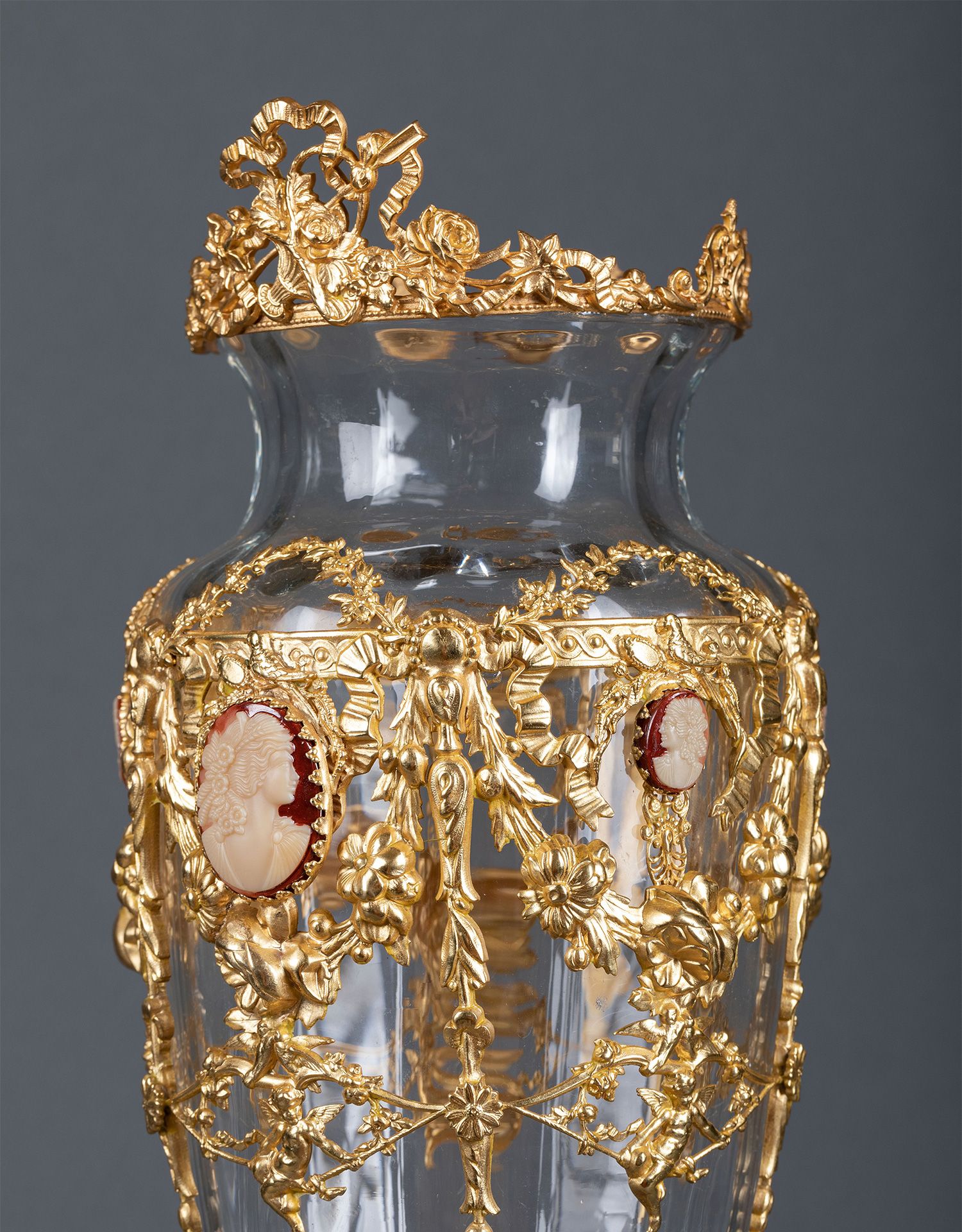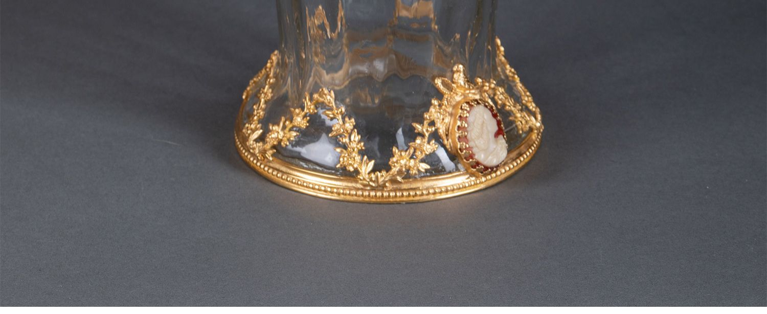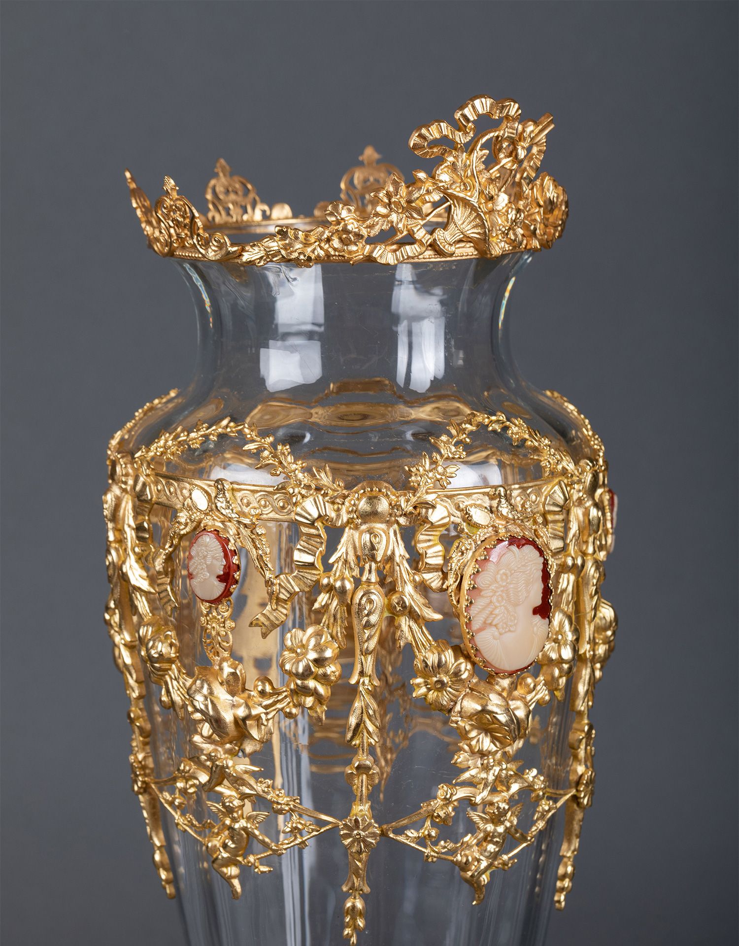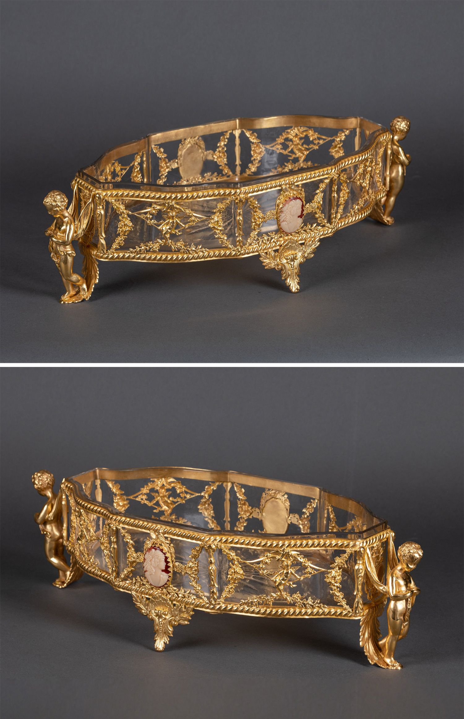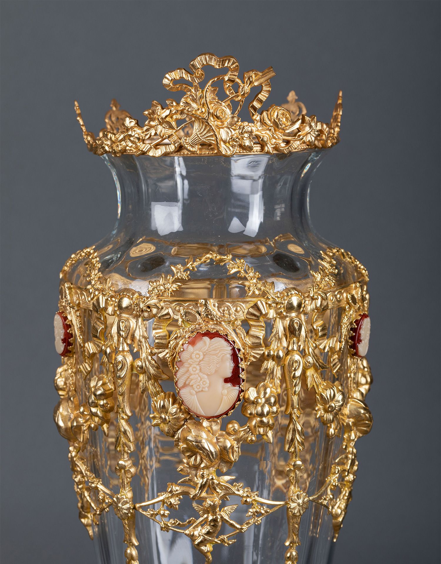 独角鹿西洋古董法国铜鎏金古典女神Cameo浮雕水晶花果盆花瓶摆件