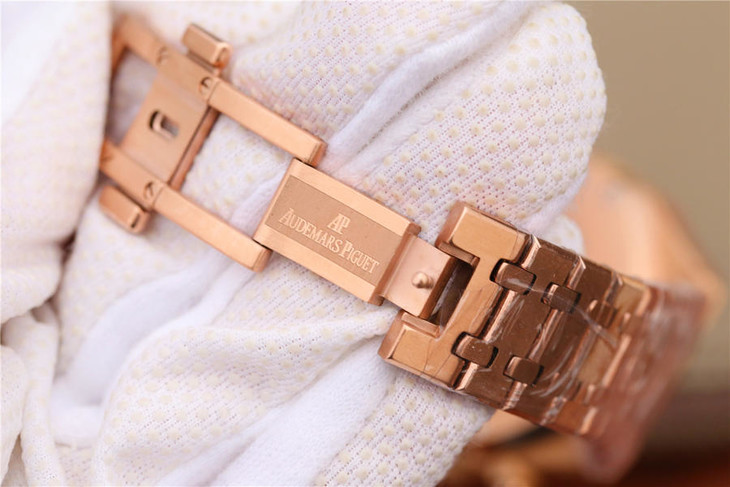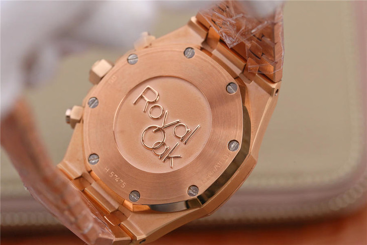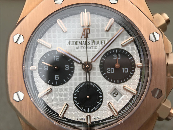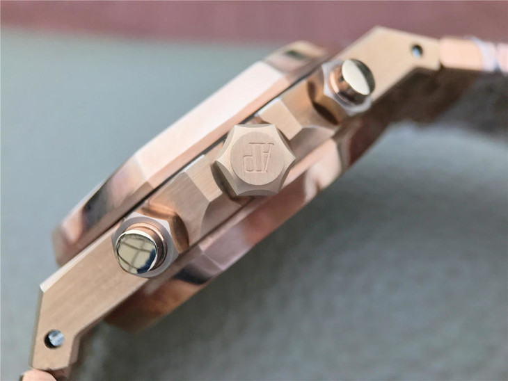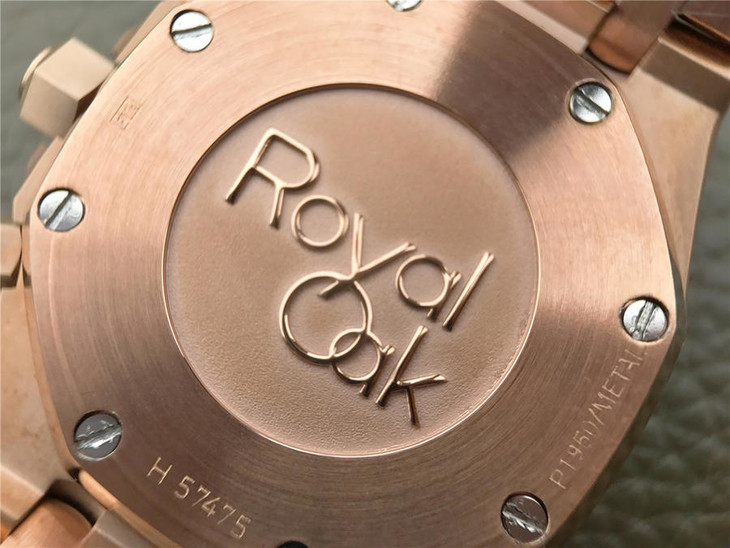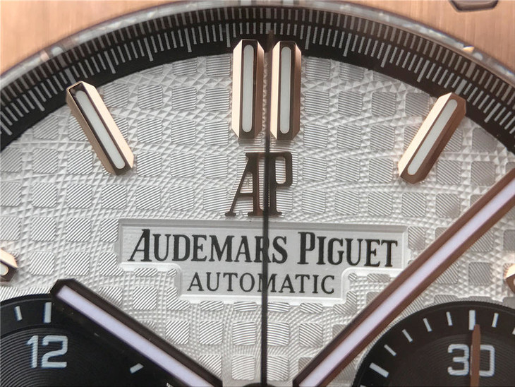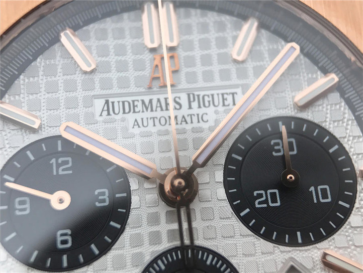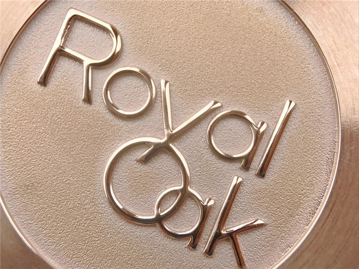 表盘材质:镌刻“Grande Tapisserie”大格纹装饰,玫瑰金色副表盘,搭配玫瑰金荧光立体时标和皇家橡树指针