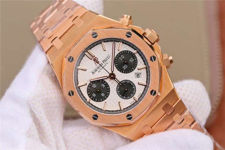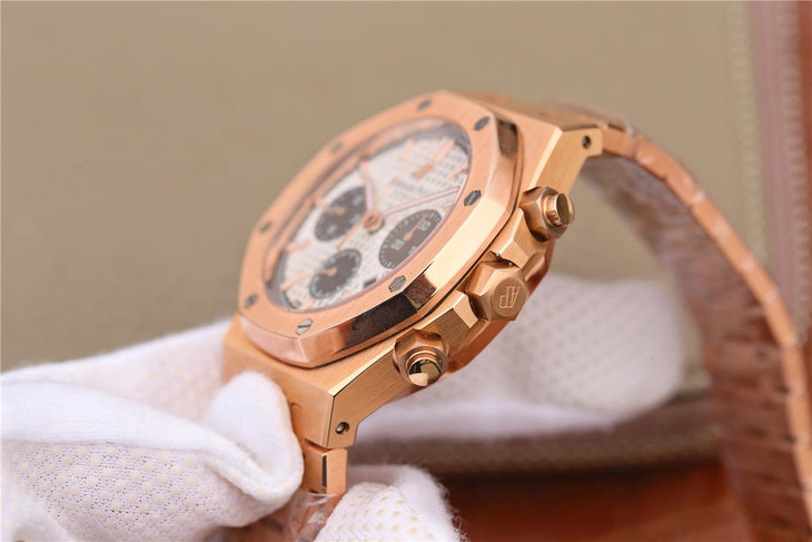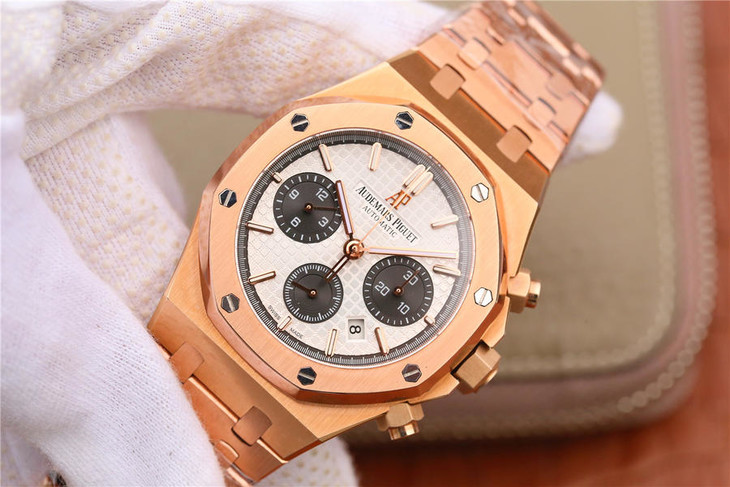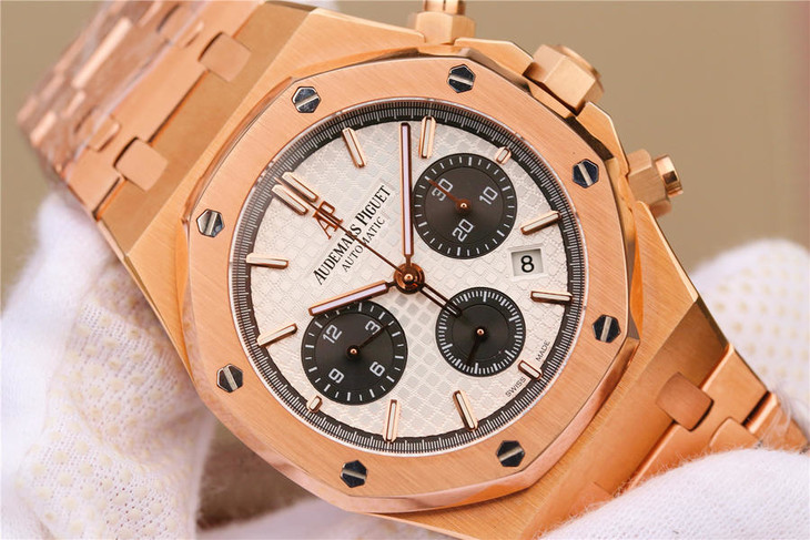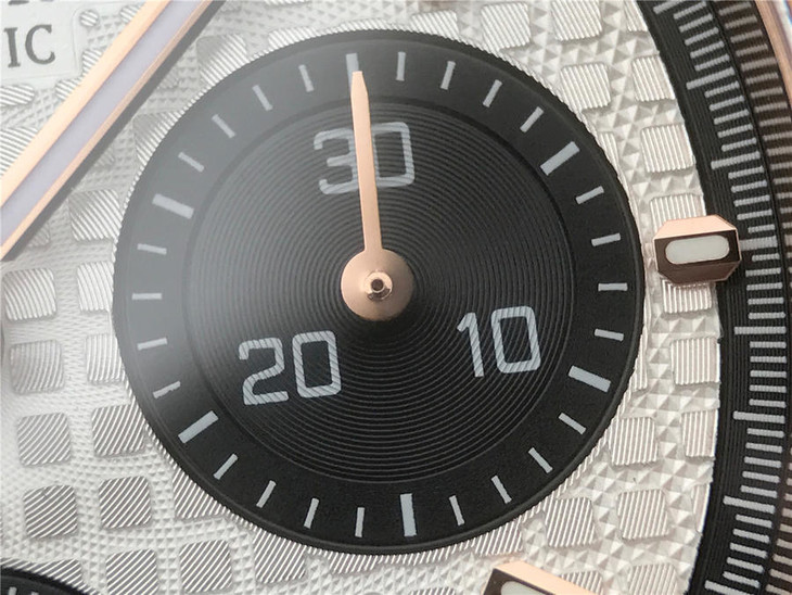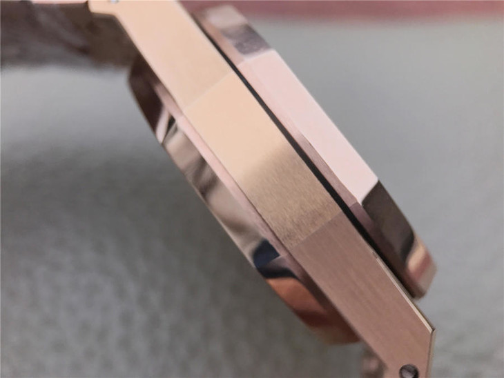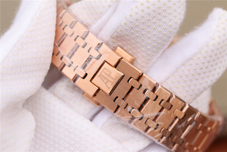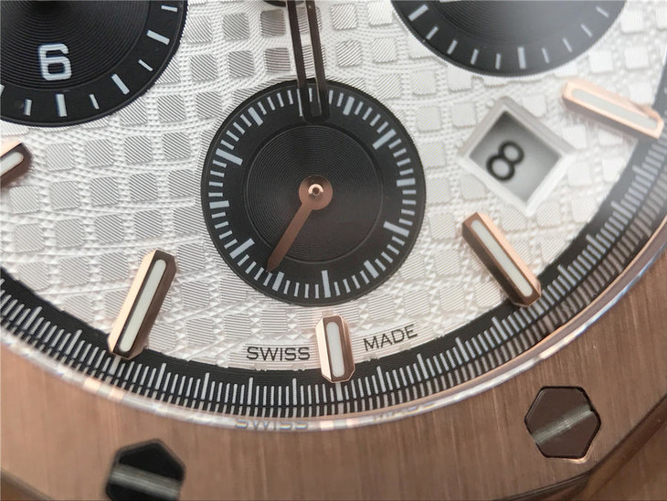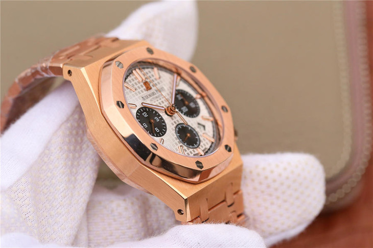 表盘材质:镌刻“Grande Tapisserie”大格纹装饰,玫瑰金色副表盘,搭配玫瑰金荧光立体时标和皇家橡树指针