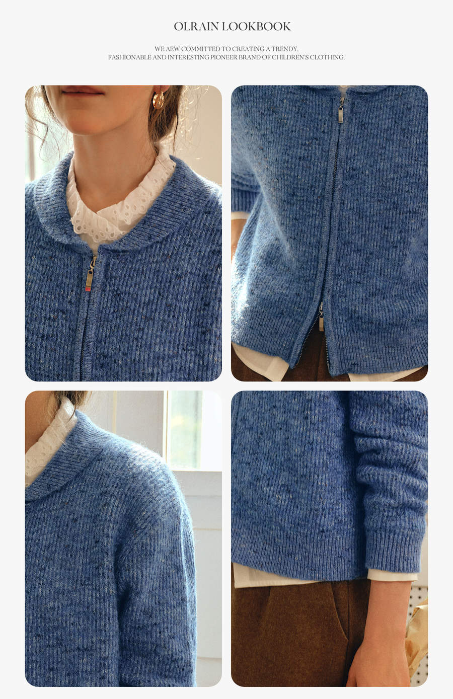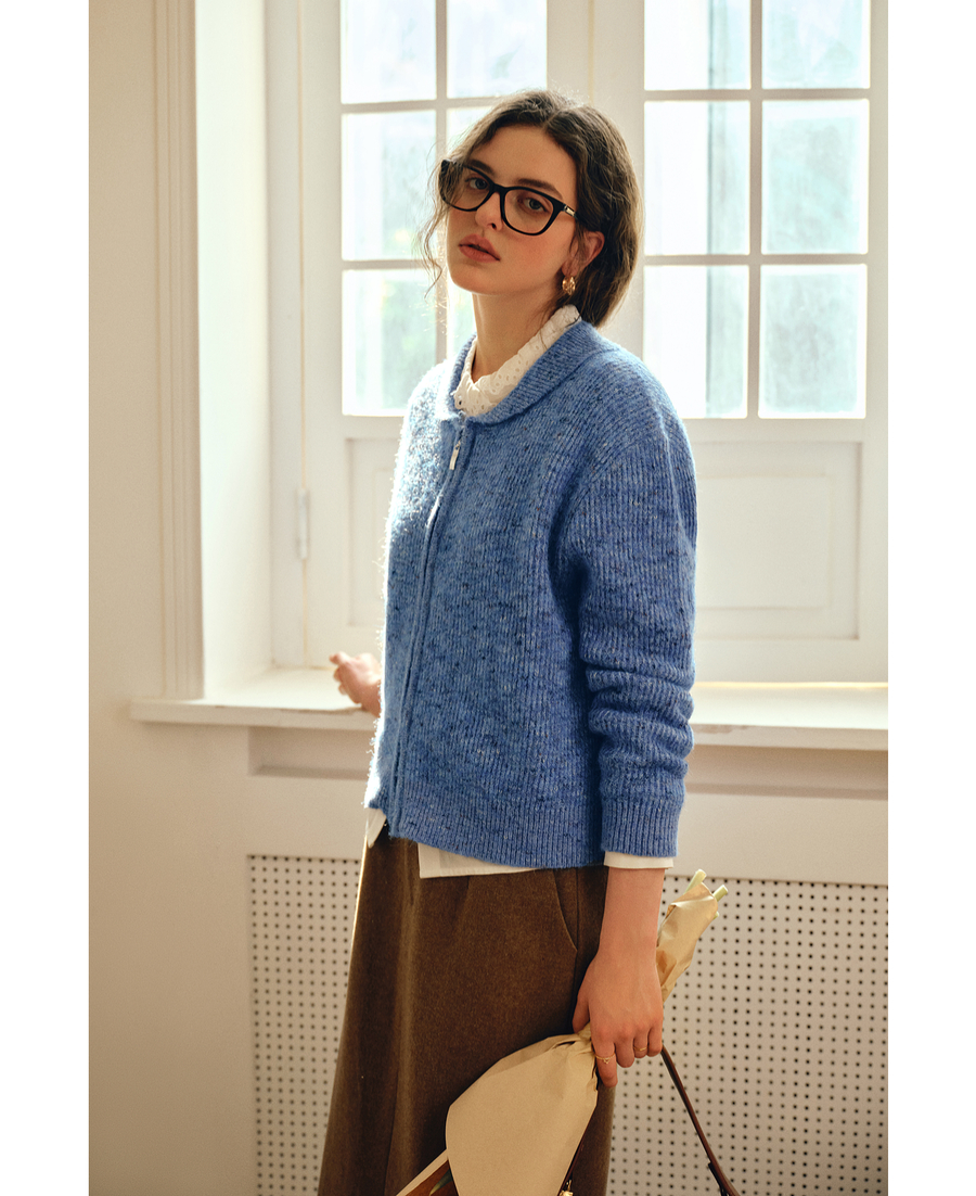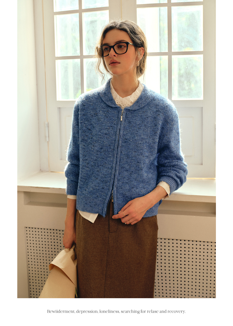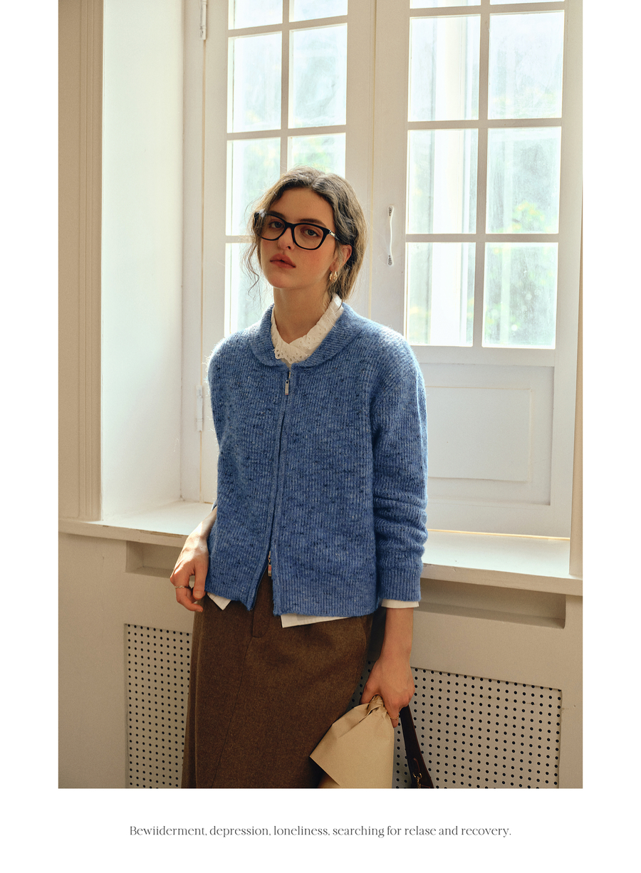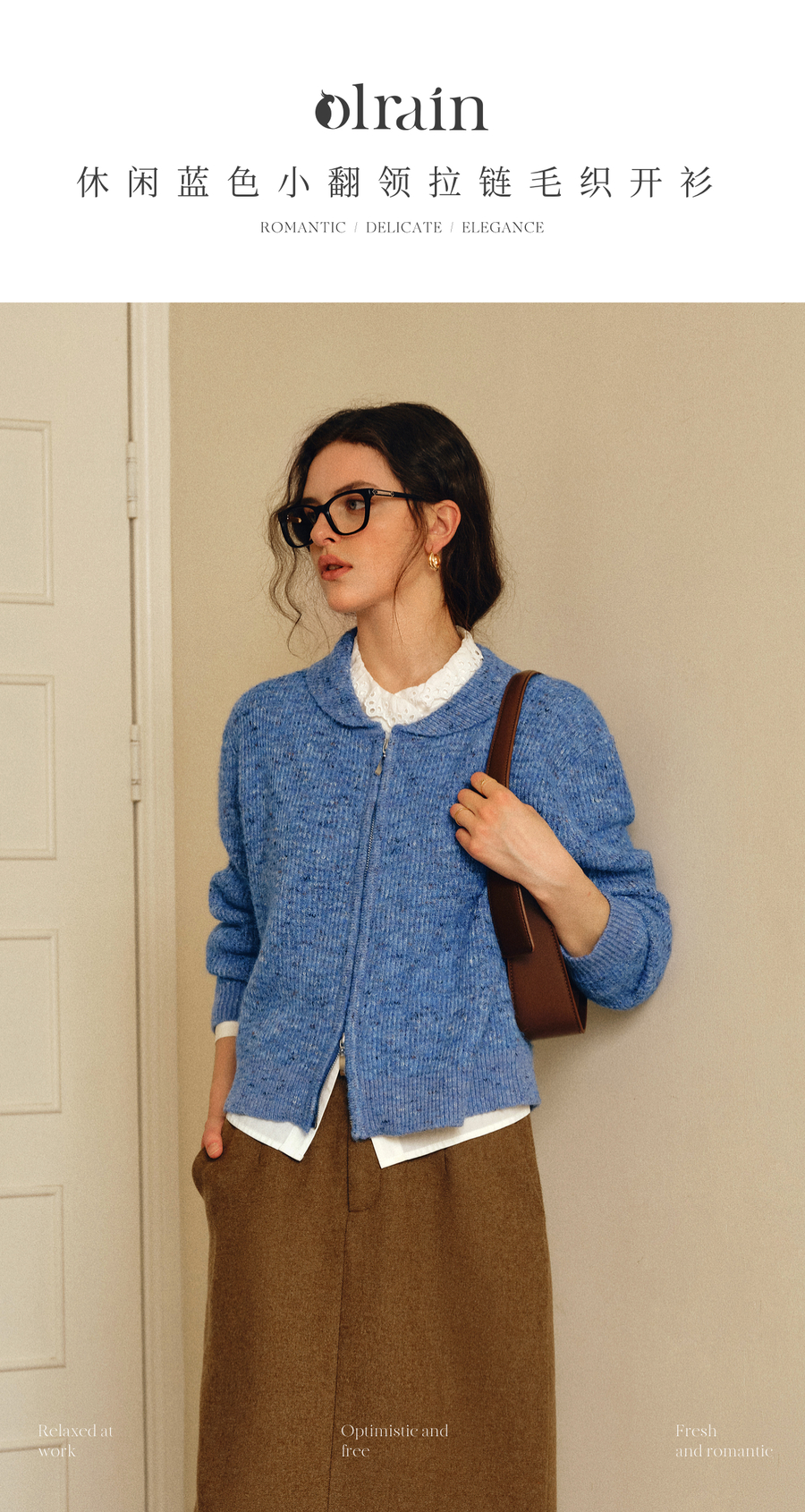 OLrain欧芮儿2025新款女秋季休闲蓝色小翻领拉链毛针织开衫羊毛衣