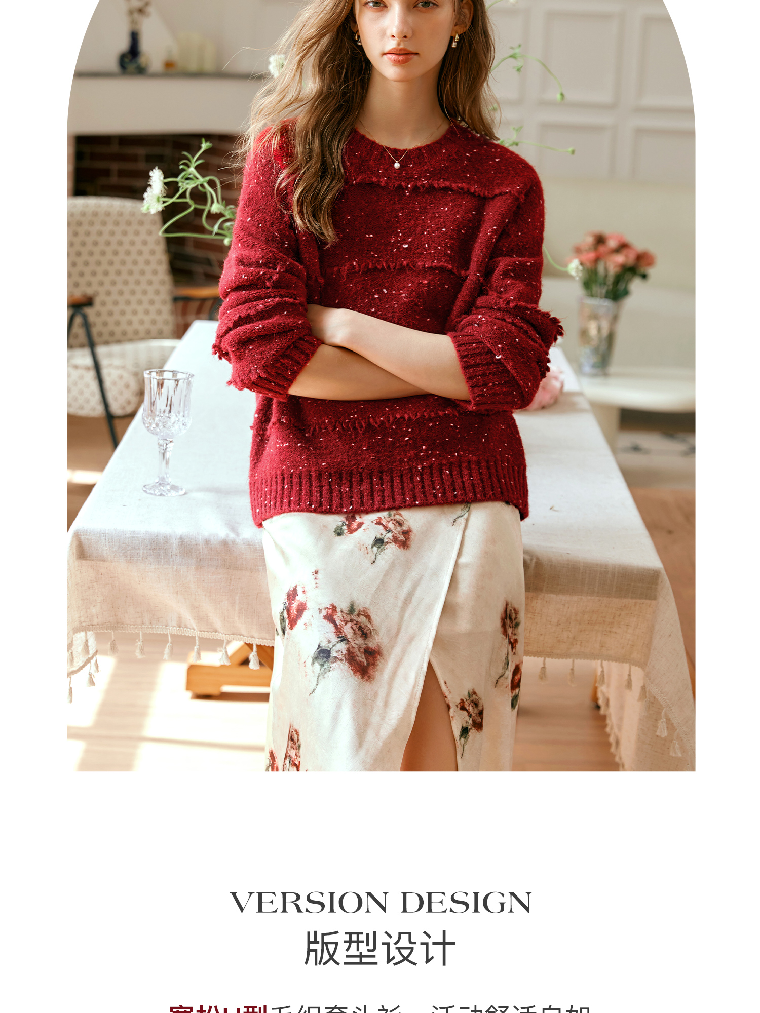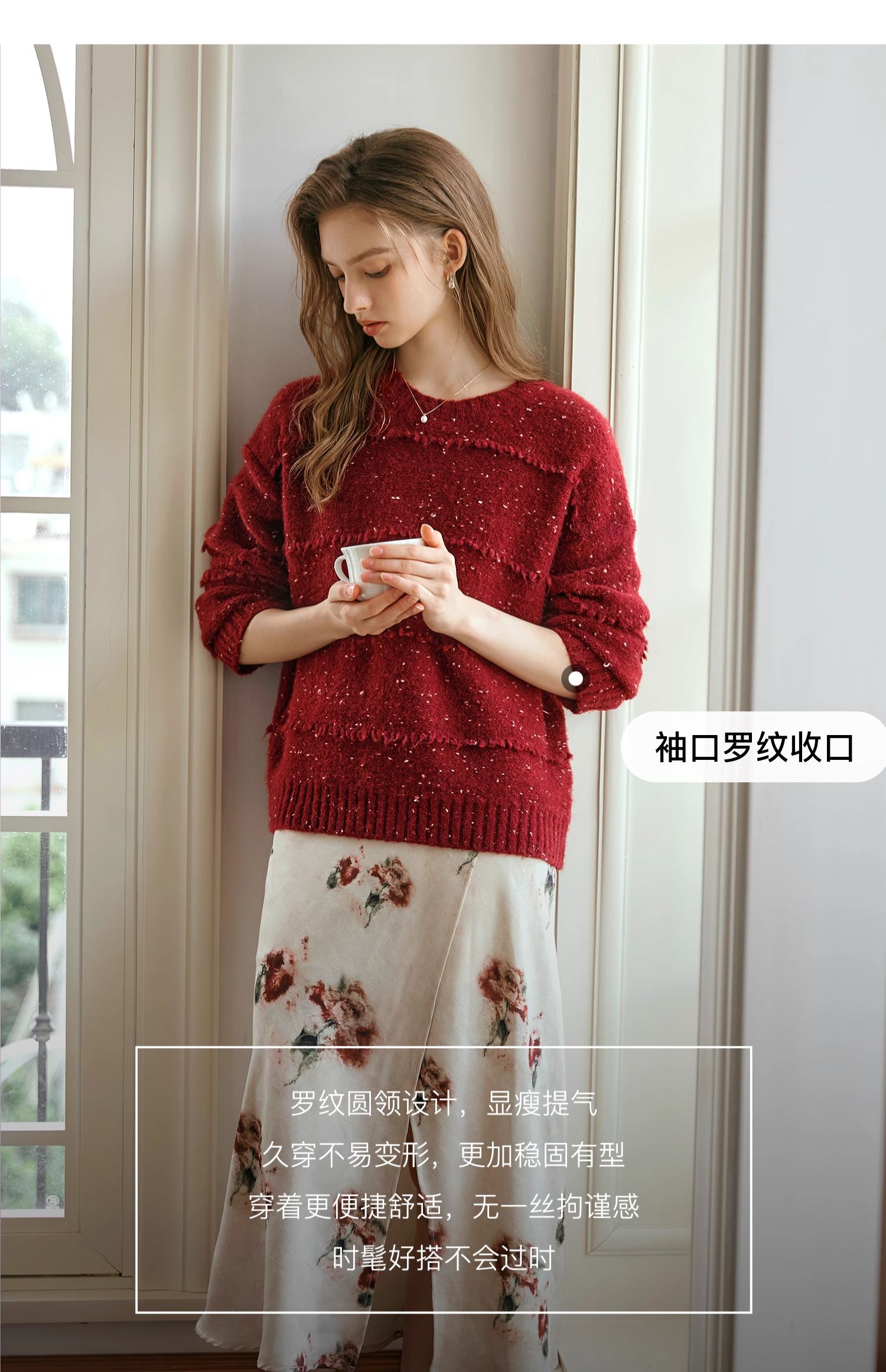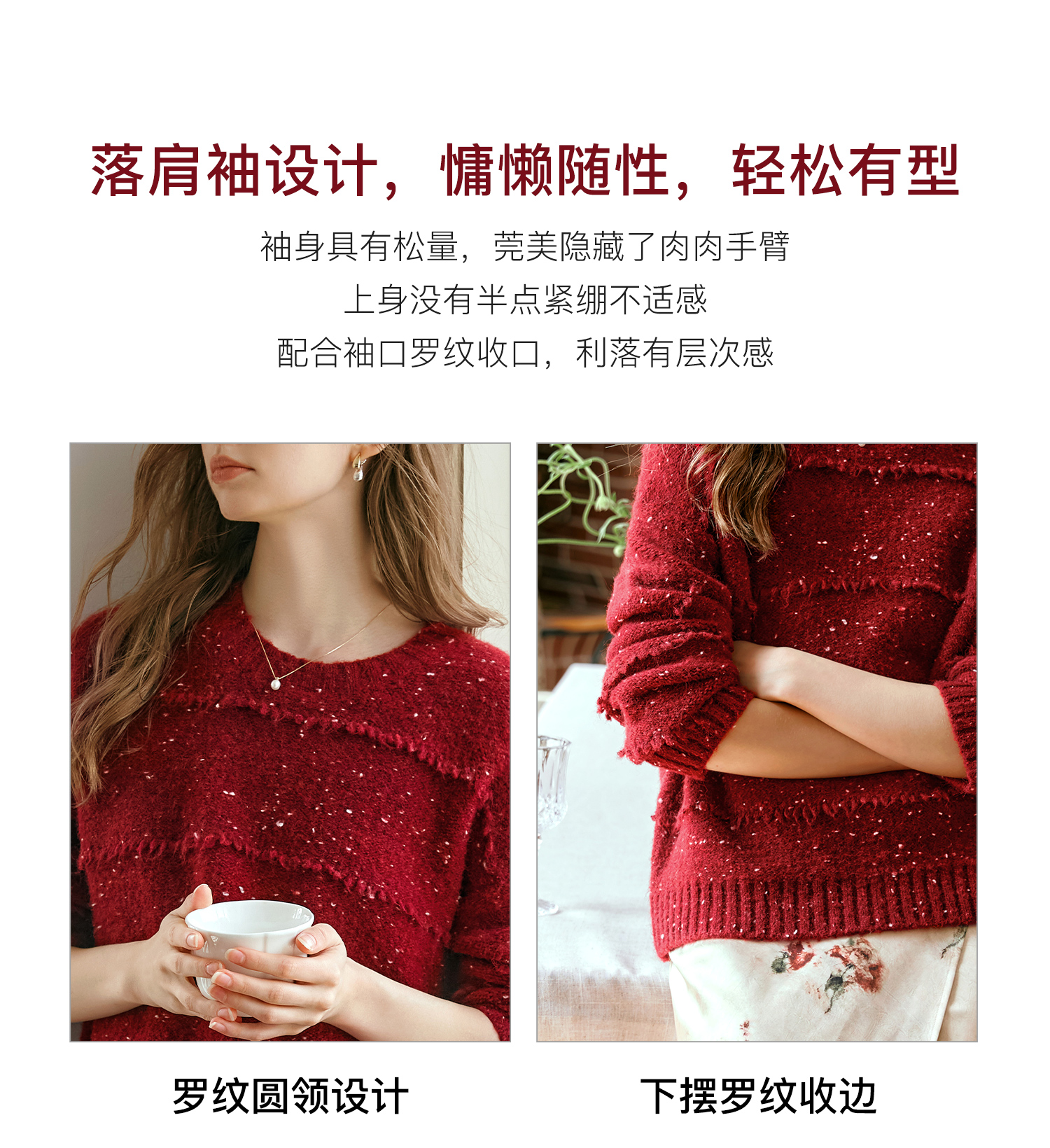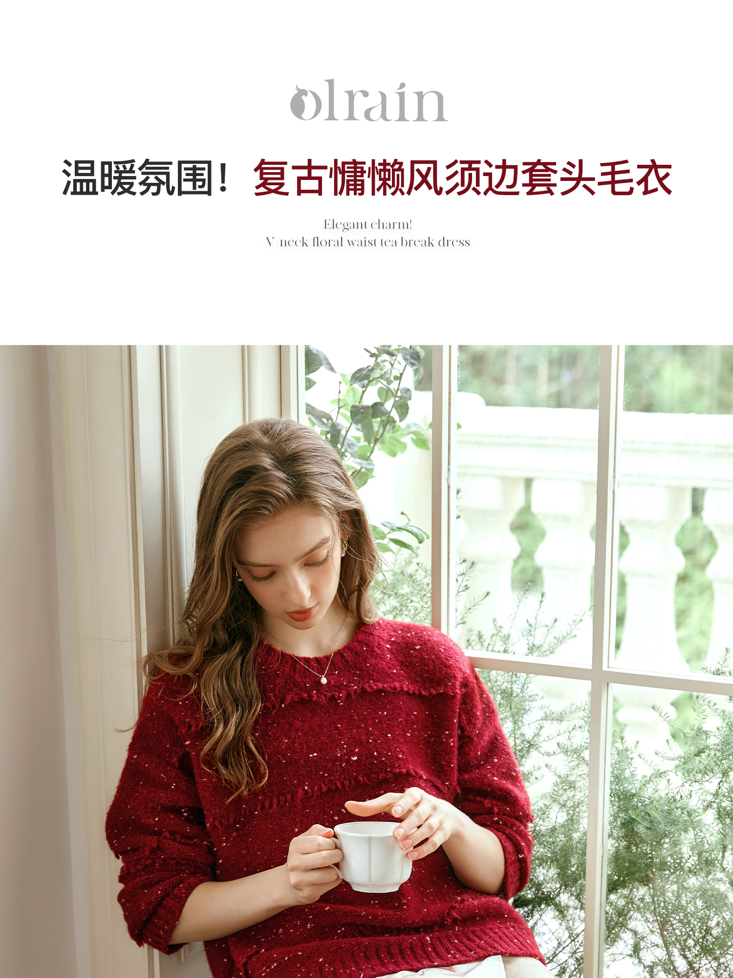 OLrain欧芮儿法式酒红色毛衣女秋季2024年新款复古宽松简约上衣