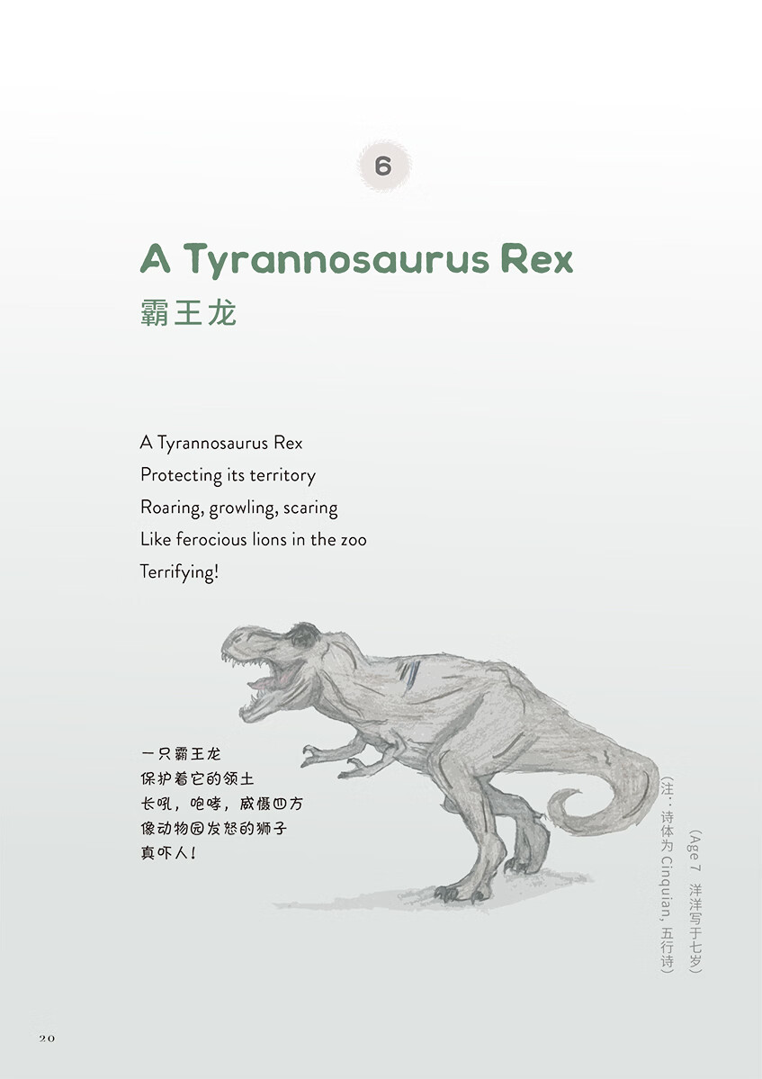 洋洋五岁时疯狂地爱上恐龙。通过她对恐龙的态度,我完整地了解了"热爱""钟爱""痴迷"这些词对应着哪些具体行动。她研究遍了所有能发现的恐龙资料、做了几百种不同恐龙的调查报告,而这时她只有六岁!做了两年的"恐龙小姐"后,洋洋转向研究海洋生物和其他野生动物。她就读的小学曾颁给她一张奖状 --"野生动物独立调查者"。