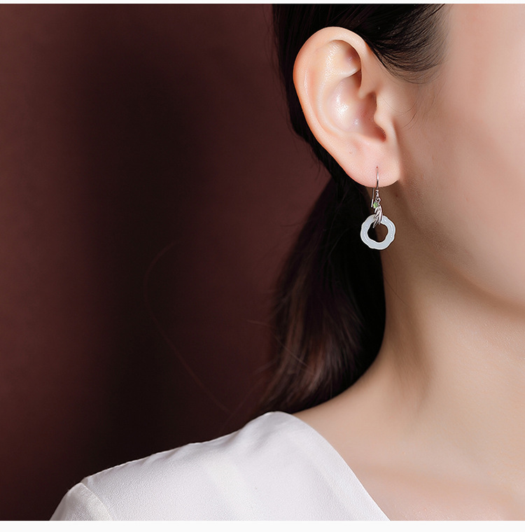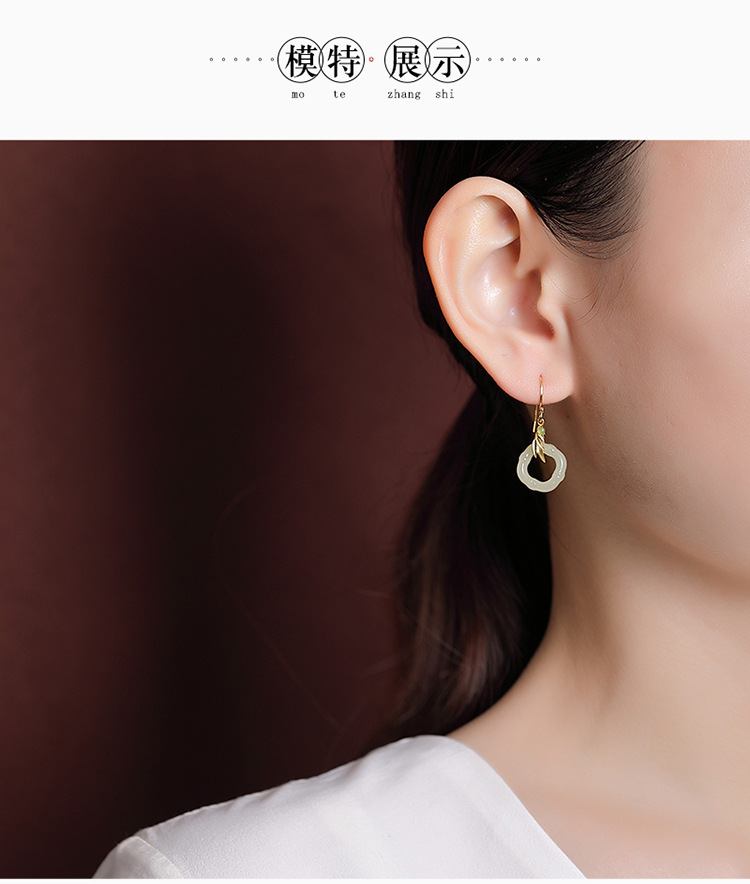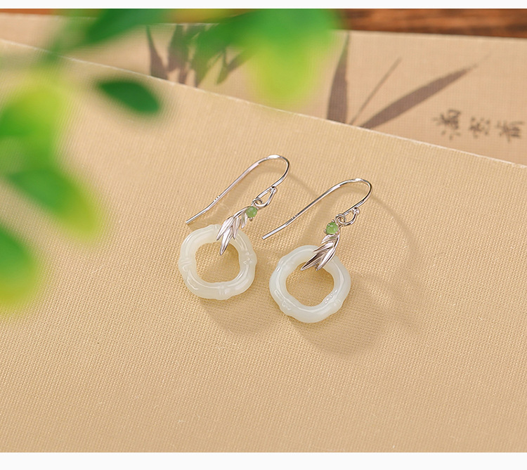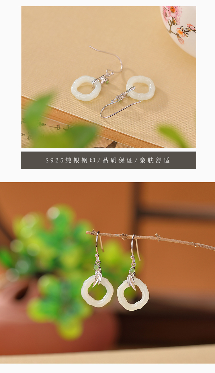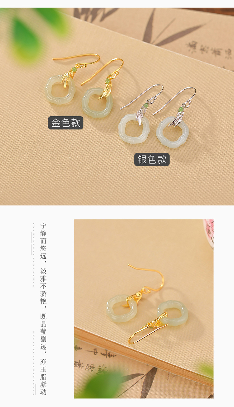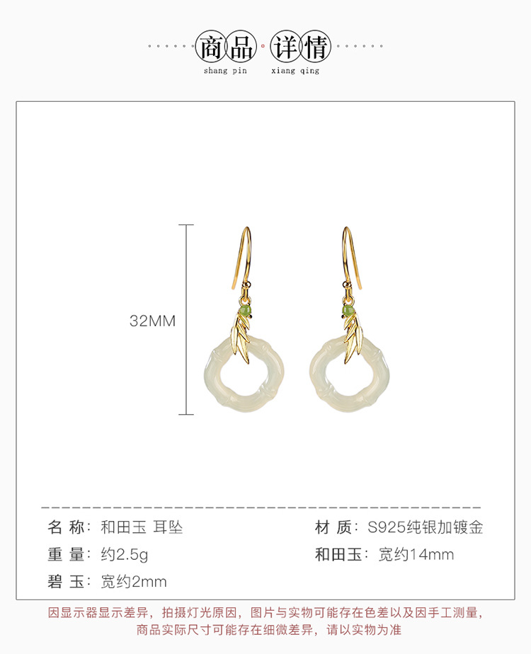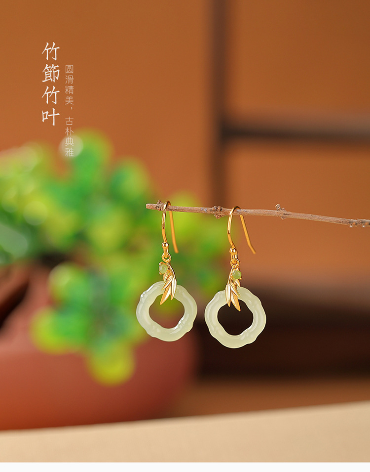 【玉竹明秀】S925银镀金和田玉碧玉竹节竹叶菱形镂空耳坠【CW-EG01907】