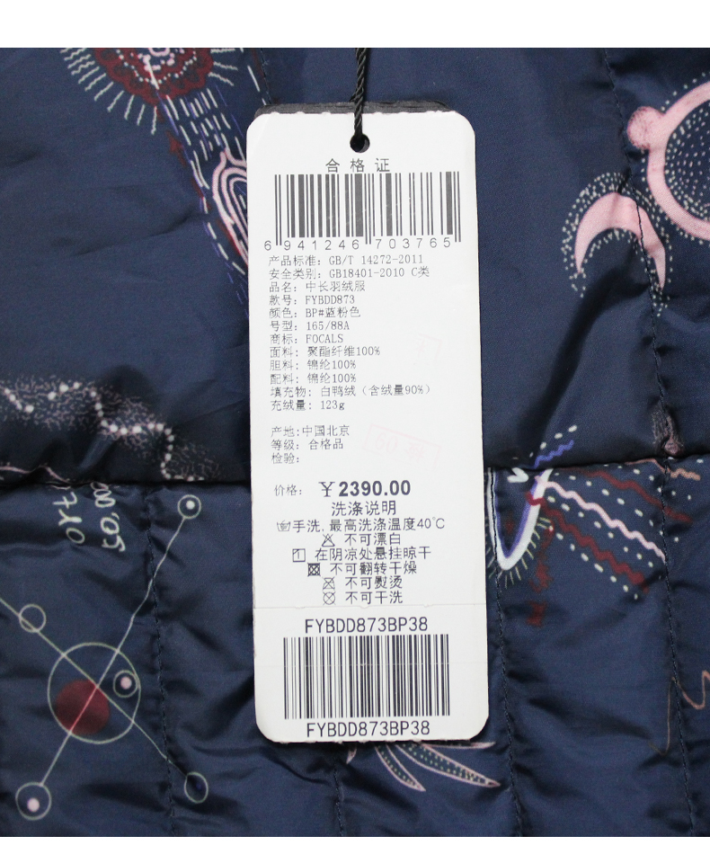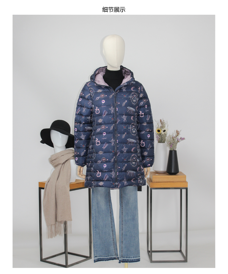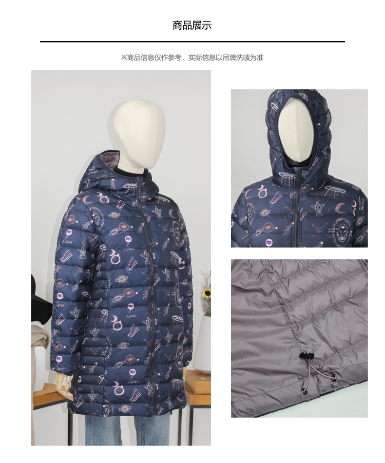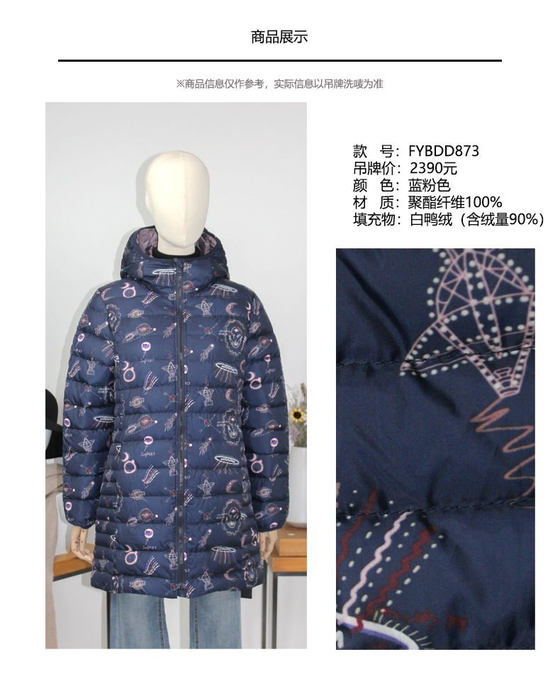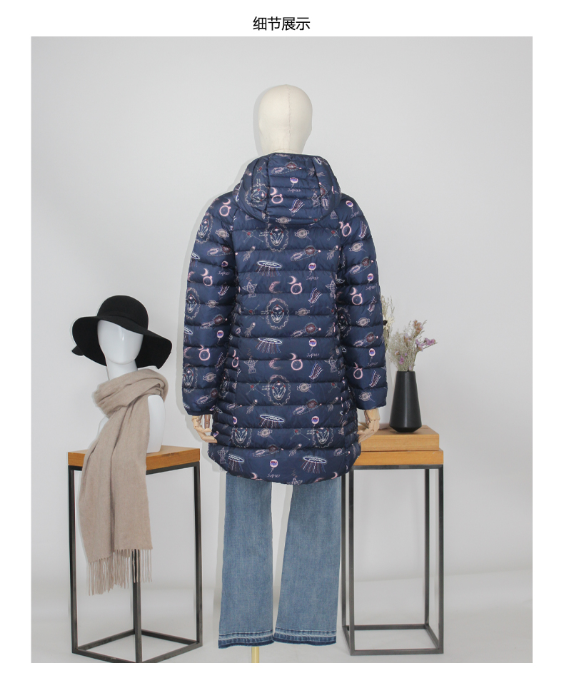 FOCALS福柯斯女装冬季新款印花休闲连帽中长款羽绒服FYBDD873BP