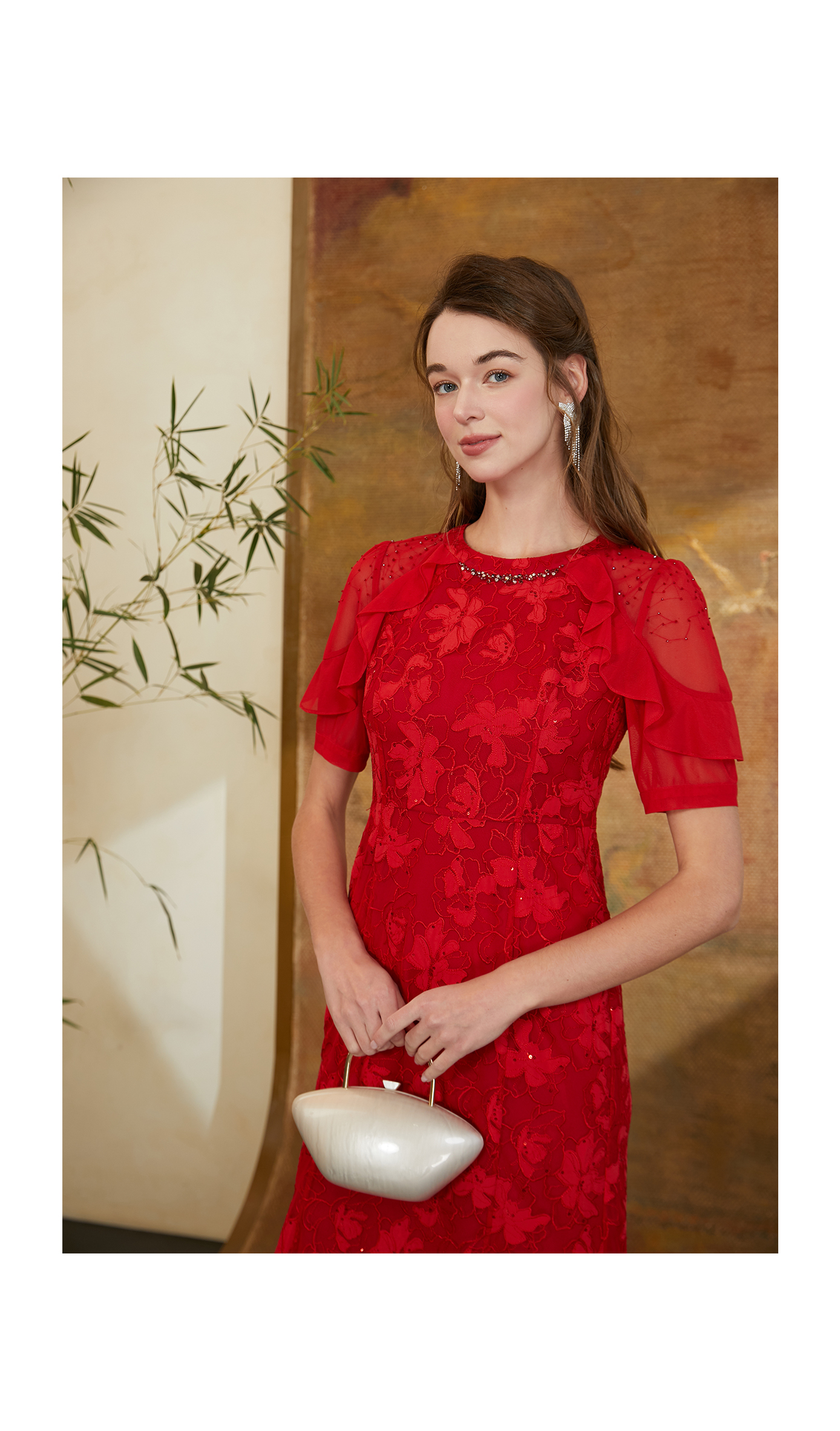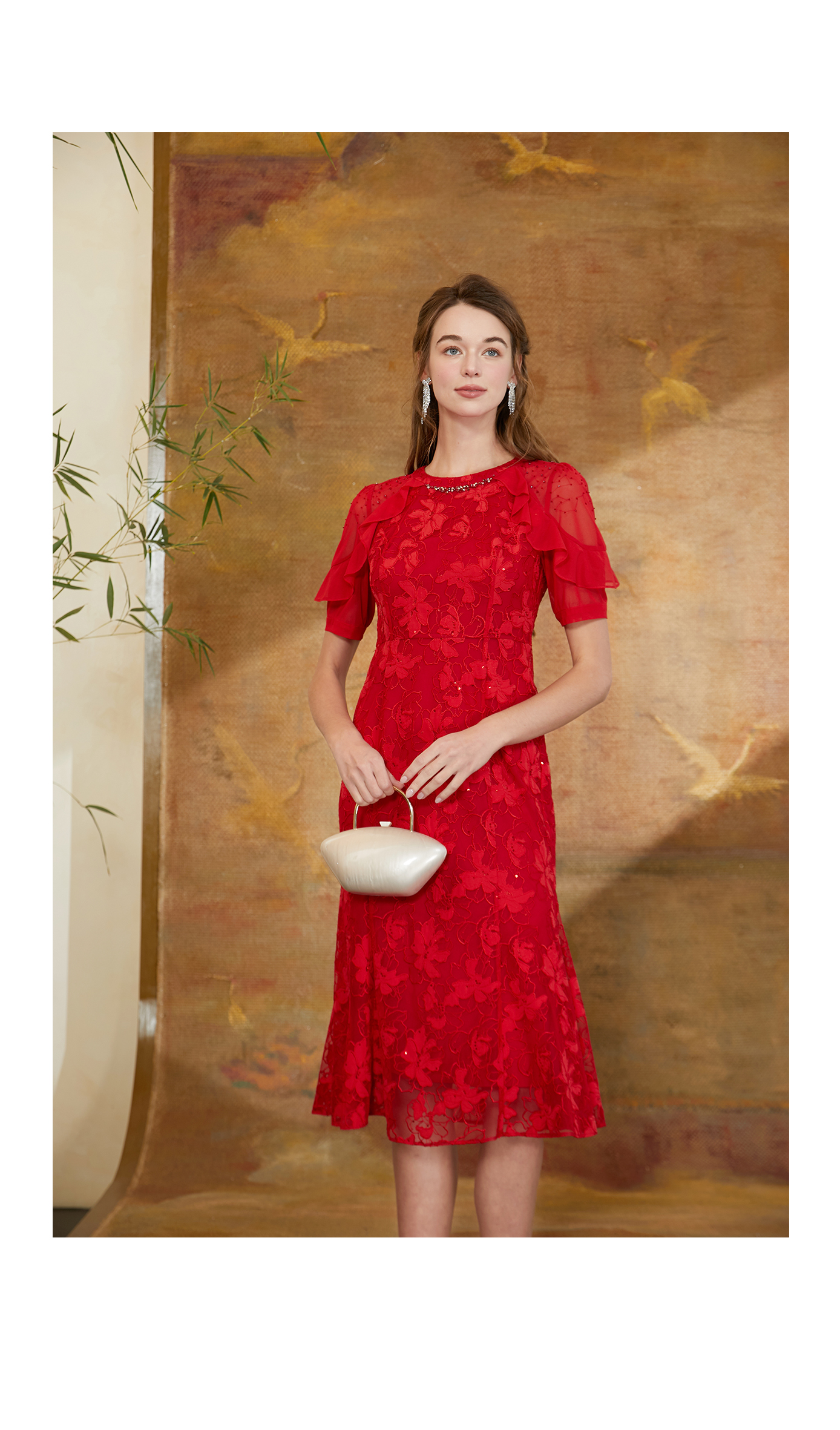 司歌蕾丝收腰鱼尾裙连衣裙喜庆红裙短袖A911047X