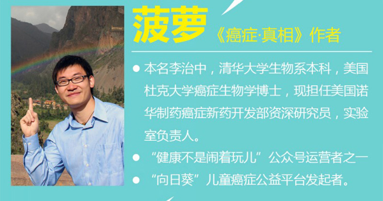 菠萝,本名李治中,清华大学生物系本科,美国杜克大学癌症生物学博士,跨国**制药公司癌症新药开发部资深研究员,实验室负责人。爱好科普、科研和公益事业。“健康不是闹着玩儿”公众号运营者之一,“向日葵”儿童癌症公益平台发起者。个人微信公号“菠萝因子”。